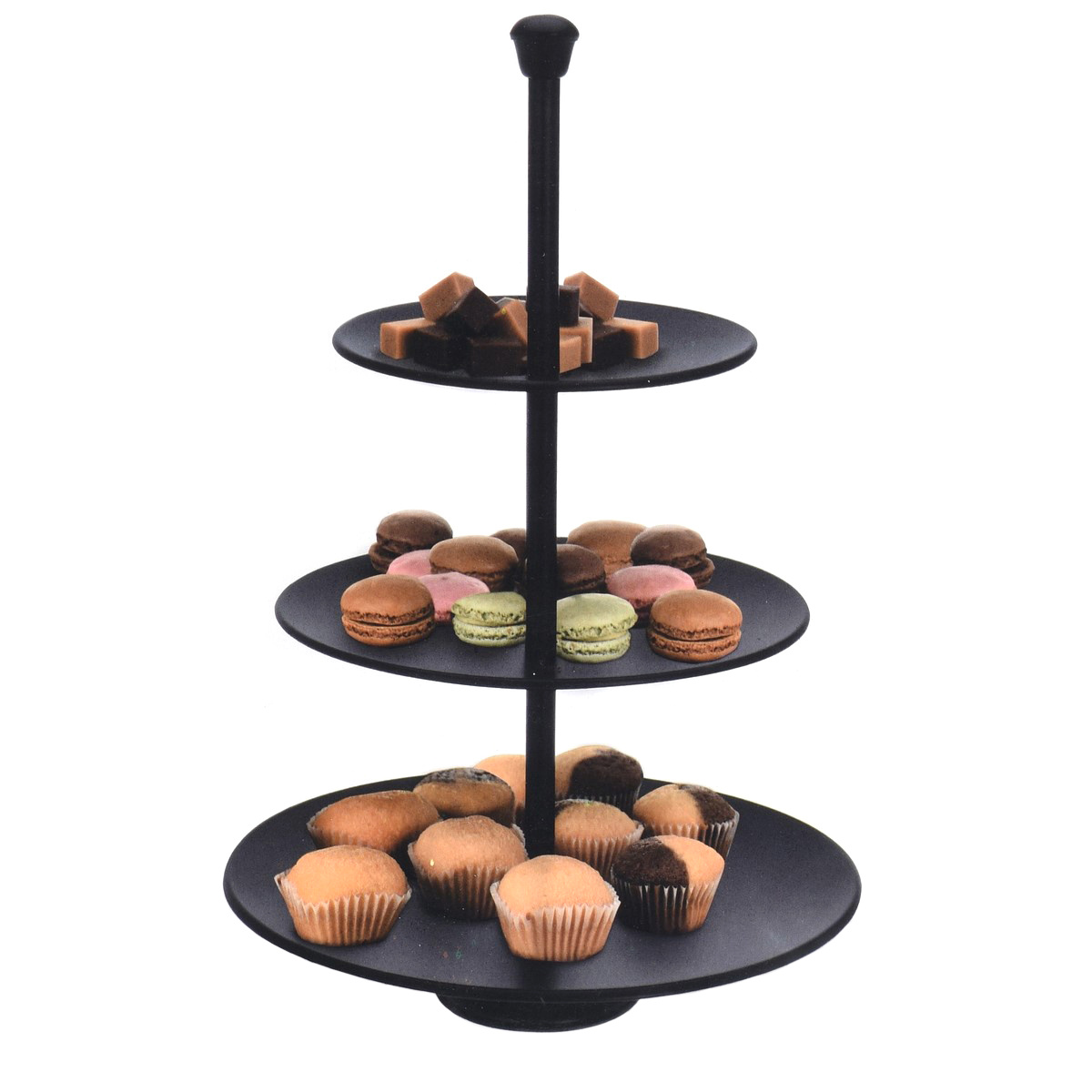 Luxusný nehrdzavejúci 3-poschodový servírovací stojan využijete nielen na servírovanie cukroviniek a zákuskov, ale aj ovocia a drobného slaného pečiva. Stojan v čiernom prevedení zaujme na prvý pohľad. Vhodný do každého interiéru, kde skvele doladí prestretý stôl a ušetrí miesto. Priemery jednotlivých plat: 25, 20,5, 16 cm