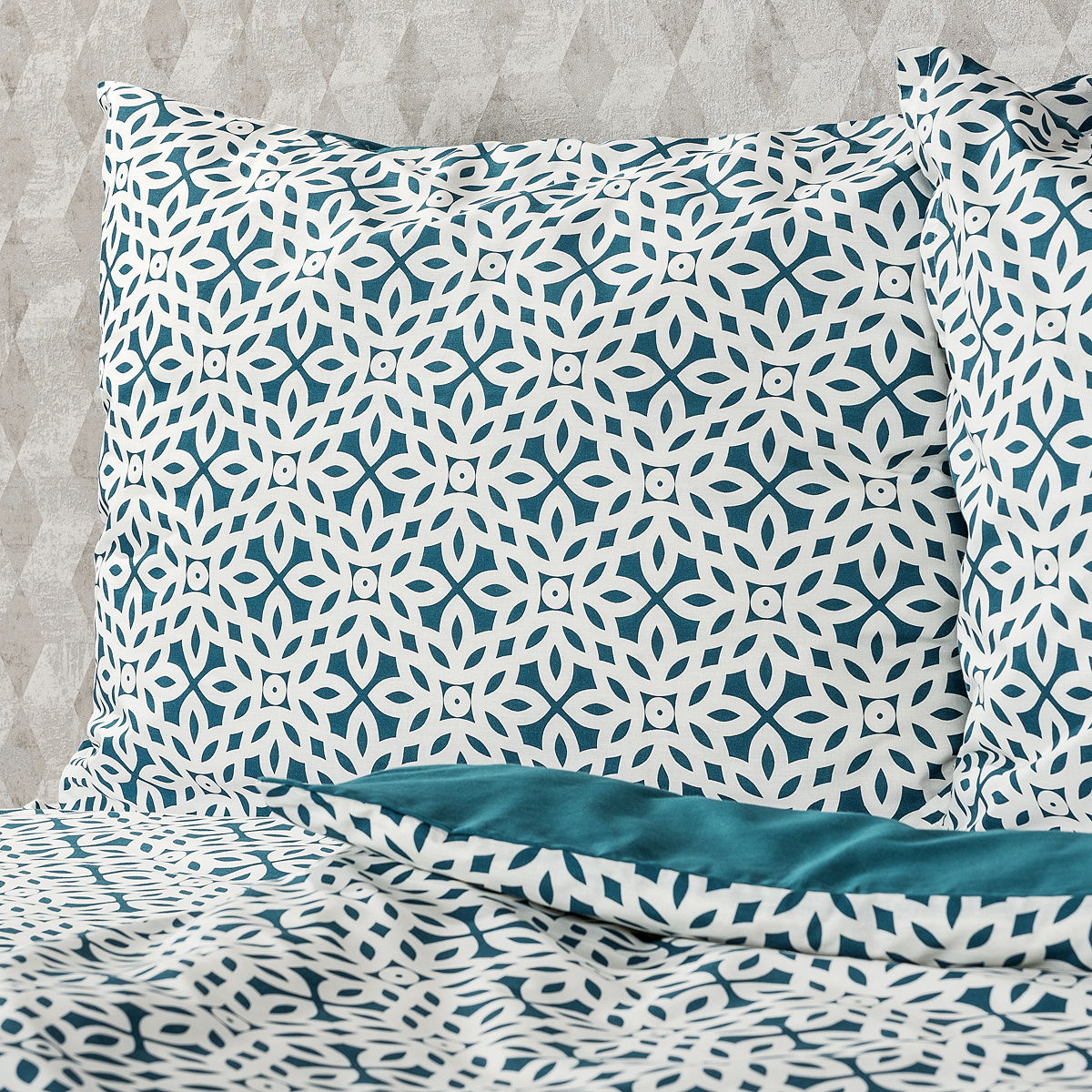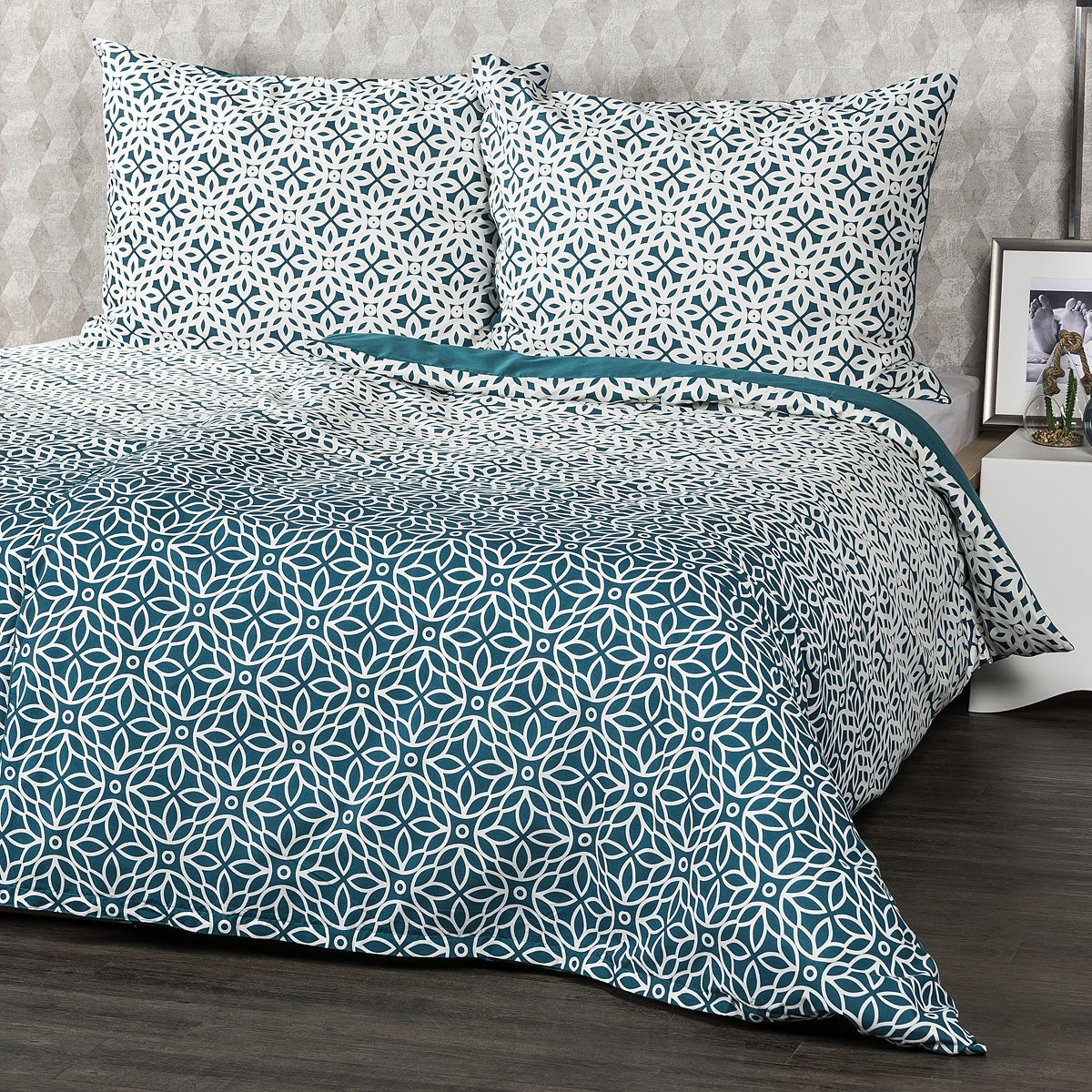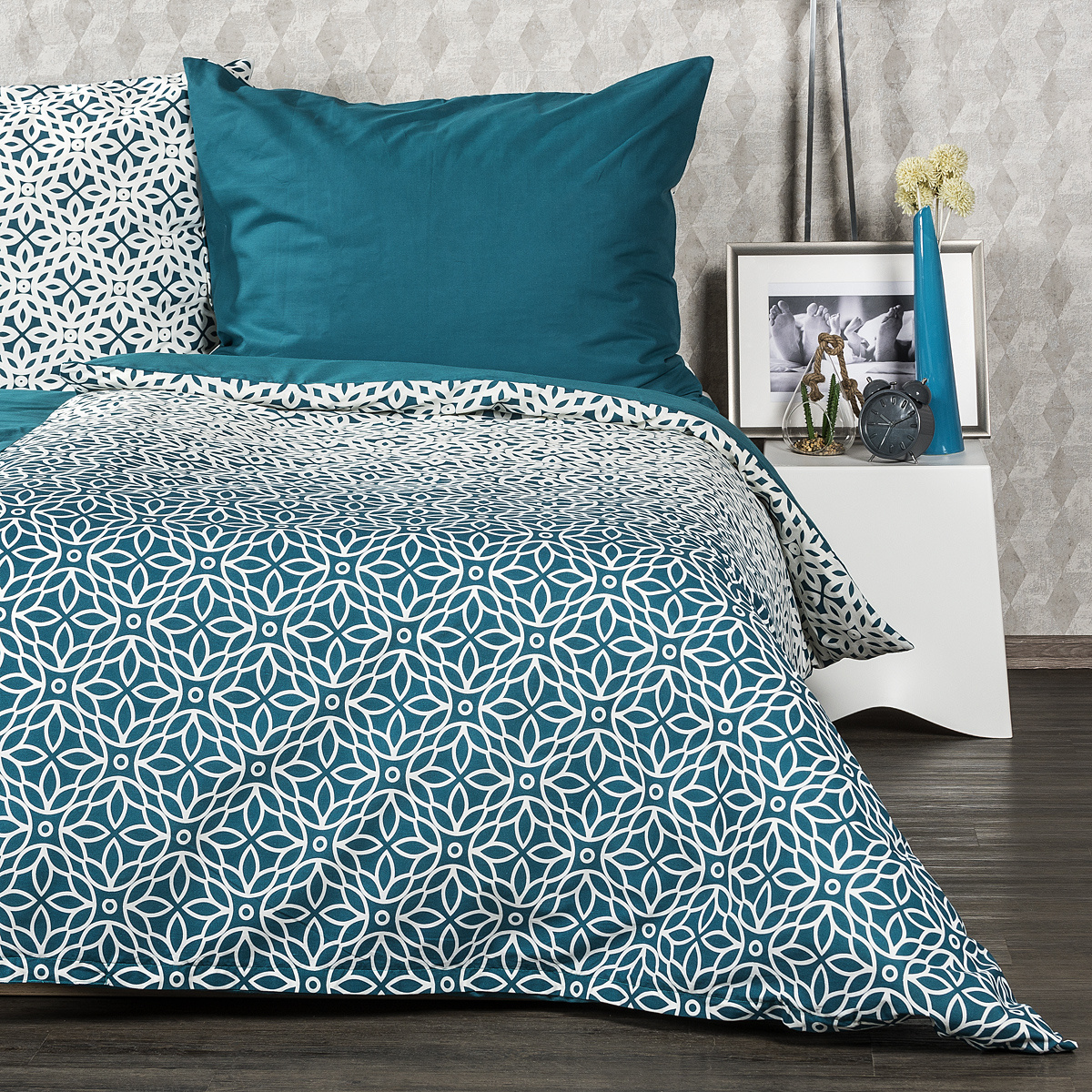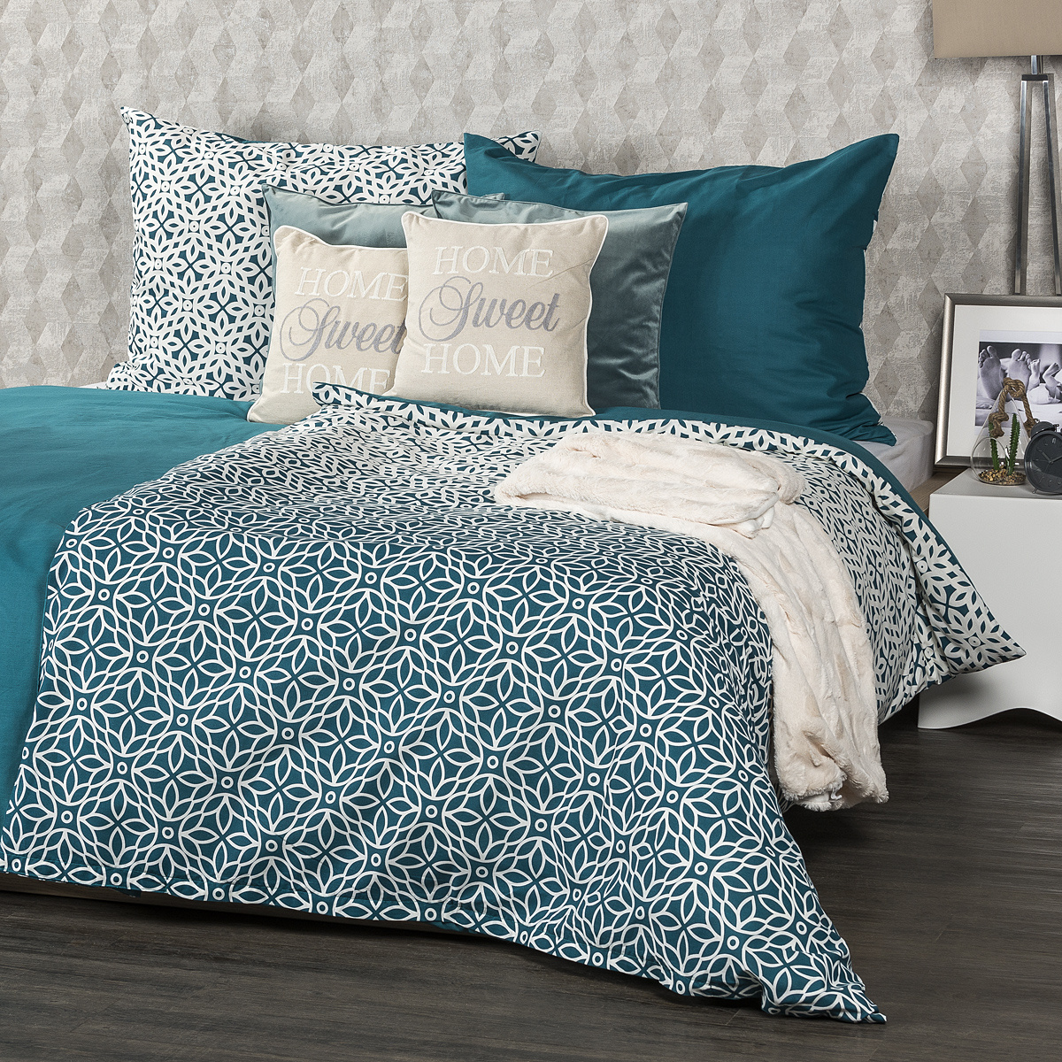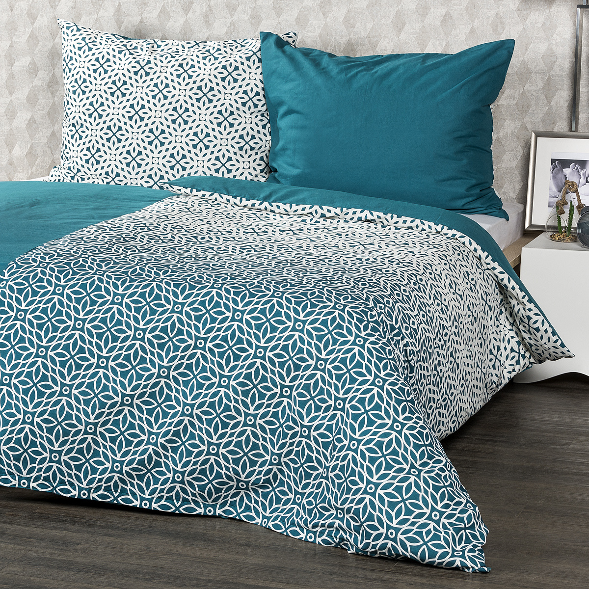 Elegantné obliečky z hebkého mikrovlákna pre štýlovú spálňu. Obľúbená petrolejová farba s bielym geometrickým vzorom zaručene zaujme na prvý pohľad a vyladí váš interiér do moderného štýlu. Obliečky sú obojstranné – z jednej strany geometrický vzor, druhá je jednofarebná. Príjemný vzdušný materiál zaistí pohodlný spánok a maximálny komfort. Obliečky sú opatrené zapínaním na zips.