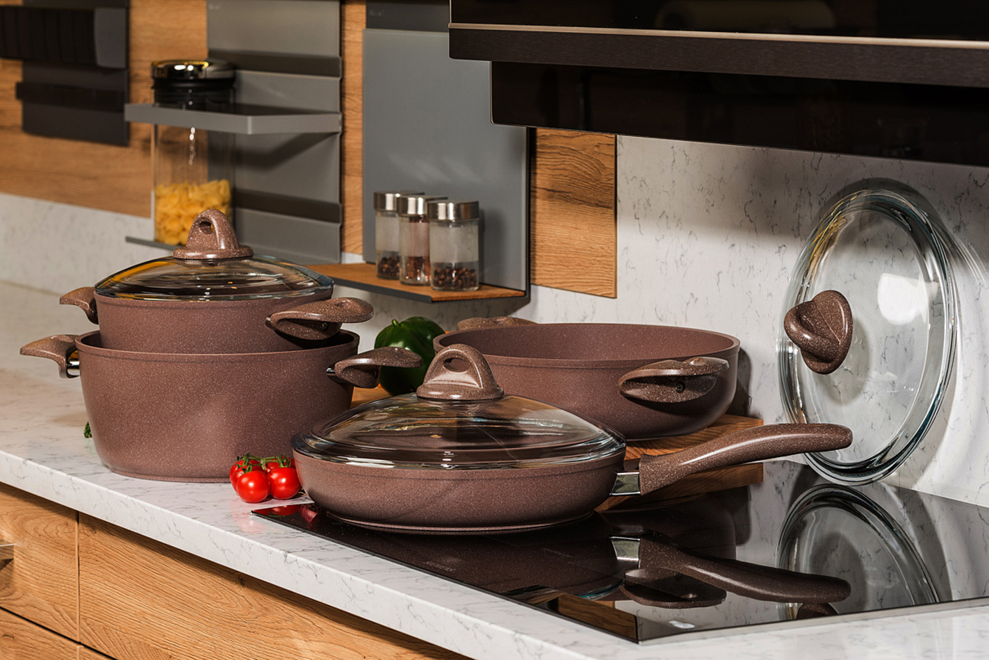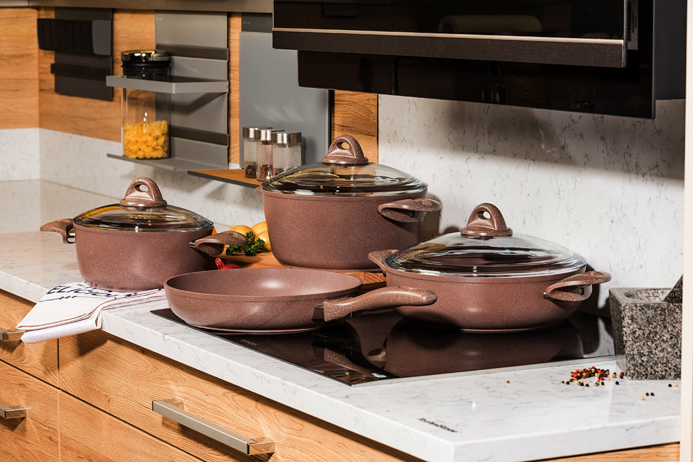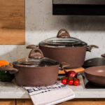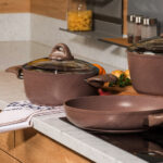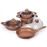 Doprajte svojmu vareniu dokonalý luxus a eleganciu s exkluzívnou sadou riadu Granite s mramorovým povrchom. Nepriľnavý mramorový povrch vám uľahčí každú prácu a je ideálny pre každodenné varenie. S touto sadou riadu pripravíte takmer bez námahy všetky druhy mäsa, ryby, zeleninu i polievky – skrátka čokoľvek si vaša rodina bude priať.Vďaka nepriľnavému povrchu môžete variť s minimálnou spotrebou tuku a bez toho, aby sa pokrm prichytil. Jedlo si navyše zachová výbornú chuť i vitamíny. 3-vrstvový mramorový povrch je vysoko odolný voči poškodeniu. Liaty hliník výborne pracuje s teplom, takže zaručí rovnomerné varenie i vyprážanie, navyše bez veľkých strát na energiách.Riad Granite sa môže pochváliť dokonale elegantným vzhľadom v príjemnom odtieni hnedej, vďaka ktorému oživí vašu kuchyňu. Na prvý pohľad masívny riad je veľmi ľahký do ruky a vďaka špeciálne tvarovaným tepelne izolovaným úchytom tiež veľmi pohodlný na manipuláciu. Jednotlivé kúsky riadu sú balené v špeciálnych ochranných vakoch, ktoré zaistia povrch voči poškodeniu.Sada obsahuje: