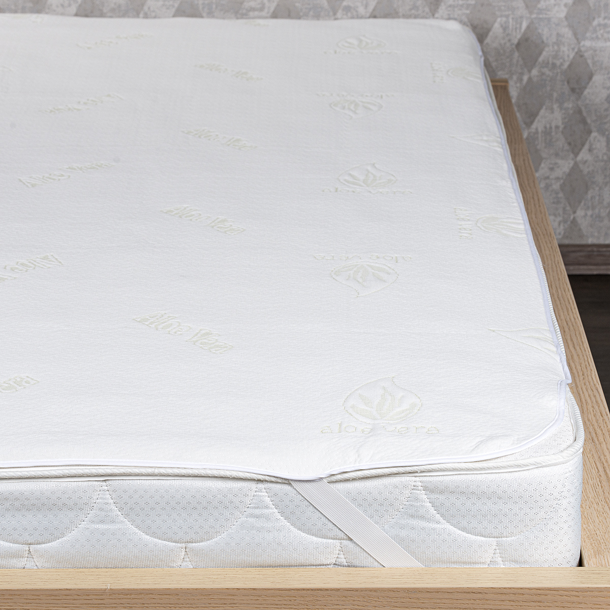 Skvelý pomocník pre zdravý spánok. Tento unikátny chránič matraca Aloe Vera prinesie vašej posteli dokonalú čistotu aj maximálne pohodlie. Je mäkký, priedušný a vďaka obsahu blahodarných výťažkov z Aloe Vera má pozitívne účinky na zdravie (najmä pokožku), pomáha upokojeniu a relaxácii, a navyše sa môže pochváliť antibakteriálnymi vlastnosťami. Pravidelné používanie chrániča predlžuje životnosť vášho matraca a zabraňuje prenikaniu potu aj špiny do matraca, zaručí tak dokonalú hygienu vášho lôžka. Chránič matraca ľahko zvlečiete a vyperiete, takže údržba je takmer bez práce.V rohoch chrániča sú praktické gumy pre jednoduché uchytenie k matracu – zostane tak vždy na svojom mieste. Je vhodný na matrace s maximálnou výškou 30 cm.Chránič matraca je opatrený certifikátom Öko-Tex Standard 100.