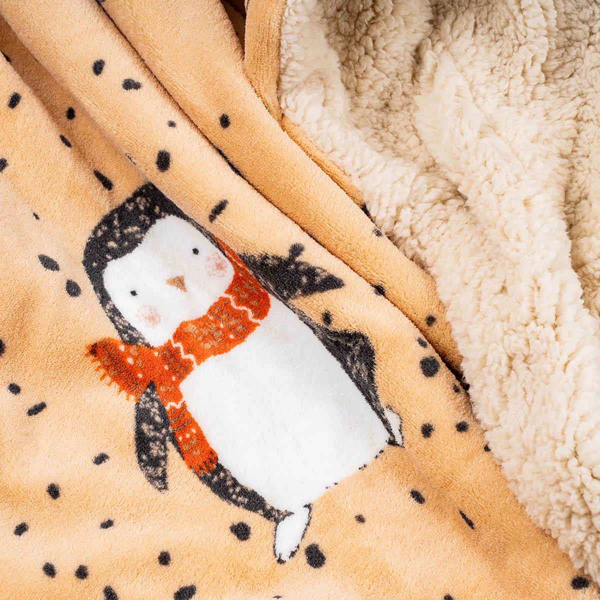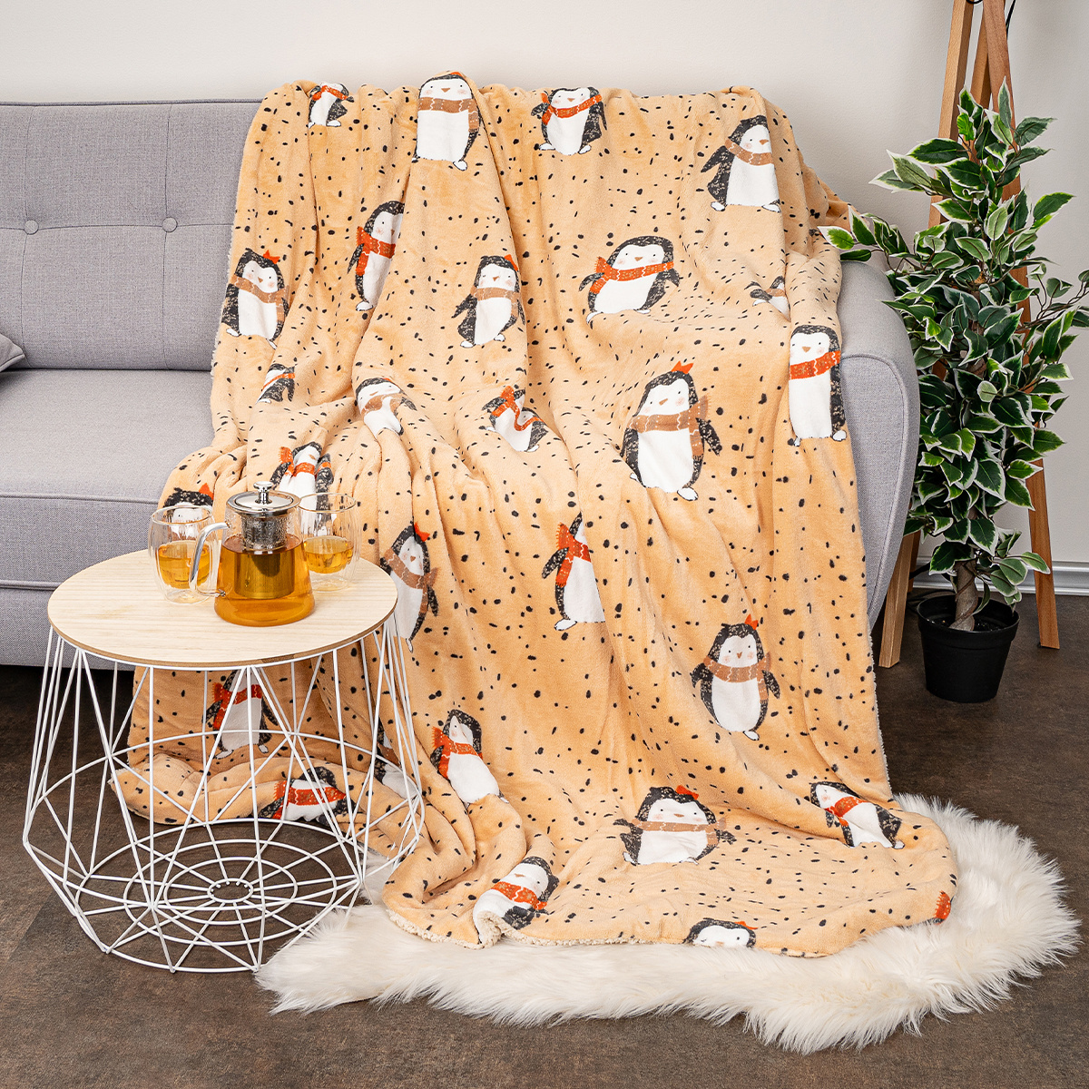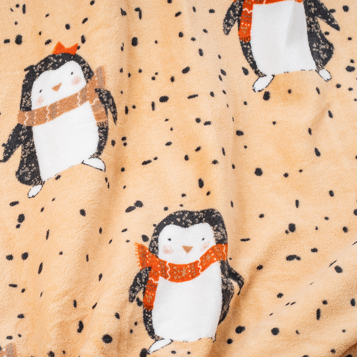 Táto baránková deka Penguin od našej vlastnej značky 4Home sa stane obľúbeným spoločníkom pre všetkých, ktorí milujú pohodlie a hravé motívy. Vďaka rozmeru 150 x 200 cm poskytuje dostatok priestoru pre pohodlné zababušenie dospelých i detí. Deka je obojstranná – z jednej strany vás zahreje jemný a mäkký baránok, z druhej vás poteší veselý motív tučniakov s vianočnými šálami, ktorý vnesie do každej miestnosti radosť a zábavu. Kvalitný 100% polyester zaisťuje, že deka zostane dlho mäkká, hrejivá a nenáročná na údržbu.Vďaka svojmu roztomilému vzhľadu sa skvele hodí do detskej izby, ale aj ako štýlový doplnok do obývačky. Je tiež ideálnym tipom na vianočný darček, ktorý zahreje nielen svojou funkčnosťou, ale aj dizajnom plným zimnej pohody. Užite si dlhé zimné večery v komforte a teple tejto veselej deky.Hlavné výhody produktu: