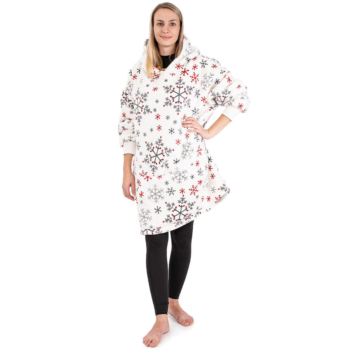 Baránková mikina Snowflakes našej vlastnej značky 4Home prináša dokonalú kombináciu pohodlia a štýlu pre chladné zimné dni. Je vyrobená zo 100% mikroplyšu s baránkovou podšívkou, ktorá zaisťuje maximálne teplo a mäkkosť. Vďaka svojmu elegantnému bielemu dizajnu s motívom snehových vločiek v sivej a červenej farbe je ideálnym doplnkom pre odpočinok doma pri krbe alebo vianočné rozprávky.Vďaka priestrannej kapucni a veľkému klokaniem vrecku si môžete ľahko ohriať ruky alebo uschovať drobnosti, ktoré chcete mať neustále po ruke. Rukávy zakončené elastickými manžetami zabraňujú prefúknutiu a zaisťujú, že mikina skvele sedí. Bude skvelým vianočným darčekom pre každého, kto si rád užíva pohodlie, aj keď je za oknami snehová fujavice.Hlavné výhody produktu: