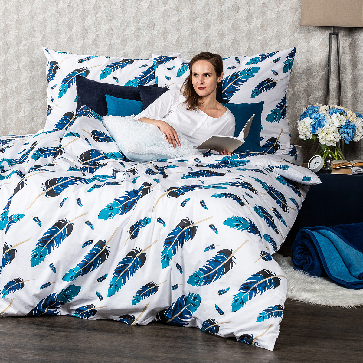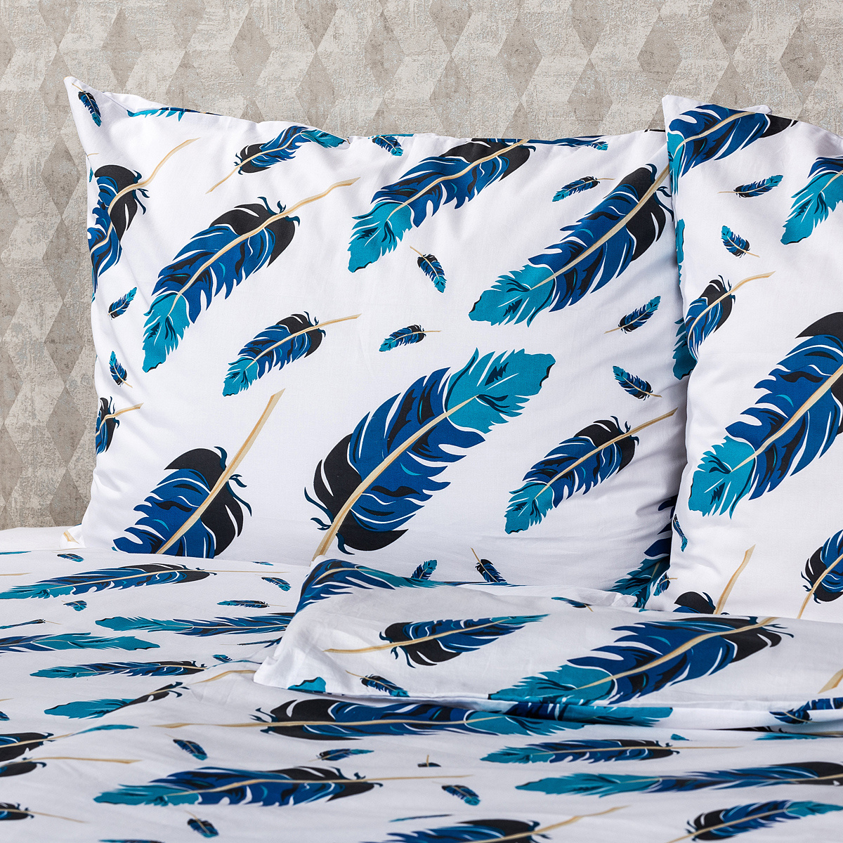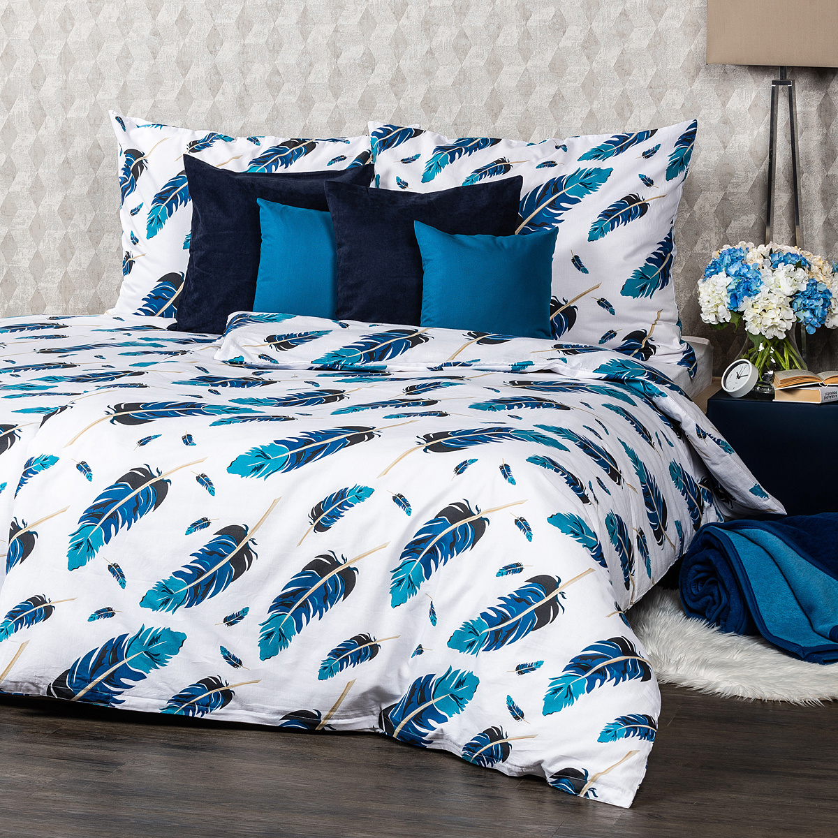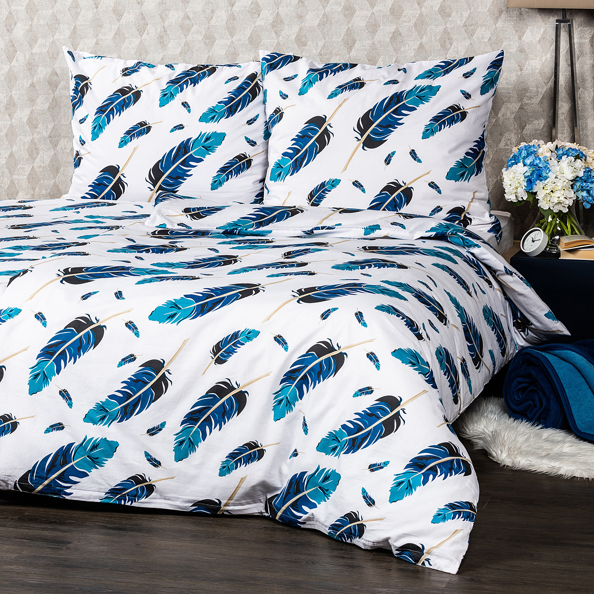 Jednoduché, elegantné, mystické. Ako pohladením pierka vás ukolíšu k spánku originálne bavlnené obliečky v ukľudňujúcej farebnej kombinácii. Motív pierok v modrých odtieňoch na kontrastnom bielom podklade pôsobí jemne i vzdušne, dodá tak vašej spálni jednoduchý a osobitý štýl.Obliečky sú vyrobené z kvalitnej 100% bavlny, ktorá zaručí príjemné zaspávanie. Vzor je z oboch strán rovnaký. Pohodlné zapínanie na zips.Súprava obsahuje: