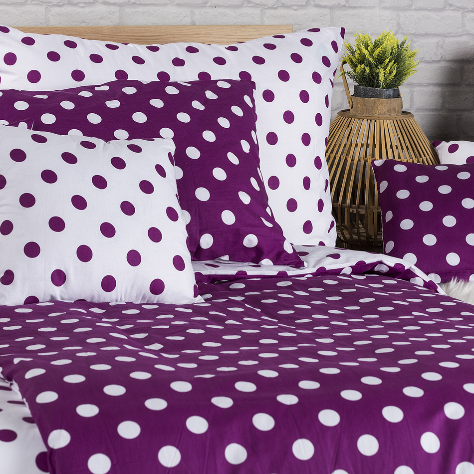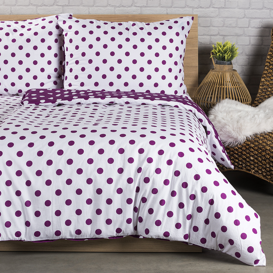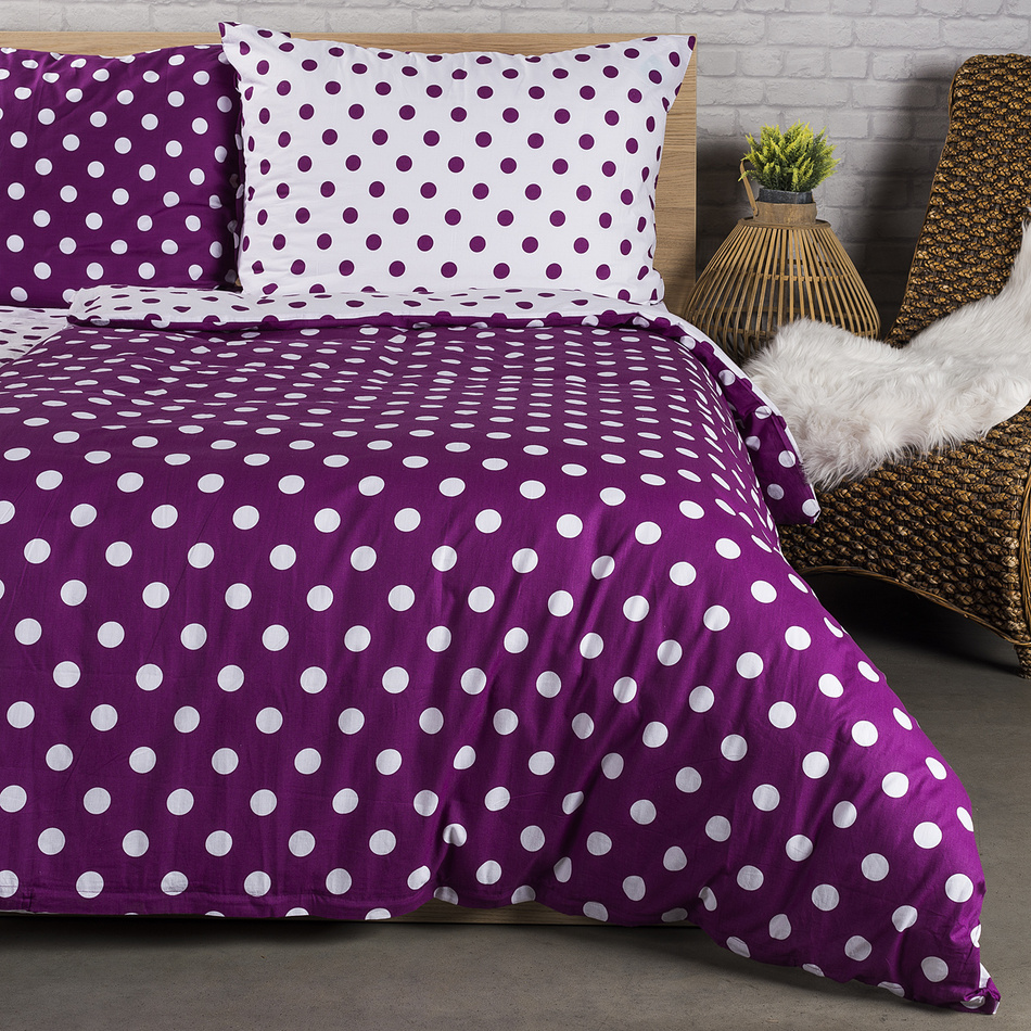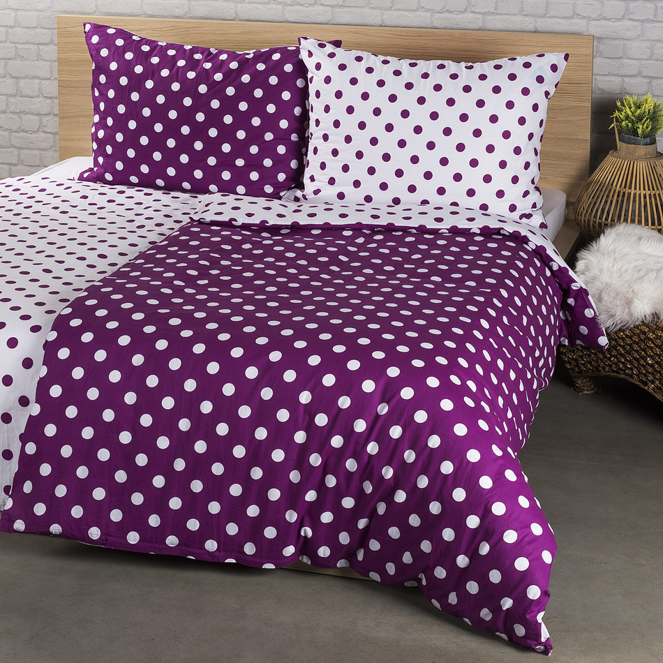 Ukážte svoje hravé ja a oživte svoju spálňu bodkami! Obľúbená kombinácia fialovej a bielej dodá mladistvý nádych každej spálni. Doprajte si spokojné zaspávanie a veselé rána vďaka štýlovým bodkovaným obliečkam z jemnej a kvalitnej 100% bavlny.