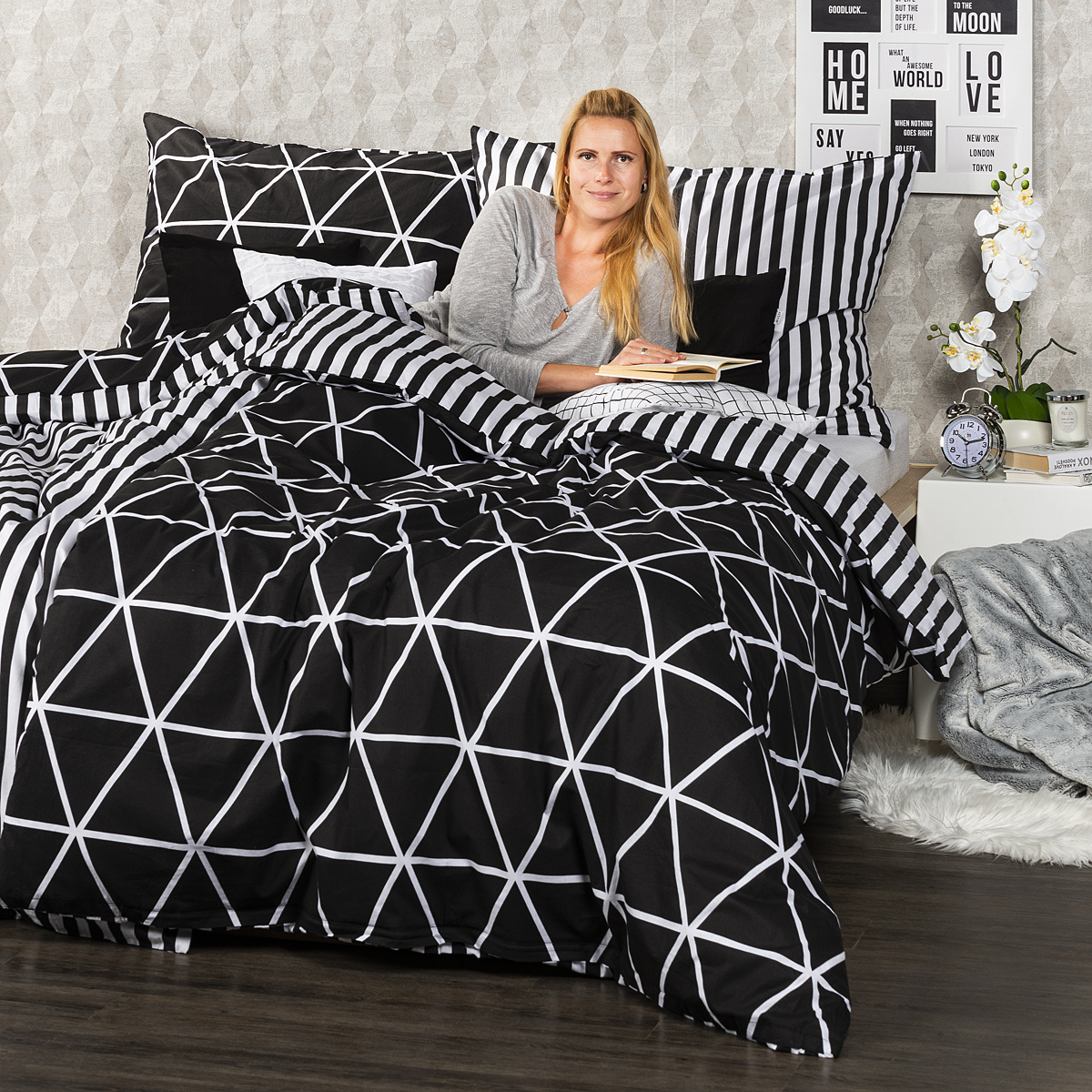 V jednoduchosti je krása a pre miestnosť slúžiacu k relaxácii to platí dvojnásobne. Štýlové bavlnené obliečky Galaxy potešia všetkých milovníkov jednoduchých vzorov. Tradičné spojenie čiernobielej farebnosti a čistých línií dodá vašej spálni moderný a pútavý štýl. Mäkká a pohodlná 100% bavlna zaistí príjemný spánok.Obliečky súe navyše obojstranné – z jednej strany klasické jemné prúžky, z druhej decentný geometrický vzor v tvare trojuholníkov – môžete ich teda ľubovoľne kombinovať a meniť svoju posteľ každý deň. Pre maximálne pohodlie majú obliečky praktické zapínanie na zips.Súprava obsahuje:
