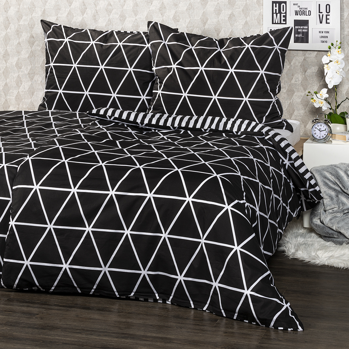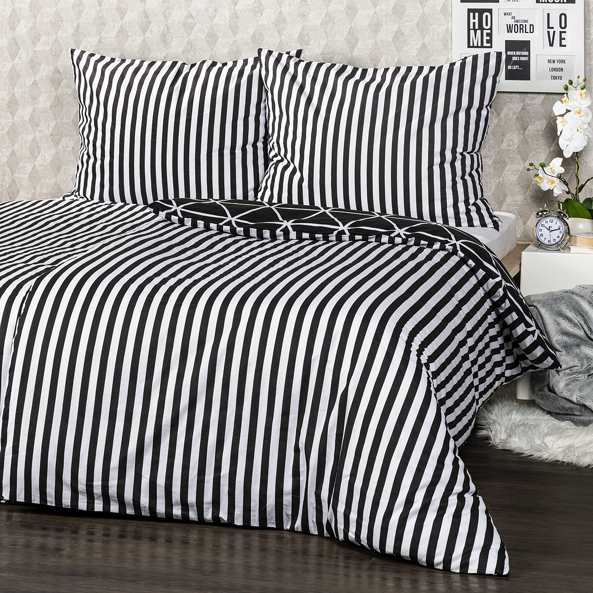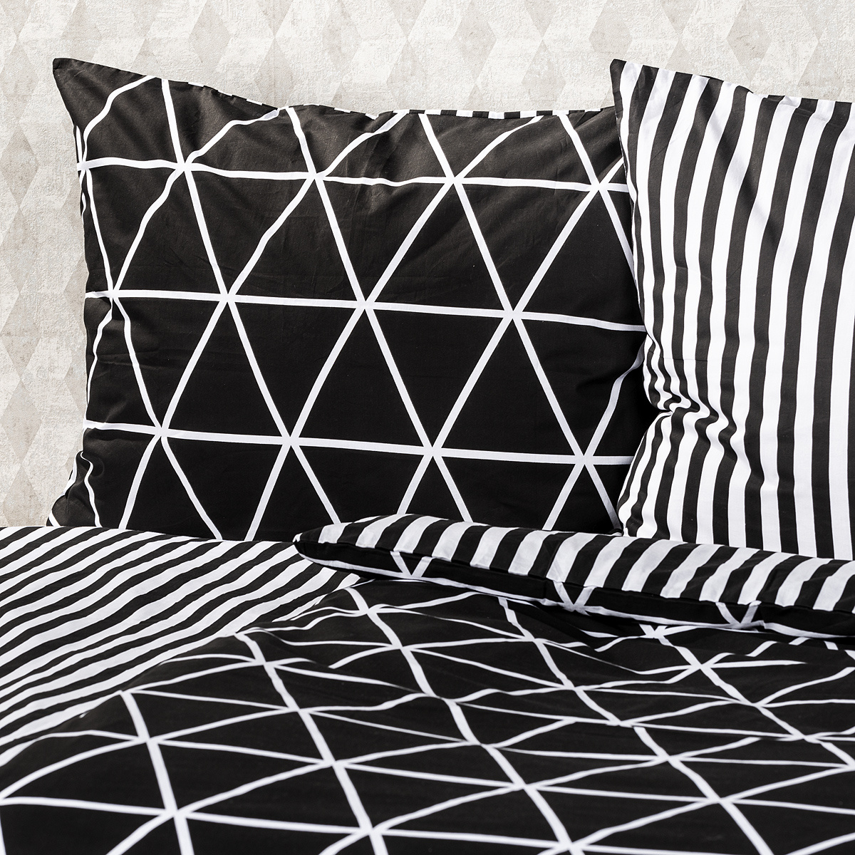 V jednoduchosti je krása a pre miestnosť slúžiacu k relaxácii to platí dvojnásobne. Štýlové bavlnené obliečky Galaxy potešia všetkých milovníkov jednoduchých vzorov. Tradičné spojenie čiernobielej farebnosti a čistých línií dodá vašej spálni moderný a pútavý štýl. Mäkká a pohodlná 100% bavlna zaistí príjemný spánok.Obliečky súe navyše obojstranné – z jednej strany klasické jemné prúžky, z druhej decentný geometrický vzor v tvare trojuholníkov – môžete ich teda ľubovoľne kombinovať a meniť svoju posteľ každý deň. Pre maximálne pohodlie majú obliečky praktické zapínanie na zips.Súprava obsahuje: