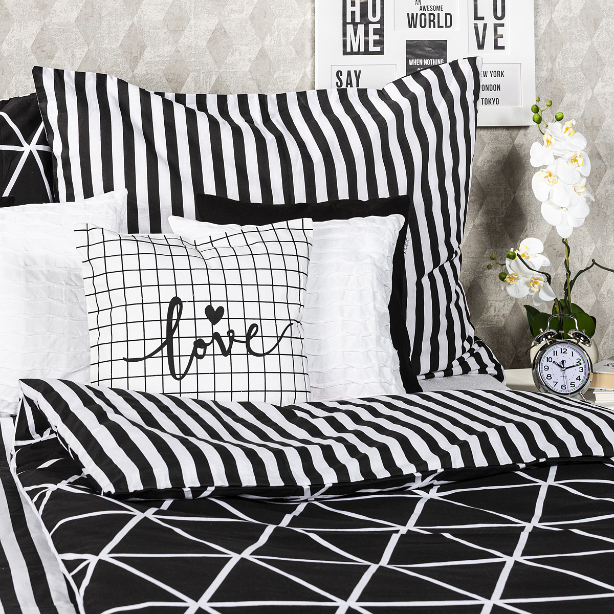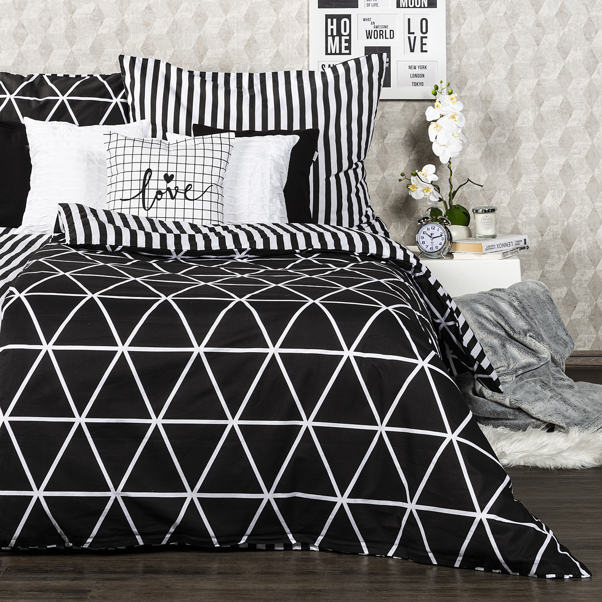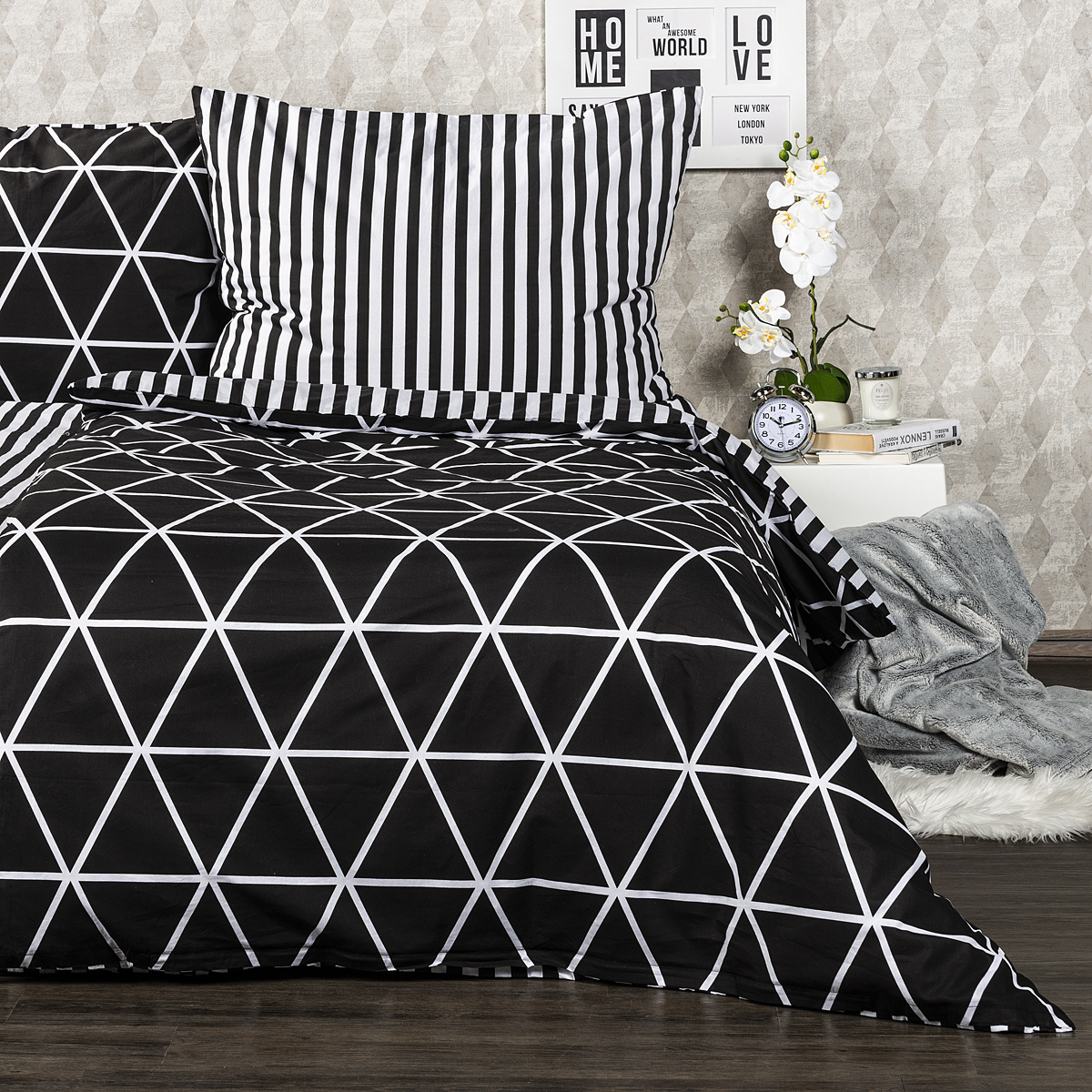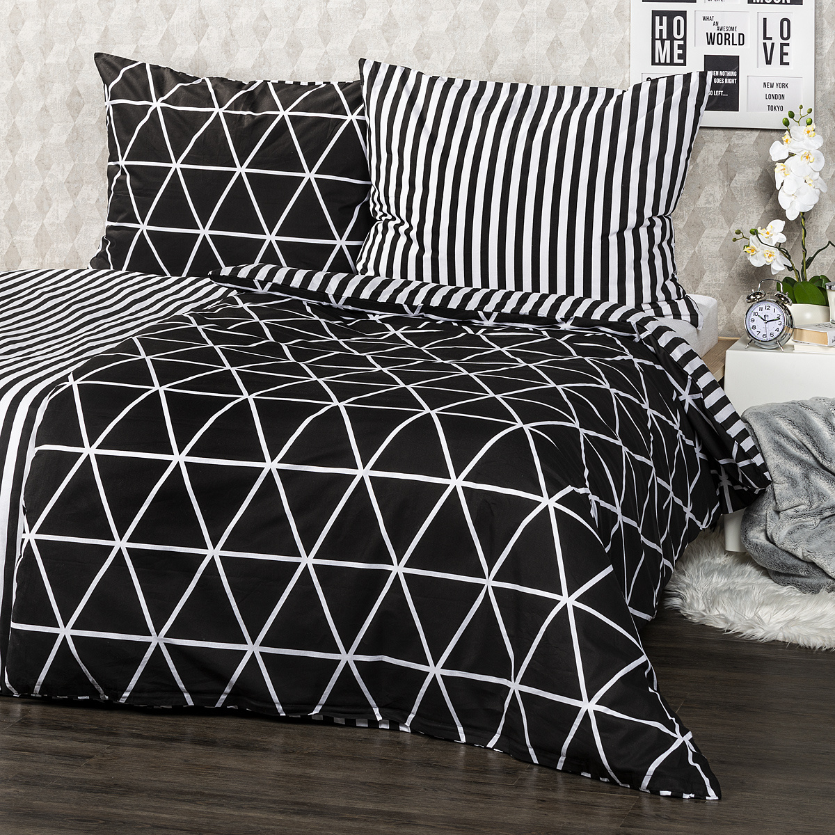 V jednoduchosti je krása a pre miestnosť slúžiacu k relaxácii to platí dvojnásobne. Štýlové bavlnené obliečky Galaxy potešia všetkých milovníkov jednoduchých vzorov. Tradičné spojenie čiernobielej farebnosti a čistých línií dodá vašej spálni moderný a pútavý štýl. Mäkká a pohodlná 100% bavlna zaistí príjemný spánok.Obliečky súe navyše obojstranné – z jednej strany klasické jemné prúžky, z druhej decentný geometrický vzor v tvare trojuholníkov – môžete ich teda ľubovoľne kombinovať a meniť svoju posteľ každý deň. Pre maximálne pohodlie majú obliečky praktické zapínanie na zips.Súprava obsahuje: