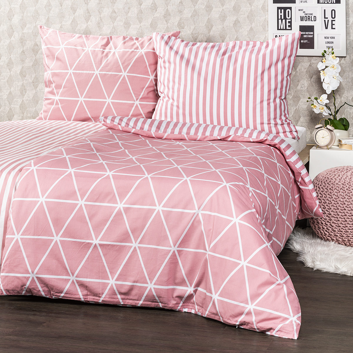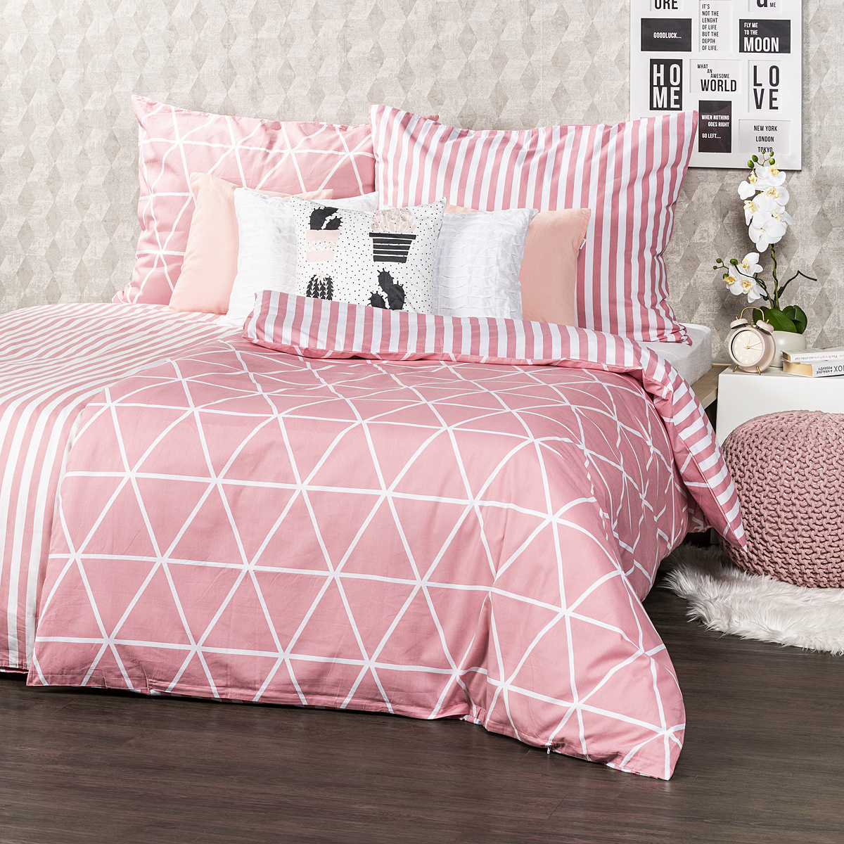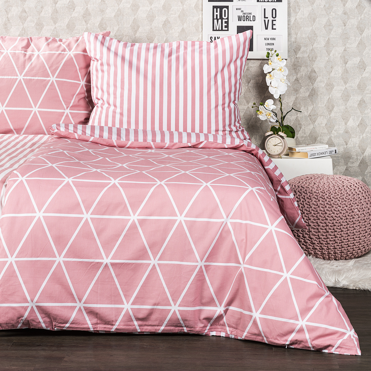 V jednoduchosti je krása a pro místnost sloužící k relaxaci to platí dvojnásob. Stylové bavlněné povlečení Galaxy potěší všechny milovníky jednoduchých vzorů. Uklidňující spojení růžové a bílé s čistými liniemi dodá vaší ložnici moderní a poutavý styl. Měkká a pohodlná 100% bavlna zajistí příjemný spánek. Povlečení je navíc oboustranné – z jedné strany klasické jemné proužky, z druhé jednoduchý geometrický vzor ve tvaru trojúhelníků – můžete ho tedy libovolně kombinovat a měnit svou postel každý den. Pro maximální pohodlí má povlečení praktické zapínání na zip. Souprava obsahuje: