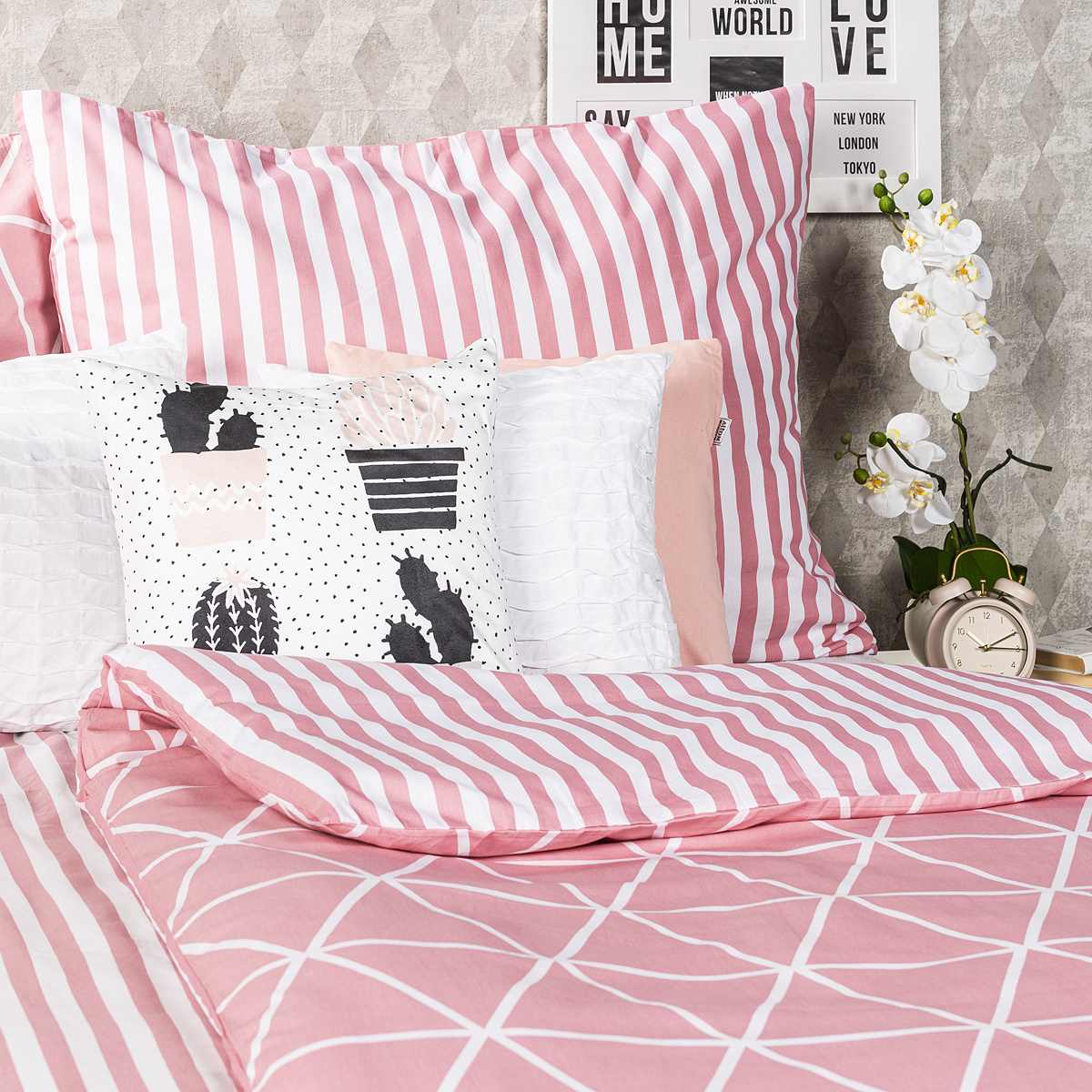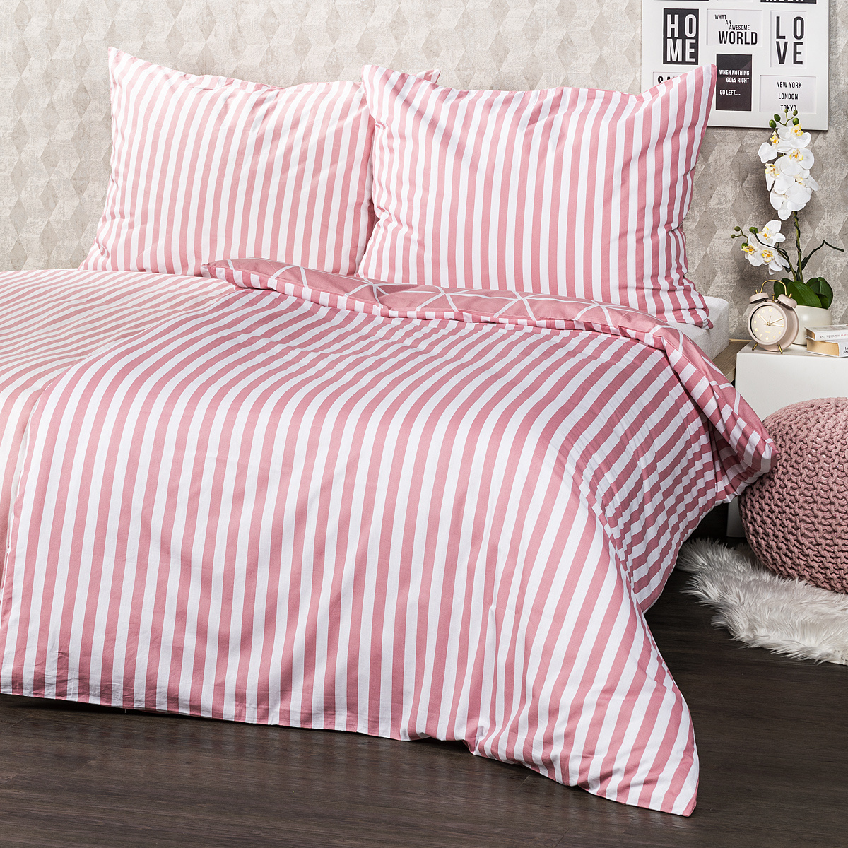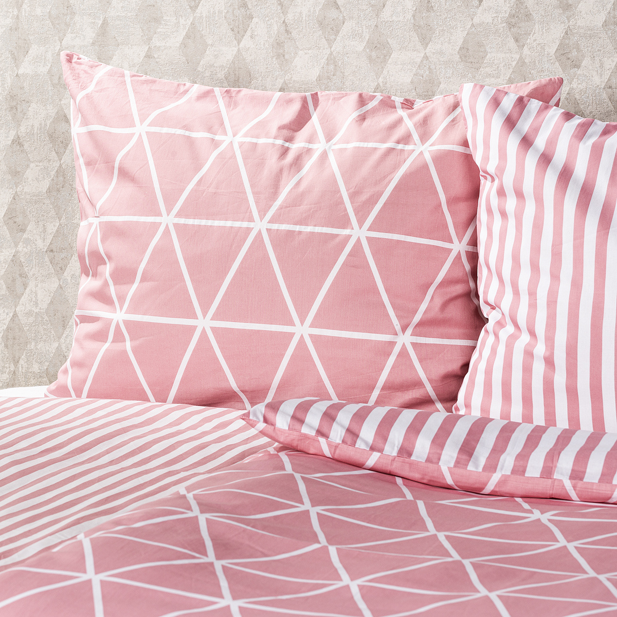 V jednoduchosti je krása a pro místnost sloužící k relaxaci to platí dvojnásob. Stylové bavlněné povlečení Galaxy potěší všechny milovníky jednoduchých vzorů. Uklidňující spojení růžové a bílé s čistými liniemi dodá vaší ložnici moderní a poutavý styl. Měkká a pohodlná 100% bavlna zajistí příjemný spánek. Povlečení je navíc oboustranné – z jedné strany klasické jemné proužky, z druhé jednoduchý geometrický vzor ve tvaru trojúhelníků – můžete ho tedy libovolně kombinovat a měnit svou postel každý den. Pro maximální pohodlí má povlečení praktické zapínání na zip. Souprava obsahuje: