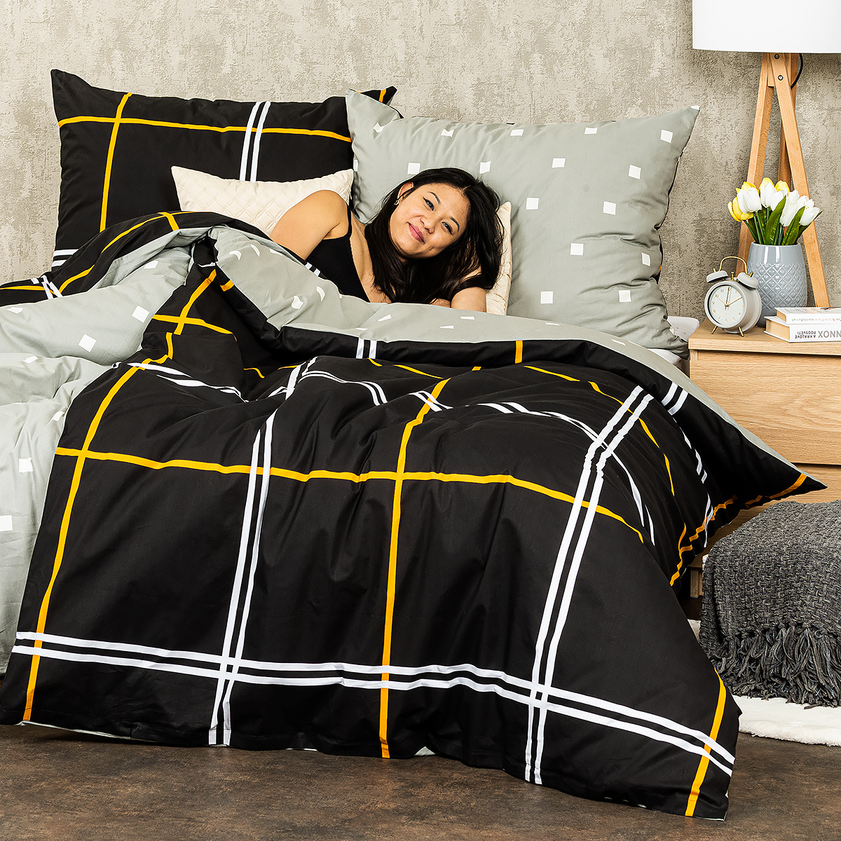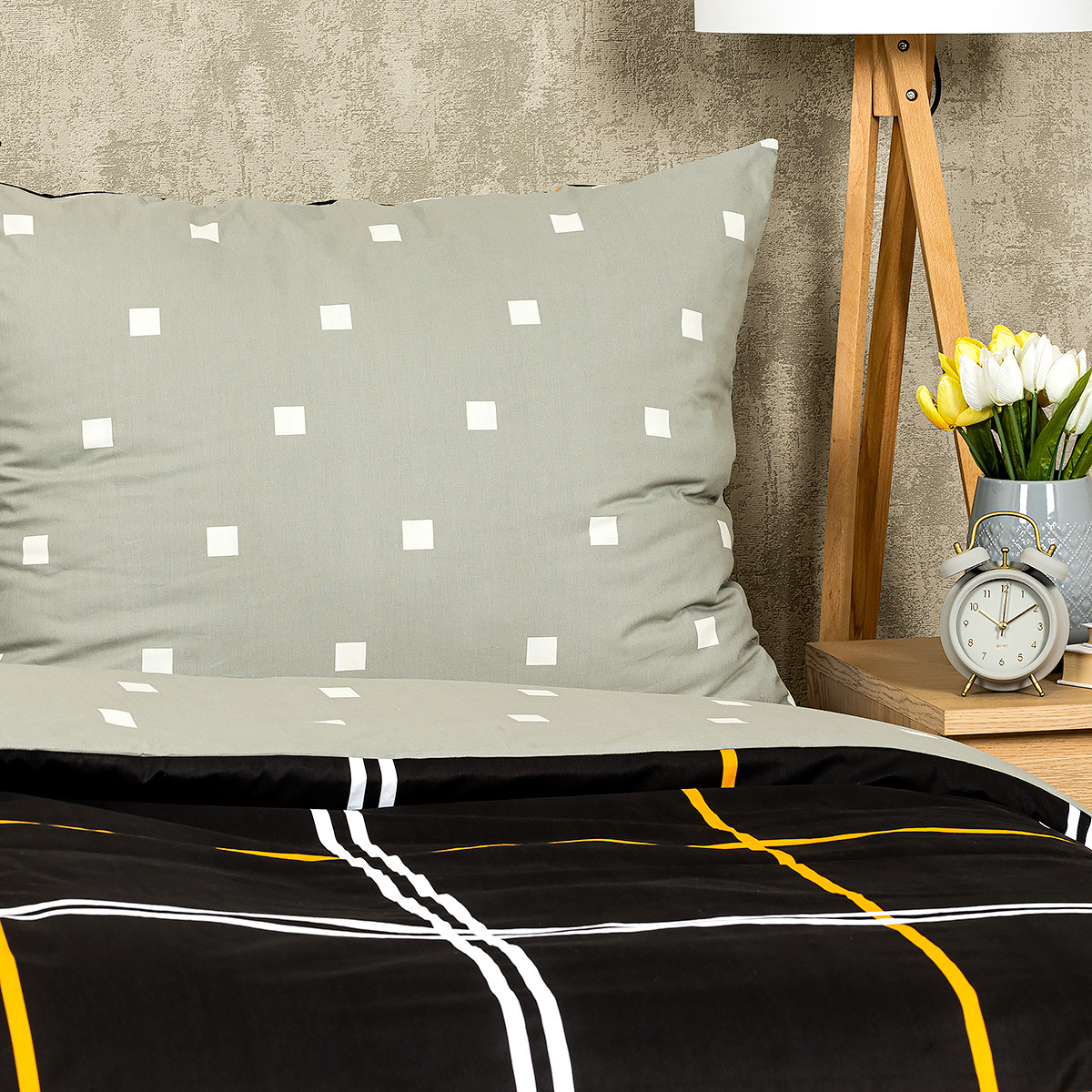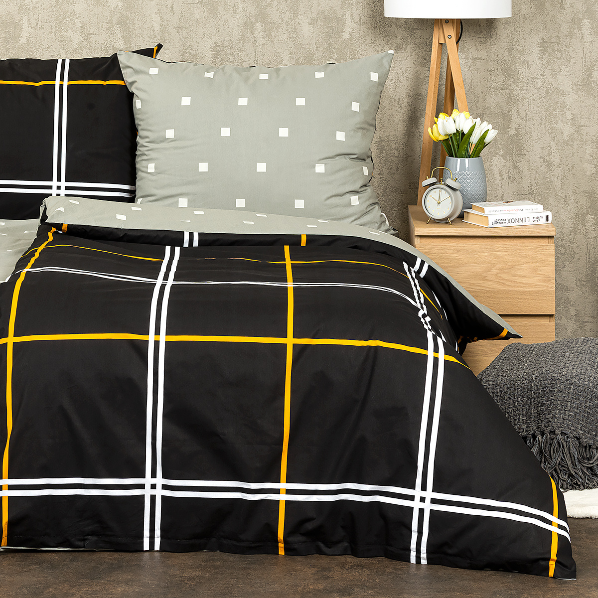 Obľúbený kockovaný vzor v elegantnej kombinácii sivej a čiernej dodá eleganciu vašej spálnie. Tlmené farby a triezvy grafický vzor bude to pravé orechové aj do čisto pánskych alebo chlapčenských izieb.Obliečky sú obojstranné – jedna strana je čierna so žltými a bielymi líniami, druhá svetlosivá s drobným vzorom kociek. Môžete ich teda ľubovoľne kombinovať a meniť svoju posteľ každý deň.Kvalitná 100% bavlna zaistí maximálny komfort počas spánku aj jednoduchú údržbu. Obliečky sú opatrené zapínaním na zips pre vaše maximálne pohodlie.Súprava obsahuje: