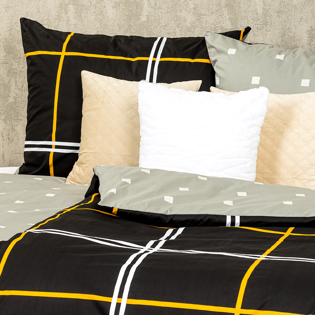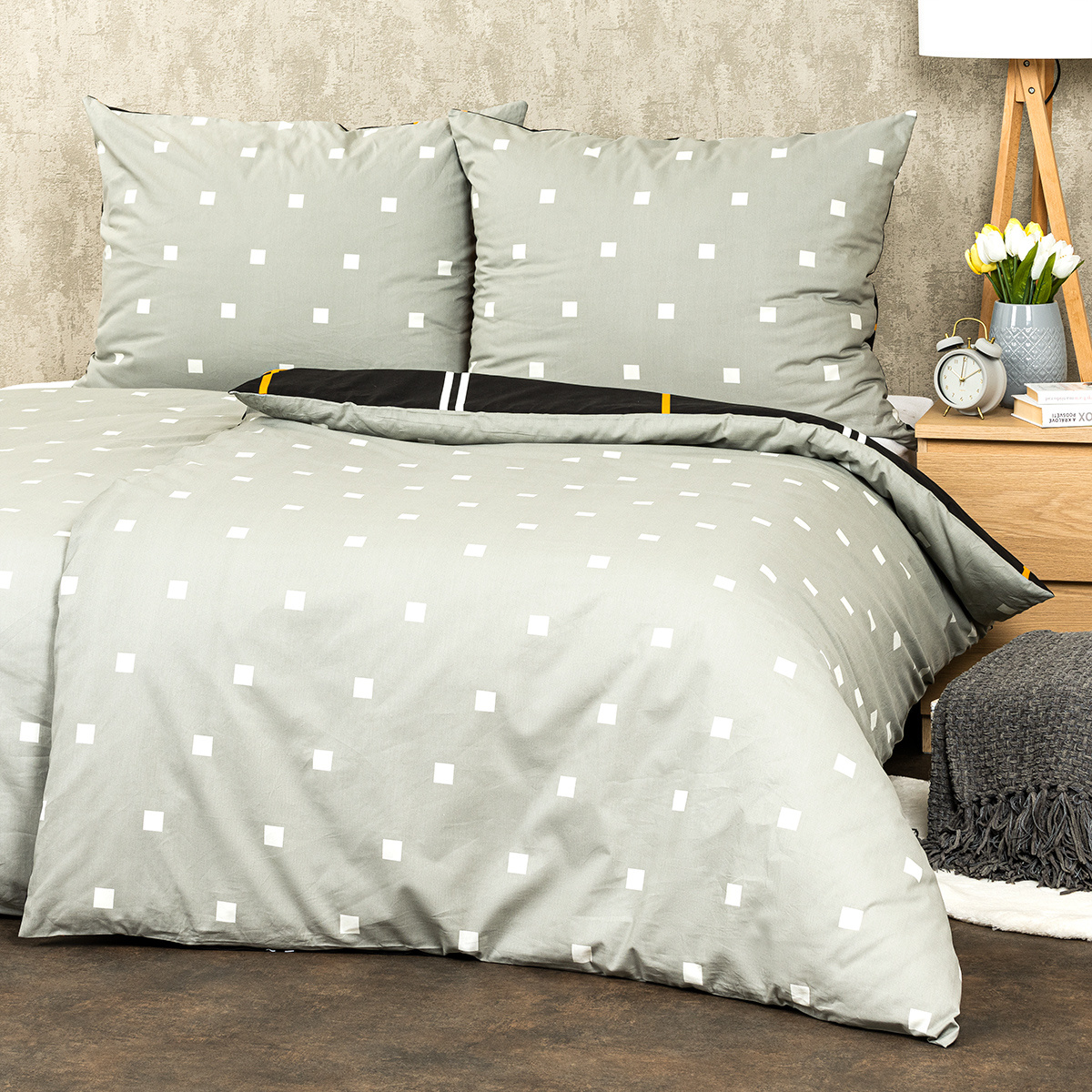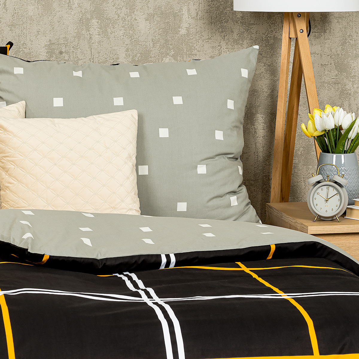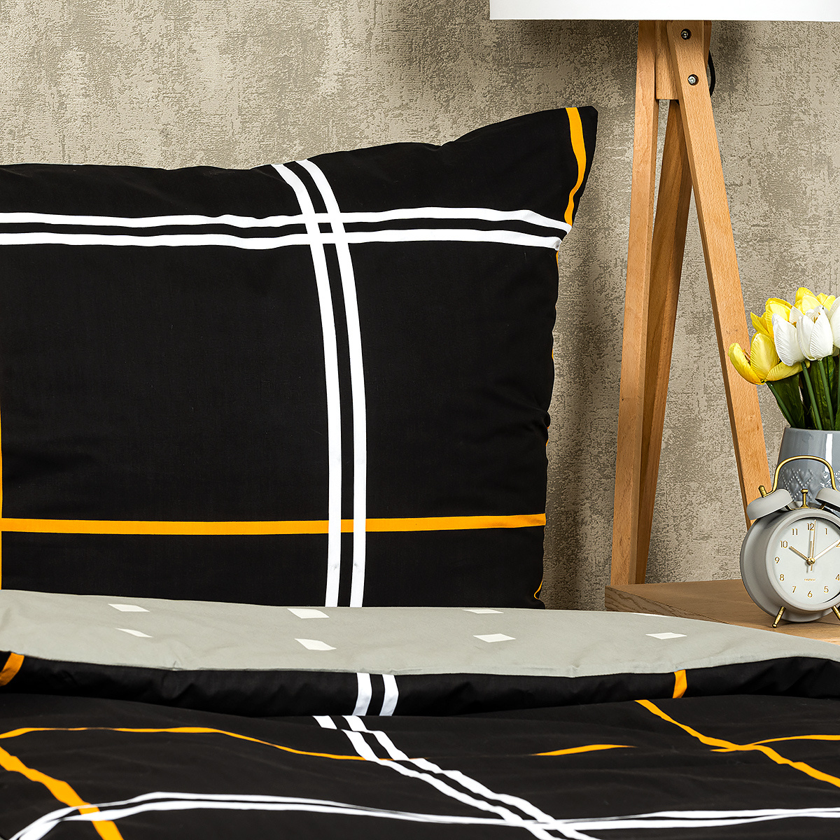 Obľúbený kockovaný vzor v elegantnej kombinácii sivej a čiernej dodá eleganciu vašej spálnie. Tlmené farby a triezvy grafický vzor bude to pravé orechové aj do čisto pánskych alebo chlapčenských izieb.Obliečky sú obojstranné – jedna strana je čierna so žltými a bielymi líniami, druhá svetlosivá s drobným vzorom kociek. Môžete ich teda ľubovoľne kombinovať a meniť svoju posteľ každý deň.Kvalitná 100% bavlna zaistí maximálny komfort počas spánku aj jednoduchú údržbu. Obliečky sú opatrené zapínaním na zips pre vaše maximálne pohodlie.Súprava obsahuje:
