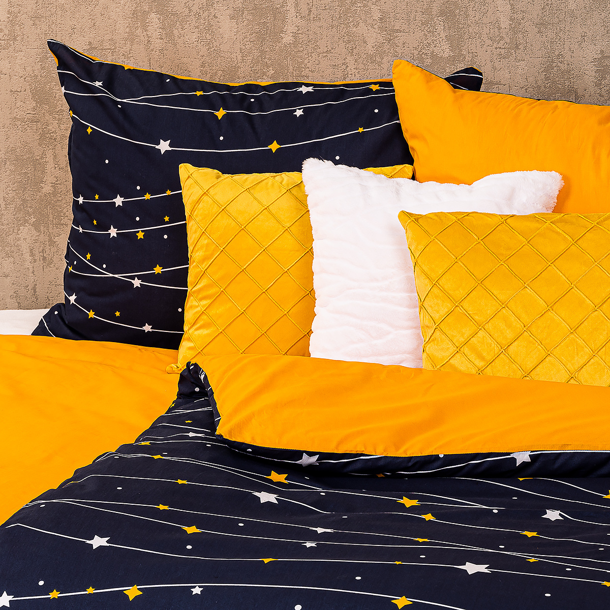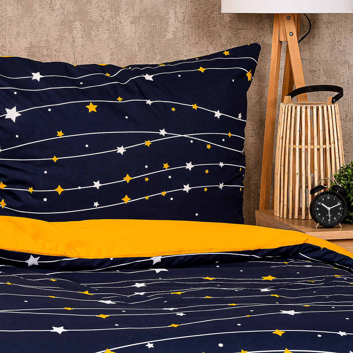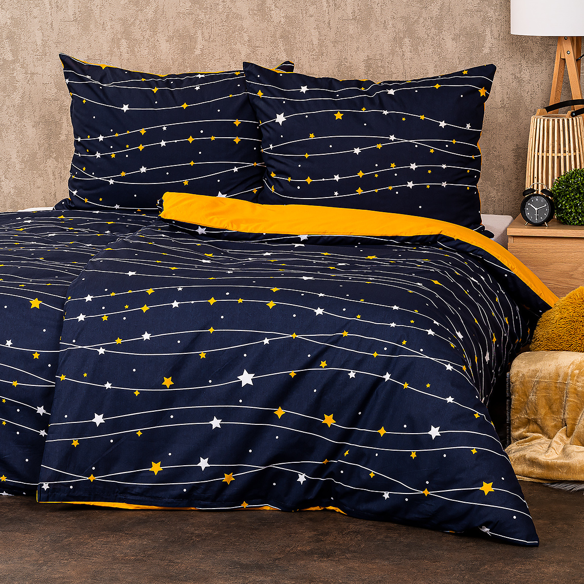 Zaspávajte pod oblohou plnou žiarivých hviezd s originálnymi bavlnenými obliečkami. Kontrastná kombinácia tmavomodrej a žltej dodá vášmu domovu jedinečný štýl. Decentný motív hviezdičiek na tmavomodrom podklade navodí dojem nočnej oblohy pre harmonické zaspávanie. Obliečky sú vyrobené z mäkkej a príjemnej 100% bavlny, ktorá zaručí maximálne pohodlie a kvalitný spánok.Obliečky sú obojstranné – z jednej strany modrej so vzorom, druhá strana je jednofarebná, žltá. Môžete ich teda ľubovoľne kombinovať a meniť svoju posteľ každý deň. Pre maximálne pohodlie majú obliečky praktické zapínanie na zips.Súprava obsahuje: