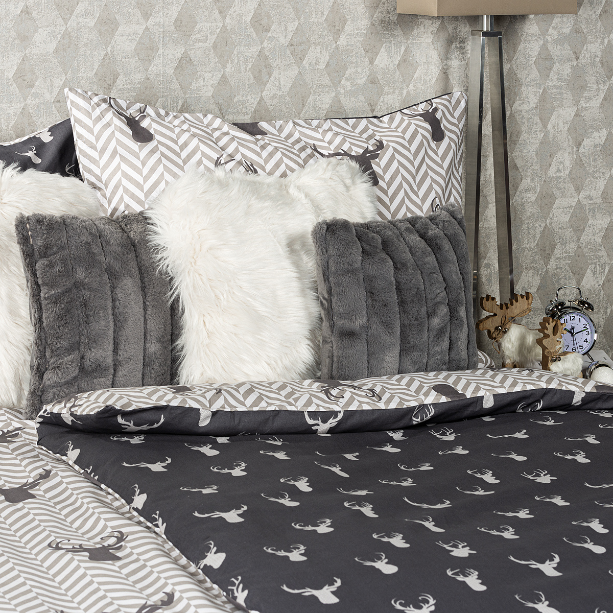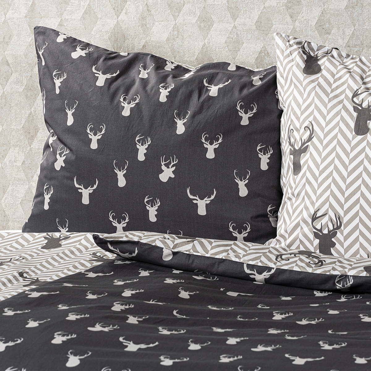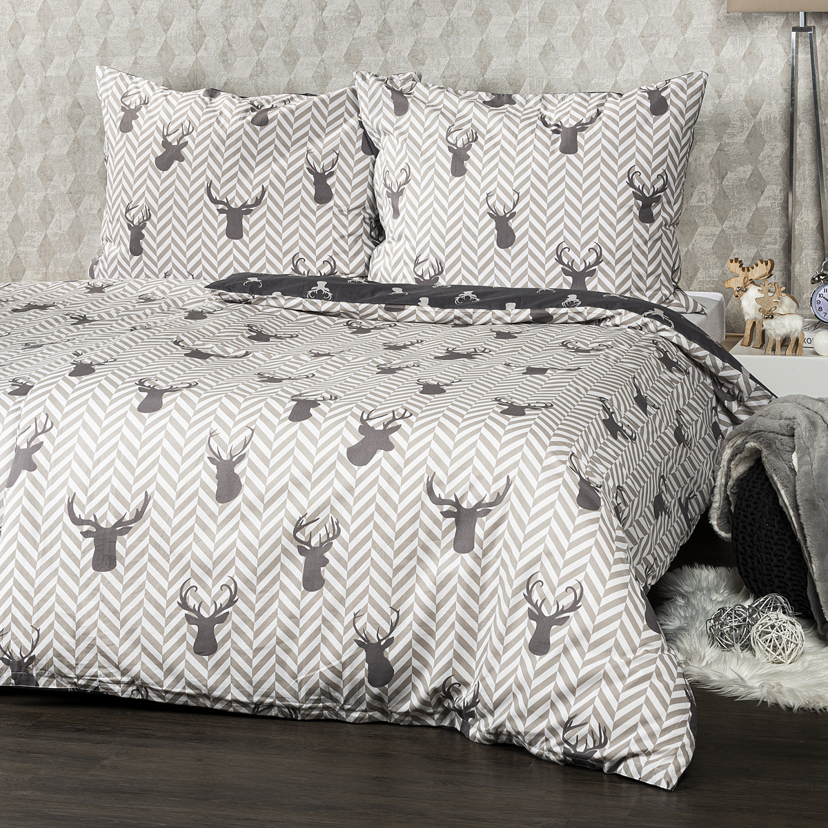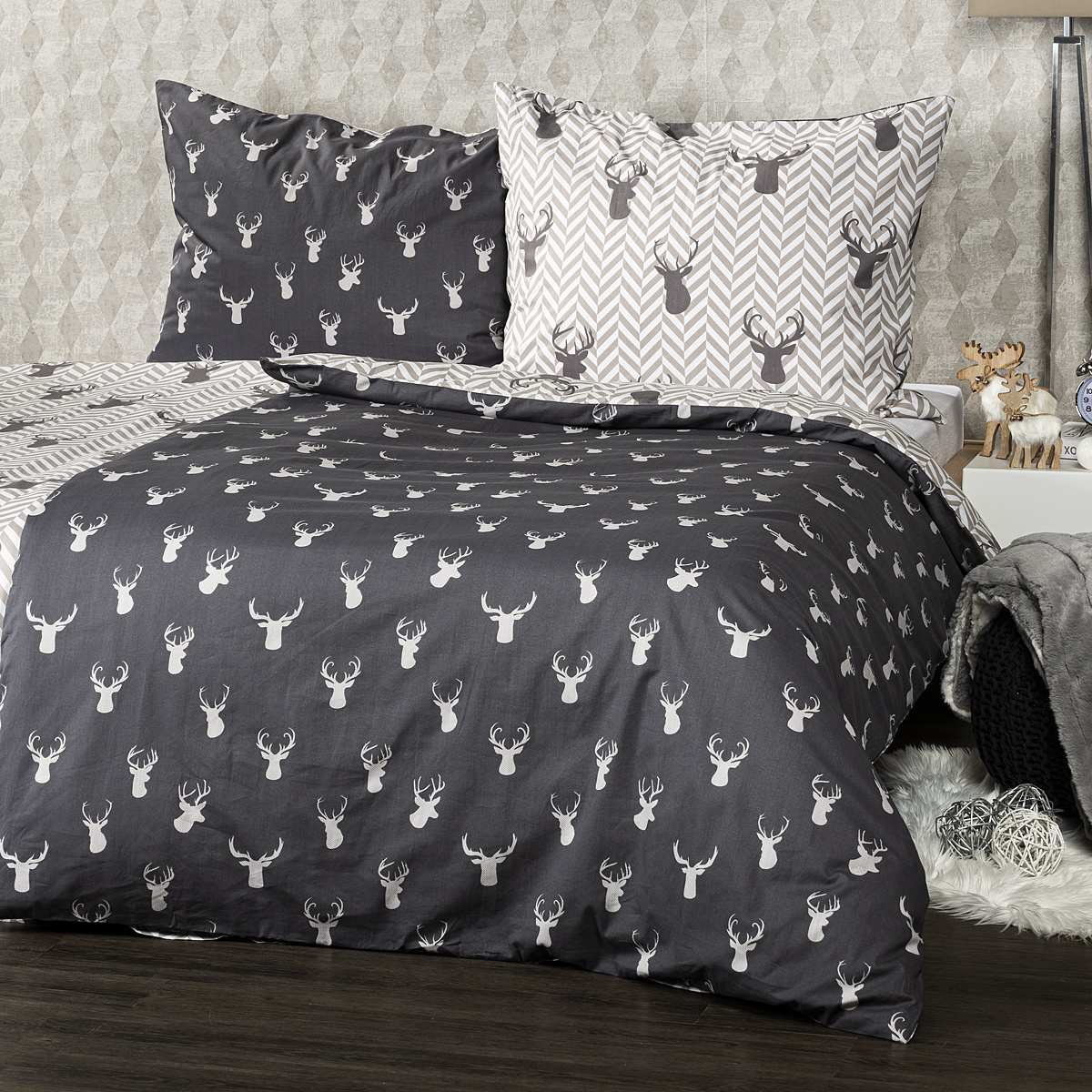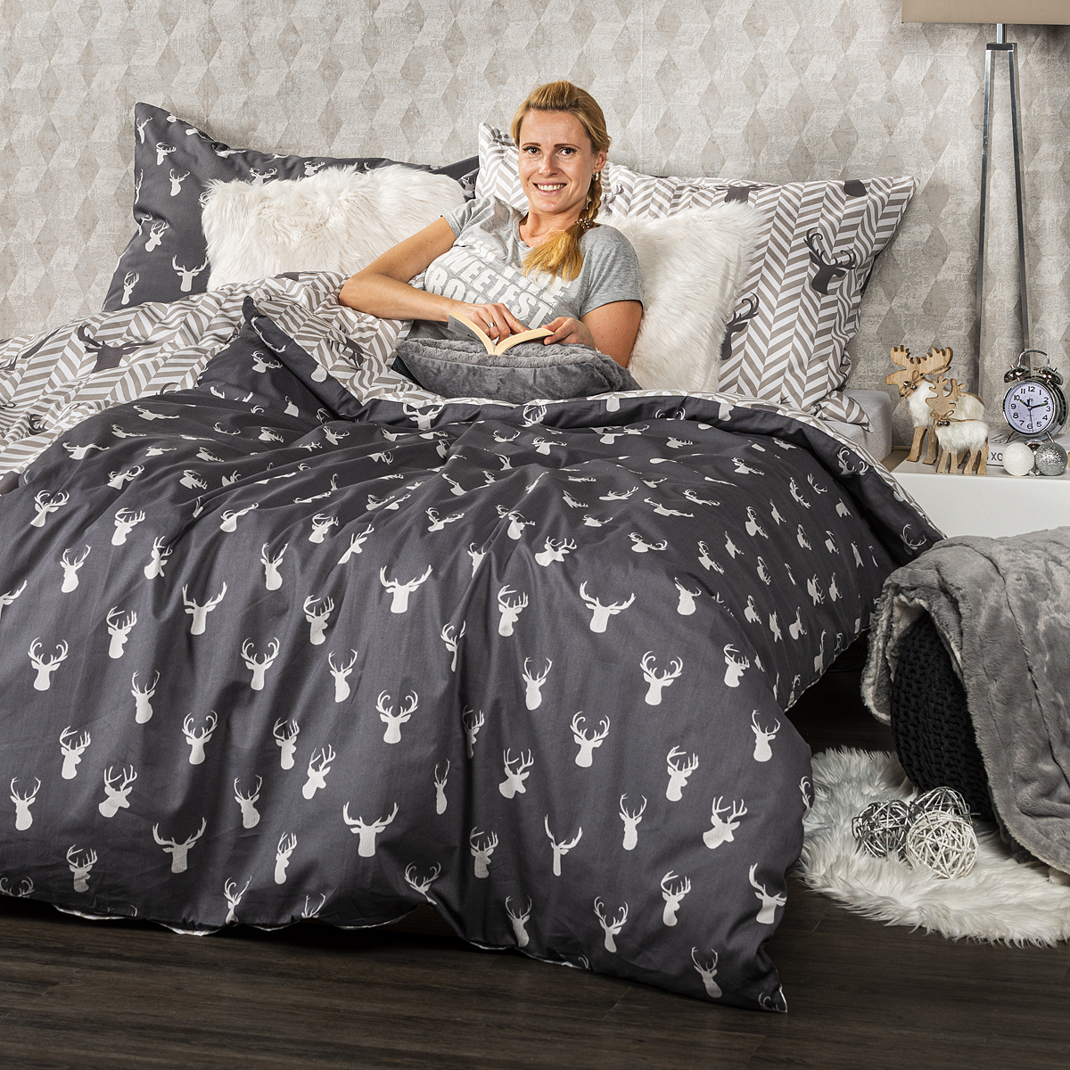 Aby boli aj vaše noci naozaj pohodové, chce to príjemné obliečky k zababušeniu! Uvelebte sa v bavlnených obliečkach s motívom jeleňov a užite si tú správnu pohodu každý deň. Decentná kombinácia odtieňov sivej a bielej skvele doladí každý interiér. Obliečky sú vyrobené z kvalitnej 100% bavlny, ktorá zaručí príjemné zaspávanie.Obliečky sú obojstranné – z jednej strany motívmi jeleňov na tmavom podklade, z druhej strany na harmonickom vzore rybej kosti – môžete ich teda ľubovoľne kombinovať a meniť svoju posteľ každý deň. Pre maximálne pohodlie majú obliečky praktické zapínanie na zips.Súprava obsahuje: