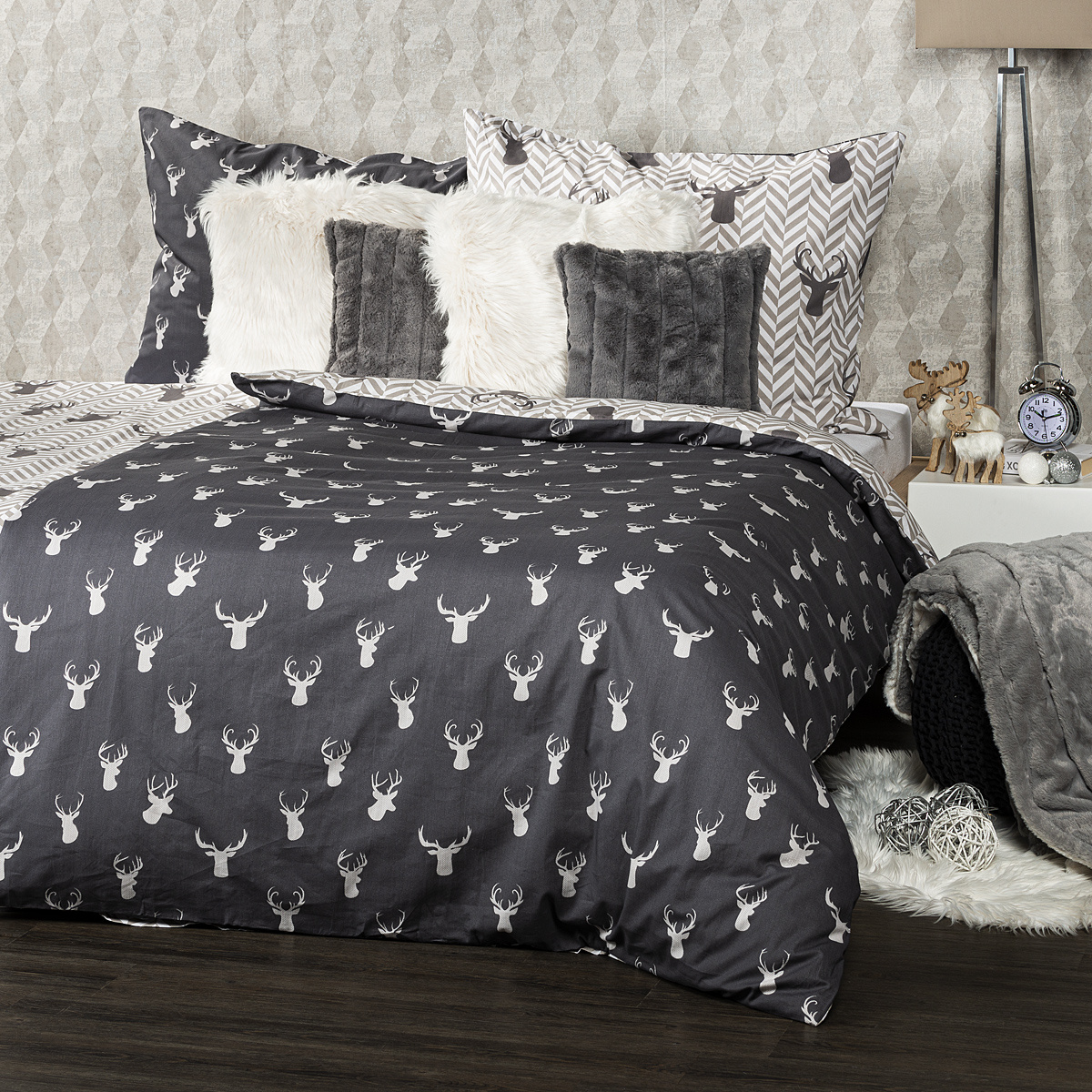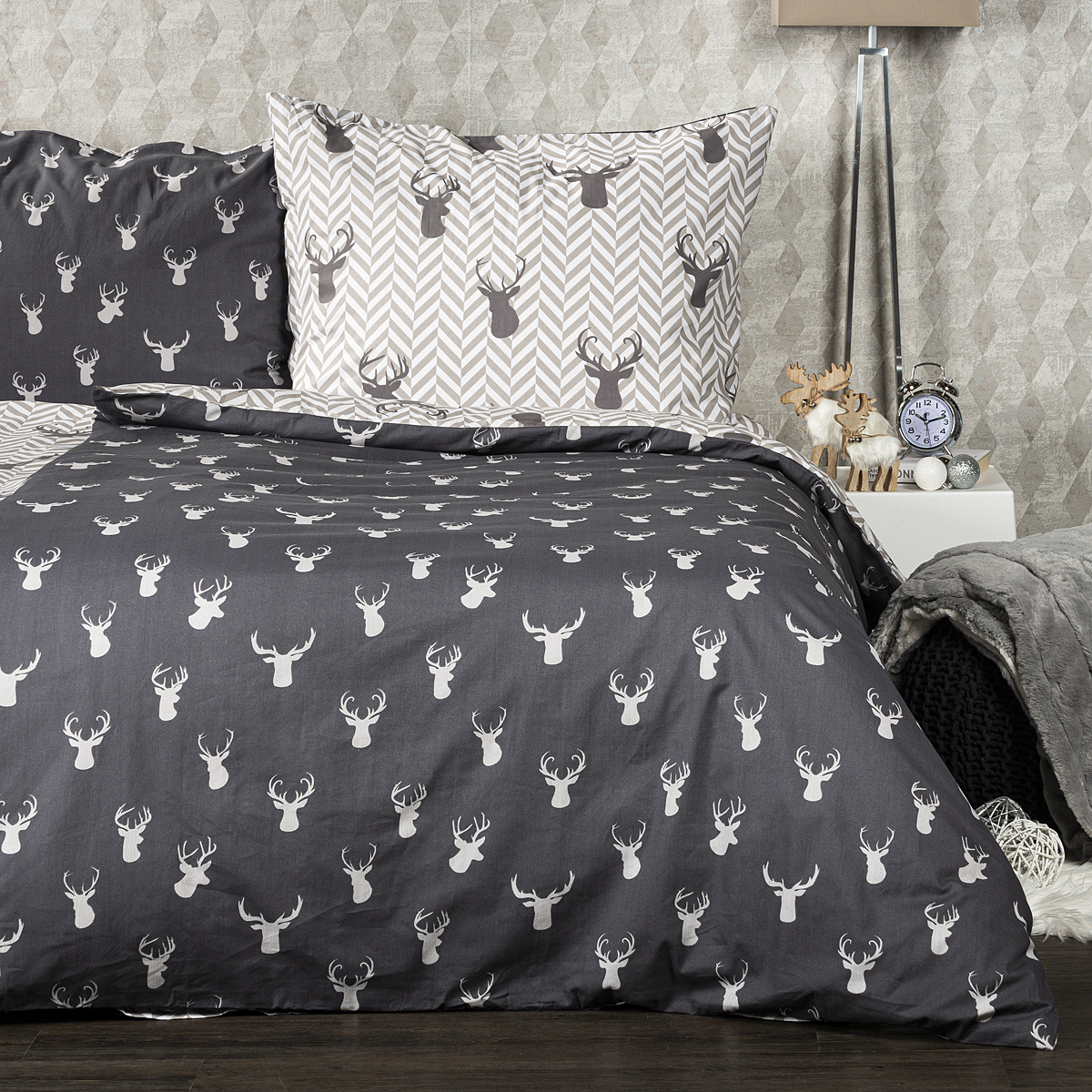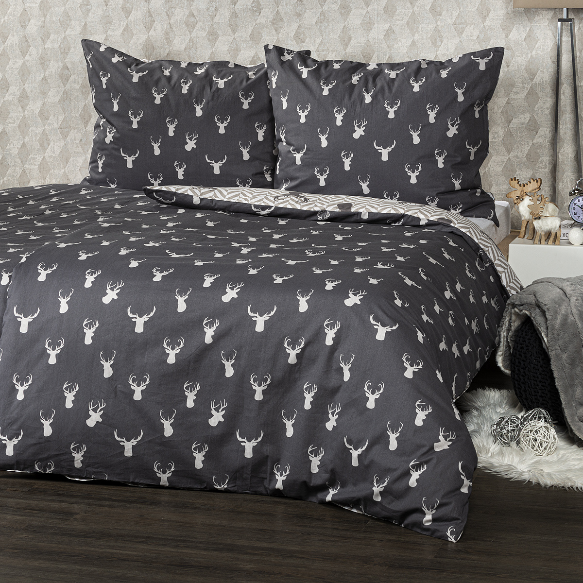 Aby boli aj vaše noci naozaj pohodové, chce to príjemné obliečky k zababušeniu! Uvelebte sa v bavlnených obliečkach s motívom jeleňov a užite si tú správnu pohodu každý deň. Decentná kombinácia odtieňov sivej a bielej skvele doladí každý interiér. Obliečky sú vyrobené z kvalitnej 100% bavlny, ktorá zaručí príjemné zaspávanie.Obliečky sú obojstranné – z jednej strany motívmi jeleňov na tmavom podklade, z druhej strany na harmonickom vzore rybej kosti – môžete ich teda ľubovoľne kombinovať a meniť svoju posteľ každý deň. Pre maximálne pohodlie majú obliečky praktické zapínanie na zips.Súprava obsahuje: