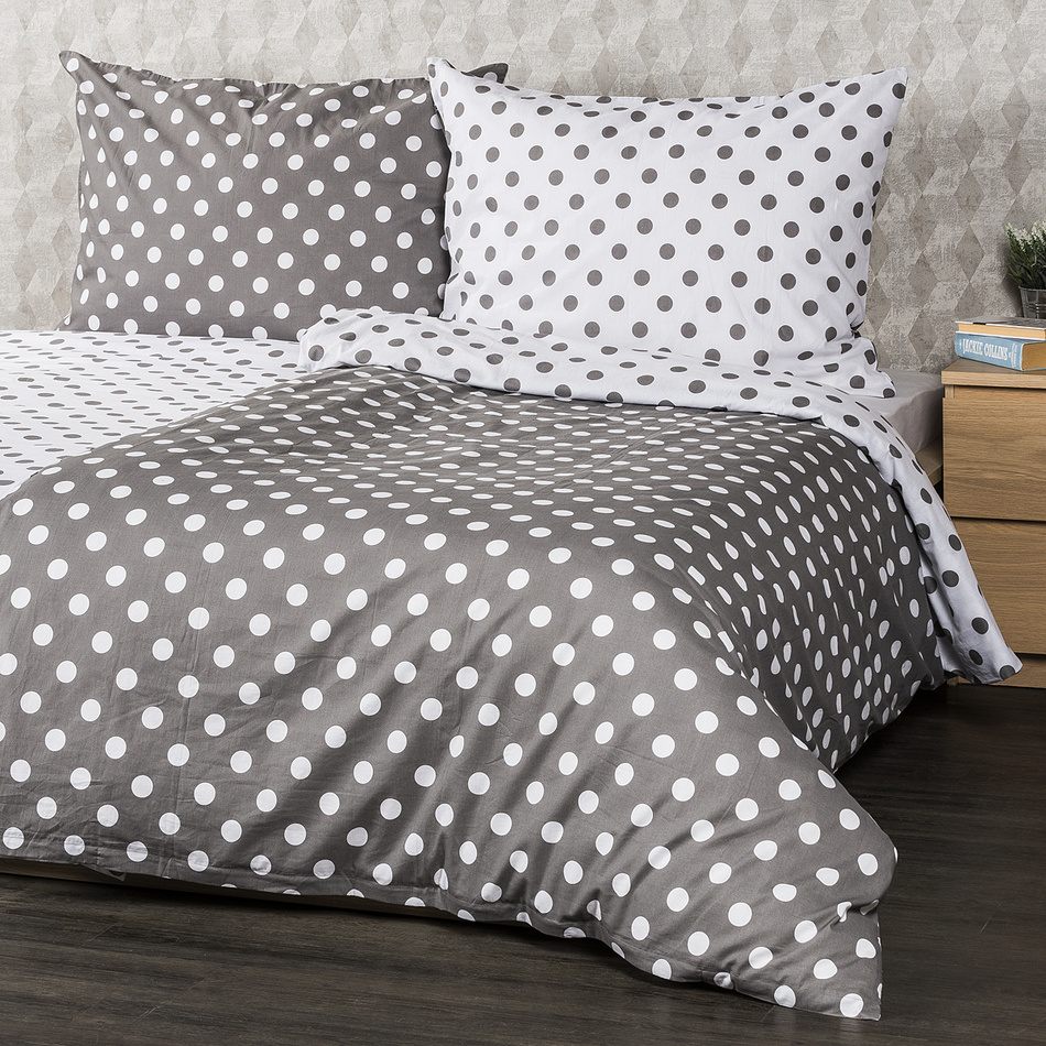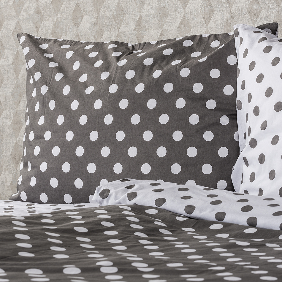 Elegantné potešenie pre každého puntičkára. Rozverné bodky vnesú retro atmosféru do každej spálne a vďaka decentnému sivo-bielemu prevedeniu navyše pôsobia veľmi elegantne. Ideálne bavlnené obliečky pre všetkých s hravou a jemnou dušou. Mäkká a príjemná 100% bavlna vám zaručí kvalitný i pohodlný spánok každú noc, takže sa vždy budete do svojej postele s nadšením vracať.Obliečky sú obojstranné – z jednej strany sivé s bielymi bodkami, z druhej strany biele so sivými bodkami – môžete ich teda ľubovoľne kombinovať a meniť svoju posteľ každý deň. Pre maximálne pohodlie majú obliečky praktické zapínanie na zips.Súprava obsahuje: