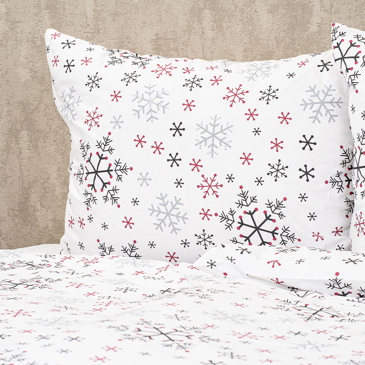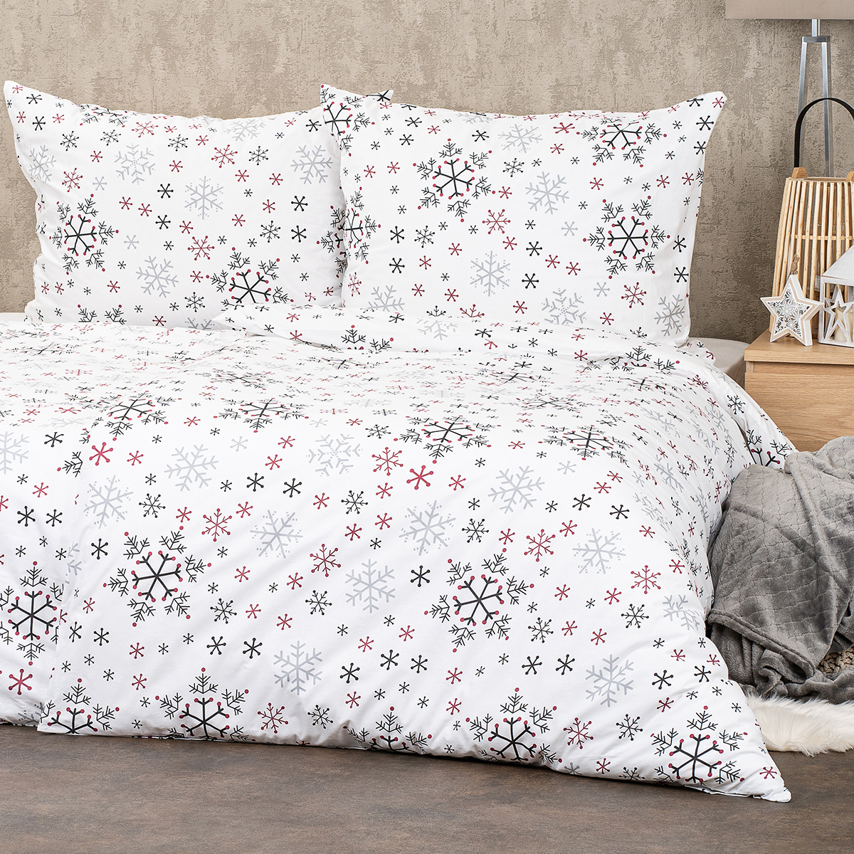 Vyčarujte si perfektnú zimnú atmosféru aj v pohodlí a teple domova. Bavlnené obliečky s decentným motívom urobia z vašej spálne kúzelné zimné kráľovstvo. Jednoduchý vzor snehových vločiek v sivých a červených tónoch na bielom podklade navodí dokonalú pohodu a prinesie harmonické sny o tichých zasnežených pláňach. Doprajte si pohodlný spánok s príjemnou a kvalitnou 100% bavlnou, ktorá zaručí príjemné zaspávanie ako za jemného šelestu snehových vločiek v stíchnutej zimnej krajine. Obliečky majú z oboch strán rovnaký vzor a sú opatrené zapínaním na zips.Súprava obsahuje: