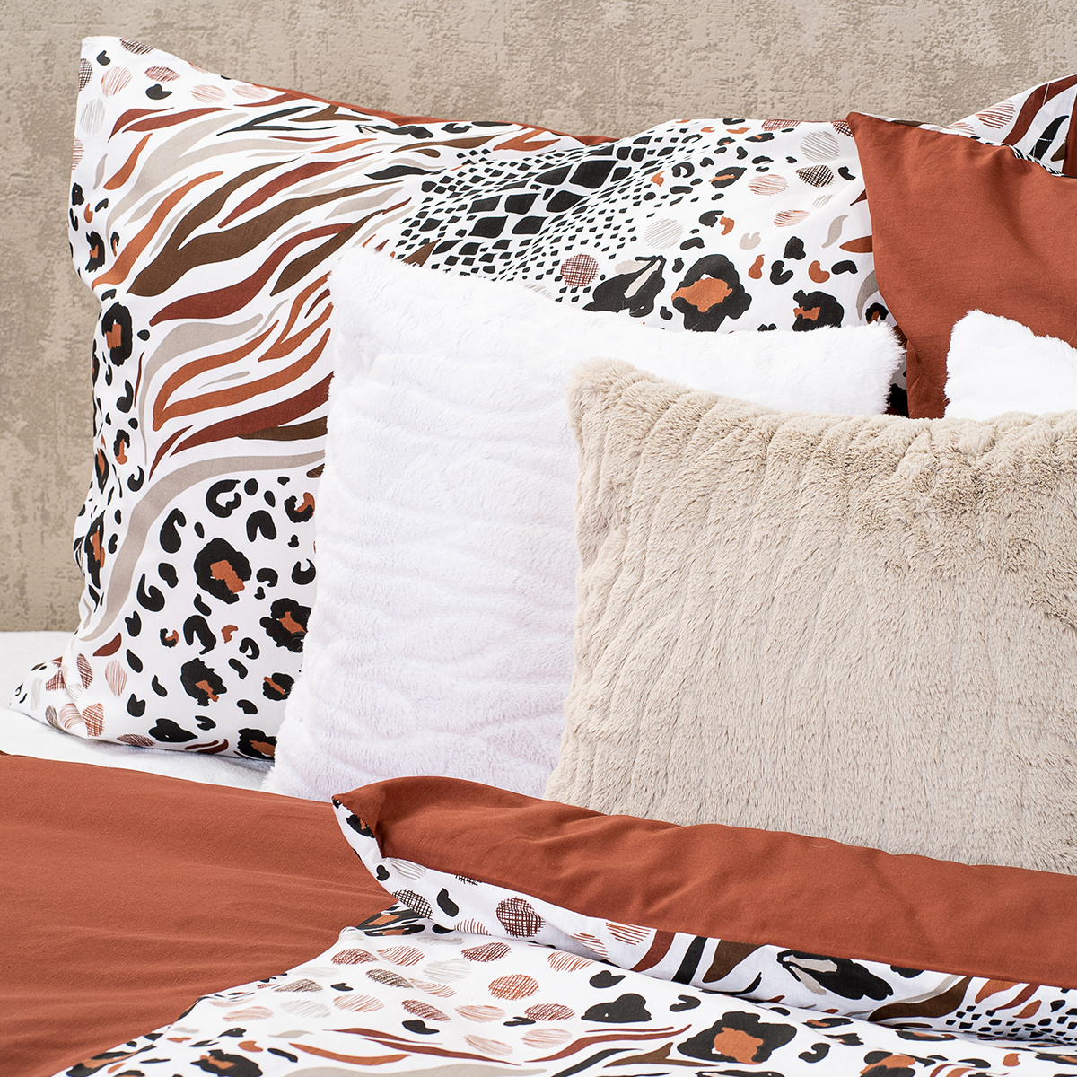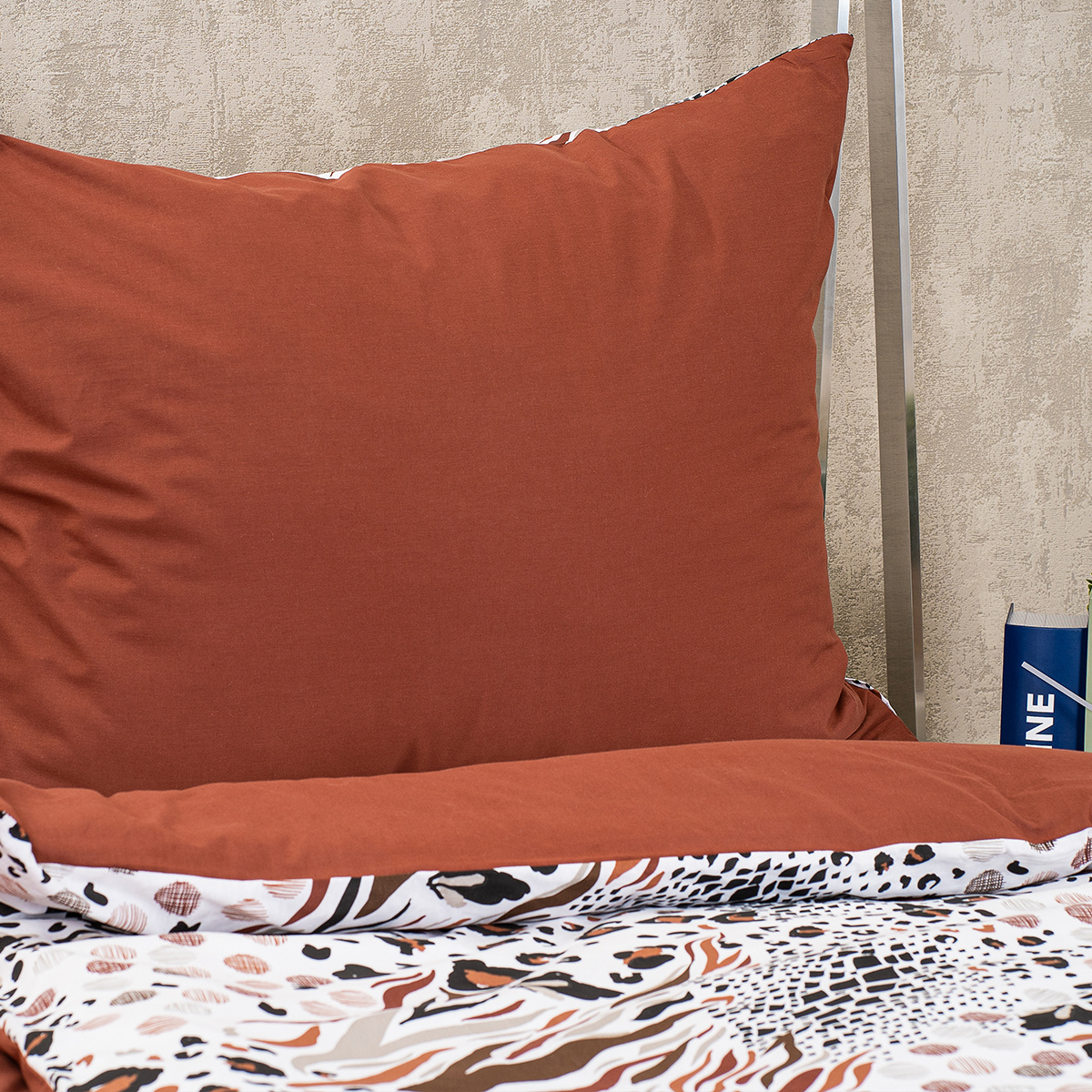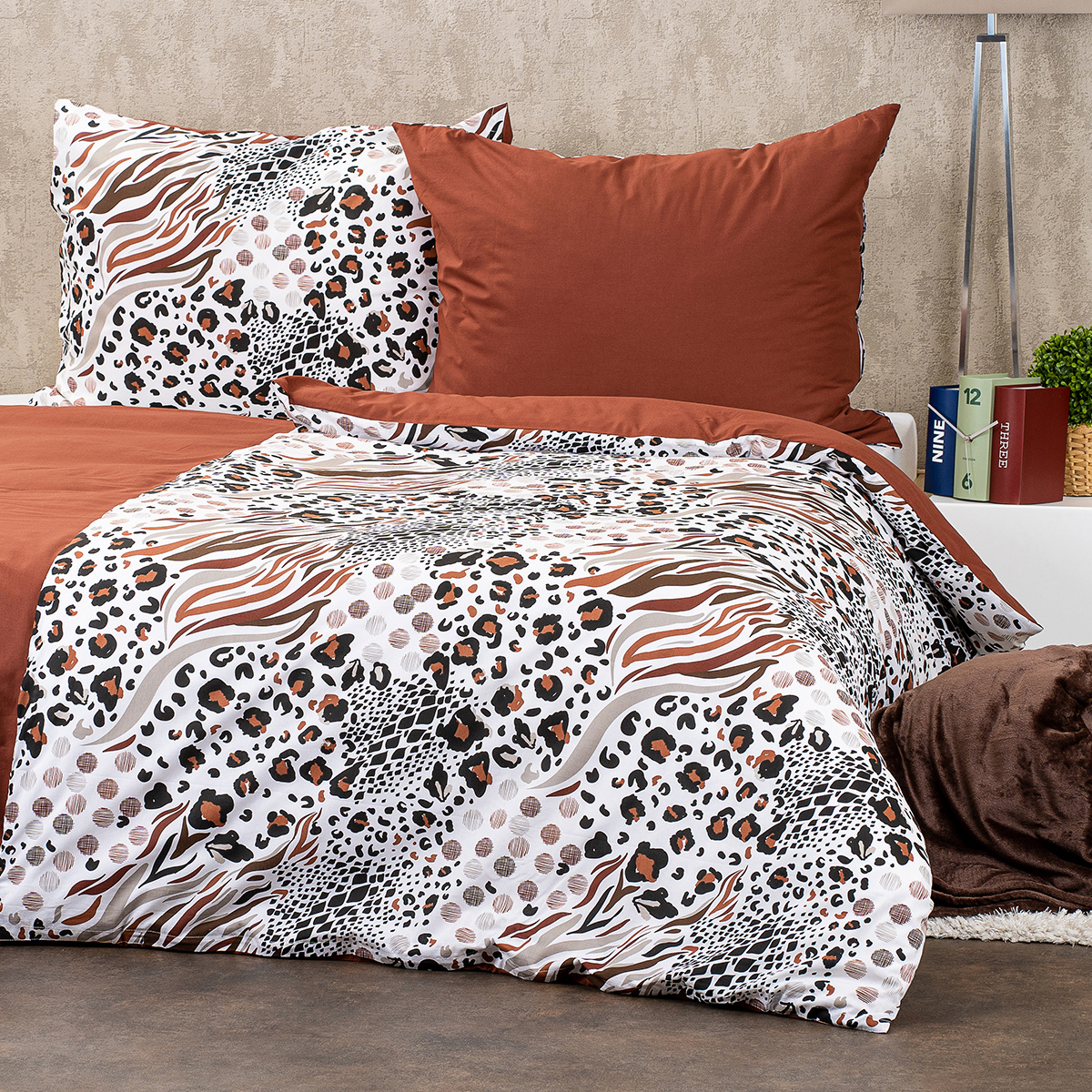 Bavlnené obliečky v prírodnom dizajne dodajú vášmu domovu nádych divočiny. Pútavá kombinácia zvieracích vzorov a hrejivej hrdzavo hnedej farby vás v okamihu prenesie na africké safari. A tie dobrodružné sny, ktoré na vás čakajú! Navyše sú obliečky vyrobené z mäkkej a príjemnej 100% bavlny, ktorá zaručí maximálne pohodlie aj pokojný spánok.Obliečky sú obojstranné – z jednej strany zvierací vzor, druhá strana je jednofarebná, hrdzavo hnedá. Môžete ich teda ľubovoľne kombinovať a meniť svoju posteľ každý deň. Pre maximálne pohodlie majú obliečky praktické zapínanie na zips.Súprava obsahuje: