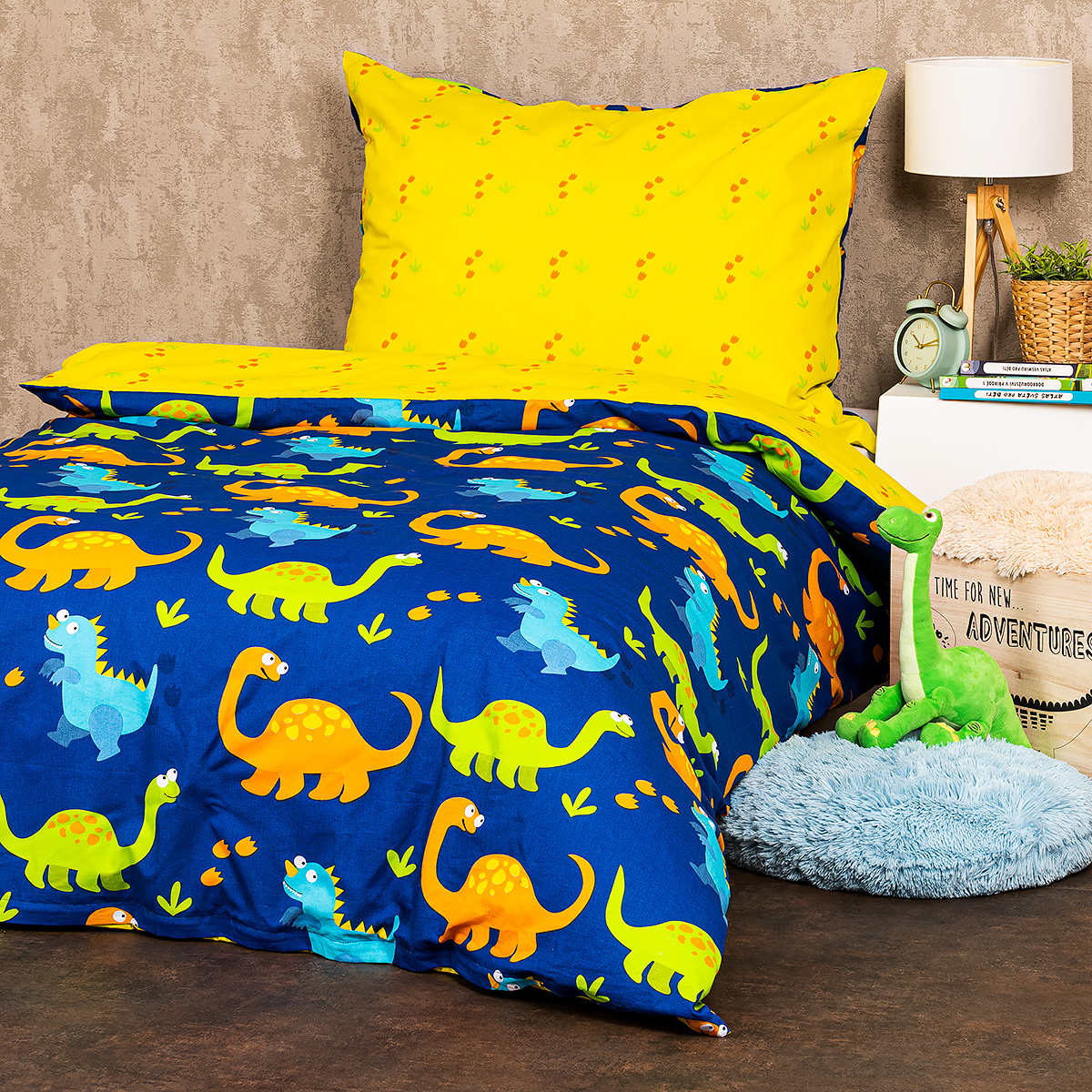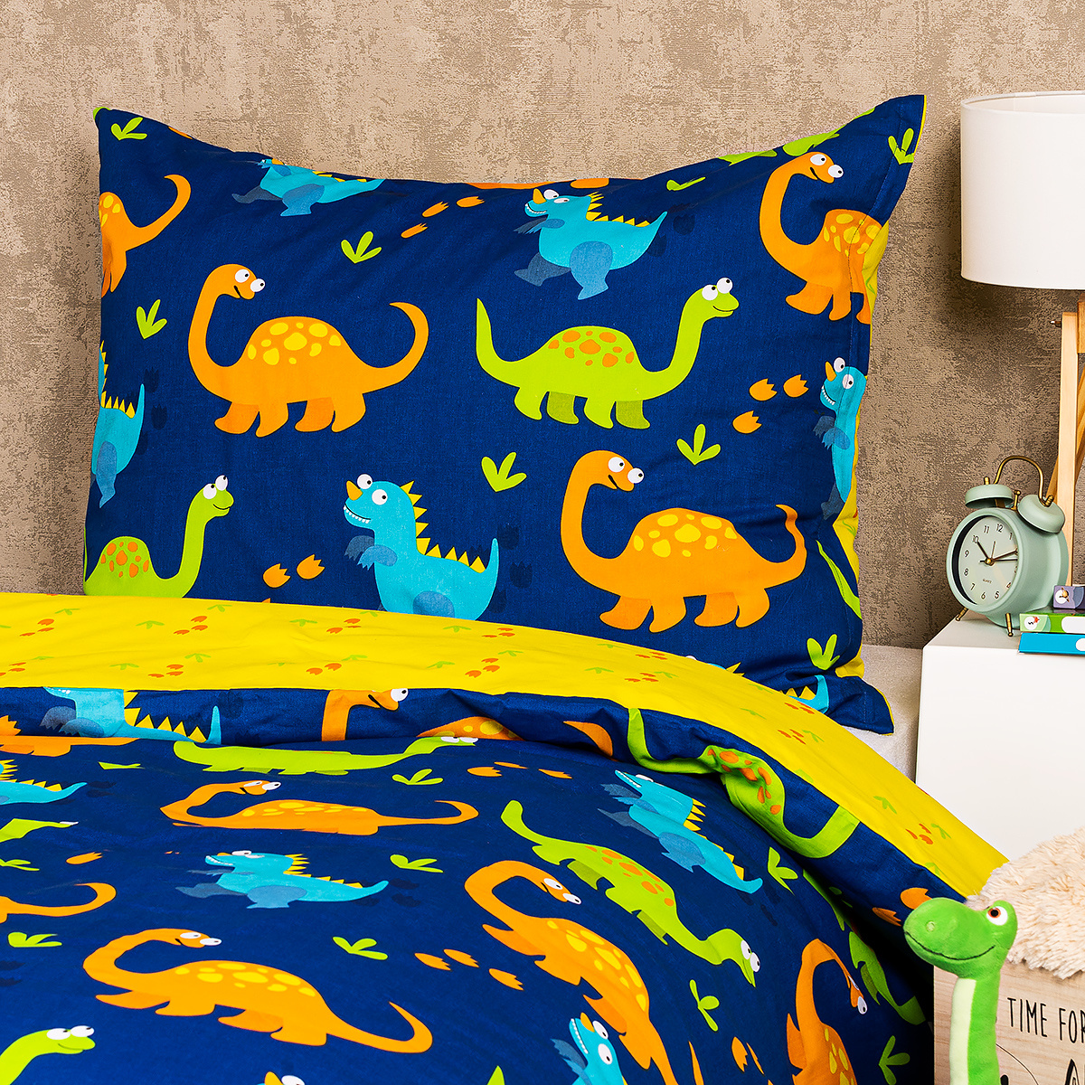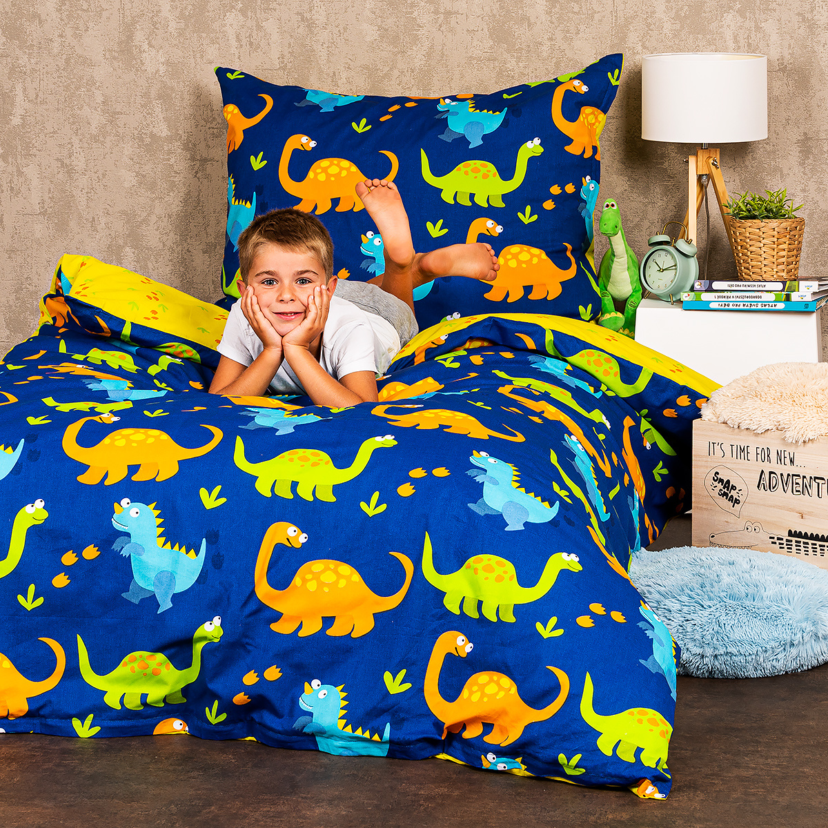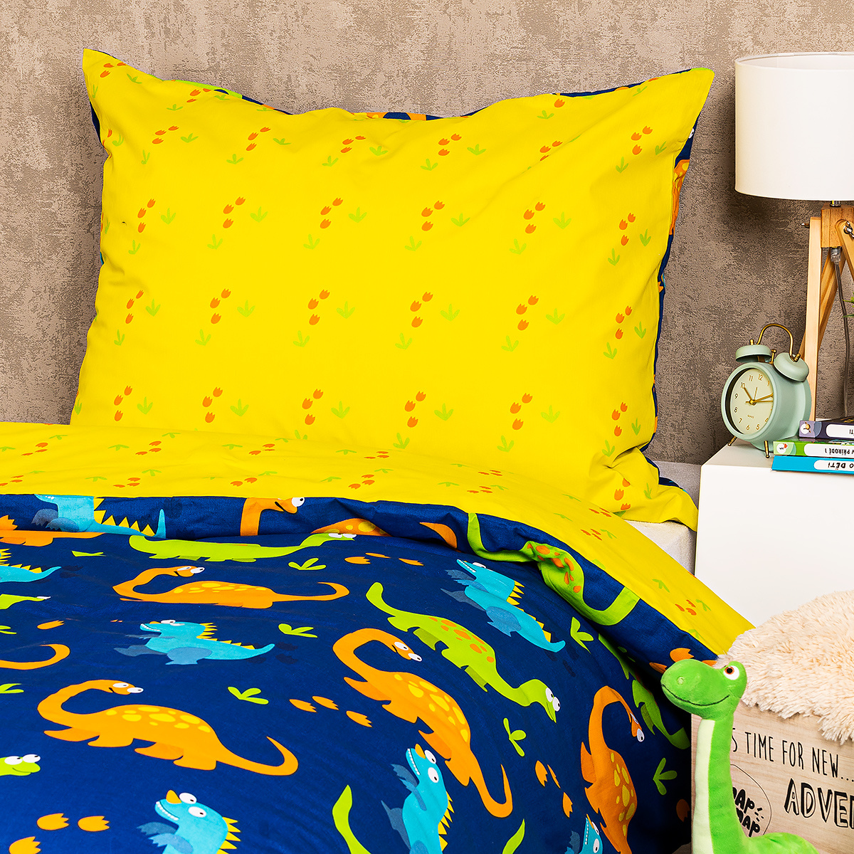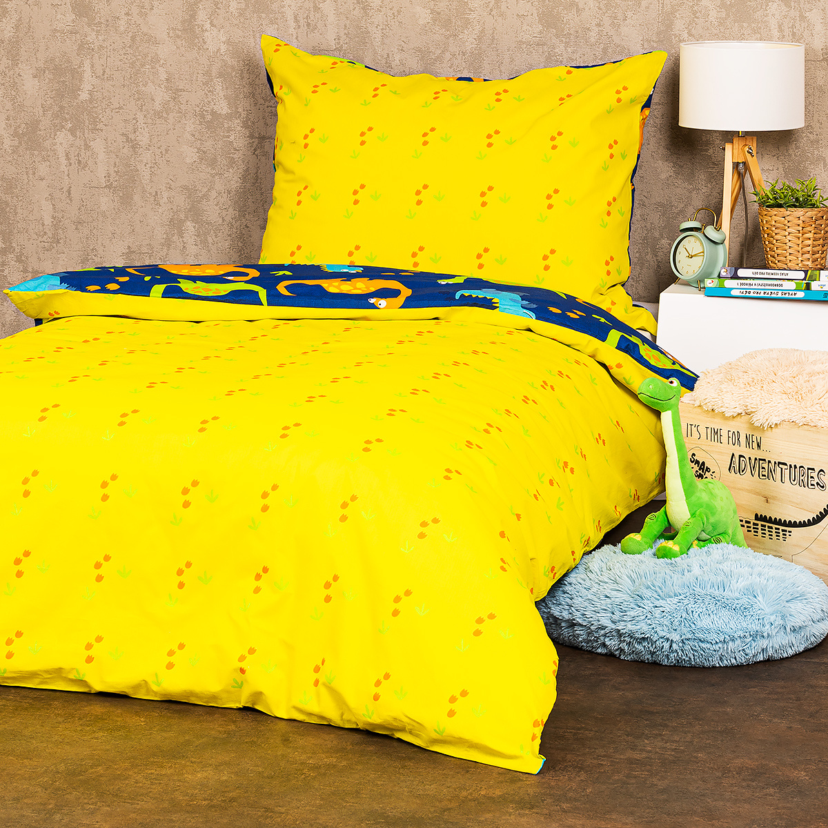 Hurá za dobrodružstvom do praveku! Pestrofarebné bavlnené obliečky s rozvernými dinosaurami rozhodne potešia dušu každého malého obdivovateľa týchto prehistorických velikánov. Obliečky sú obojstranné – jedna strana žiarivo modrá s farebnými dinosaurami, druhá strana má veselú žltú farbu a decentný vzor.Kvalitná 100% bavlna zabezpečí maximálny komfort a je šetrná aj k citlivej detskej pokožke. Môžete tak zaspávať s vedomím, že o pohodlie vašich ratolestí je postarané do najmenšieho detailu. Obliečky majú praktické zapínanie na zips.Súprava obsahuje: