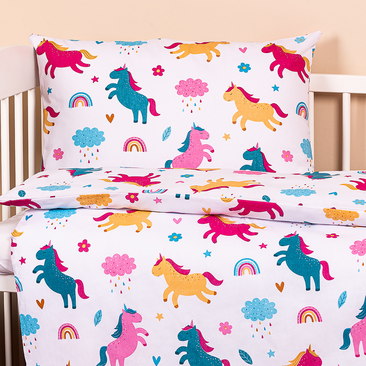 Hurá na výlet za kúzelnými jednorožcami! Roztomilé bavlnené obliečky do postieľky s pestrofarebným motívom jednorožcov na bielom podklade urobia z každej detskej izby magickú ríšu plnú tých najkrajších snov a vykúzlia úsmev na tvári nielen vašim deťom.Kvalitná 100% bavlna zaistí maximálny komfort a je šetrná aj k citlivej detskej pokožke. Môžete tak zaspávať s vedomím, že o pohodlie vašich detí je postarané do najmenšieho detailu. Obliečky sú z oboch strán rovnaké a majú praktické zapínanie na zips.Súprava obsahuje: