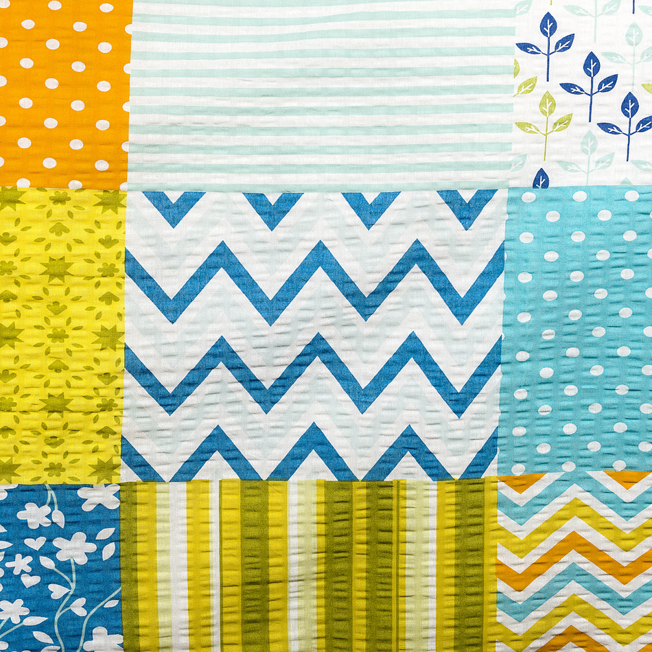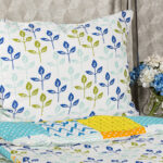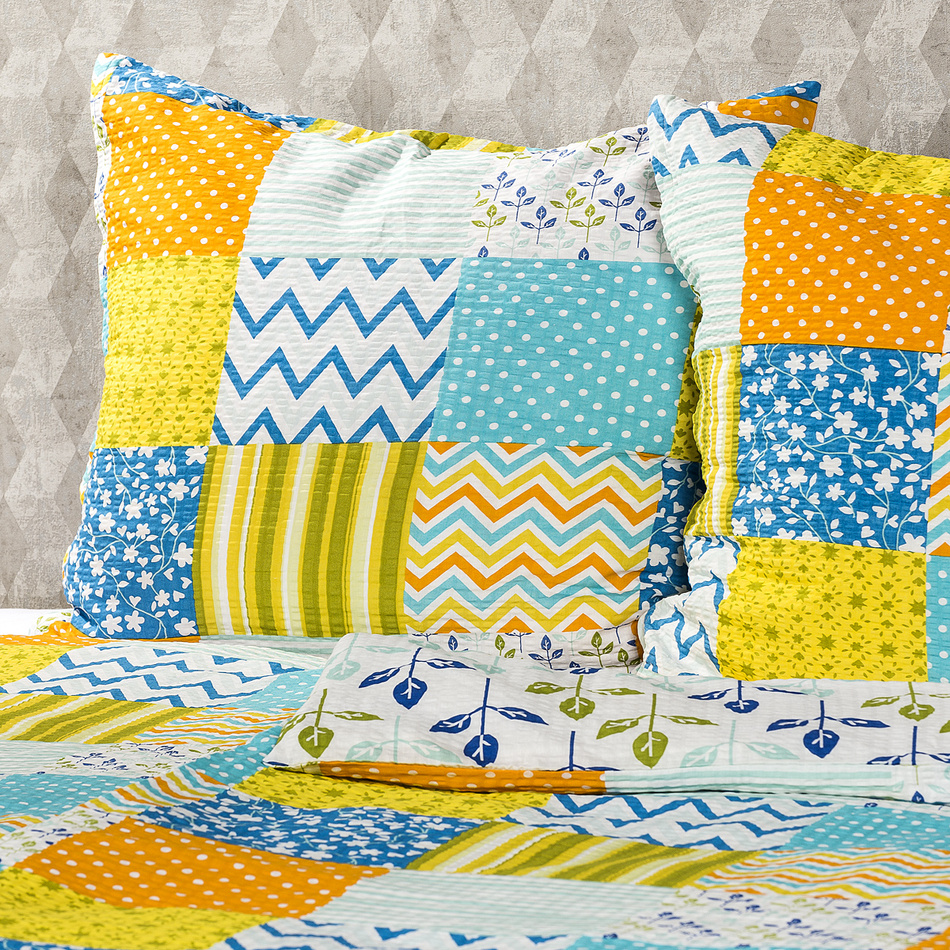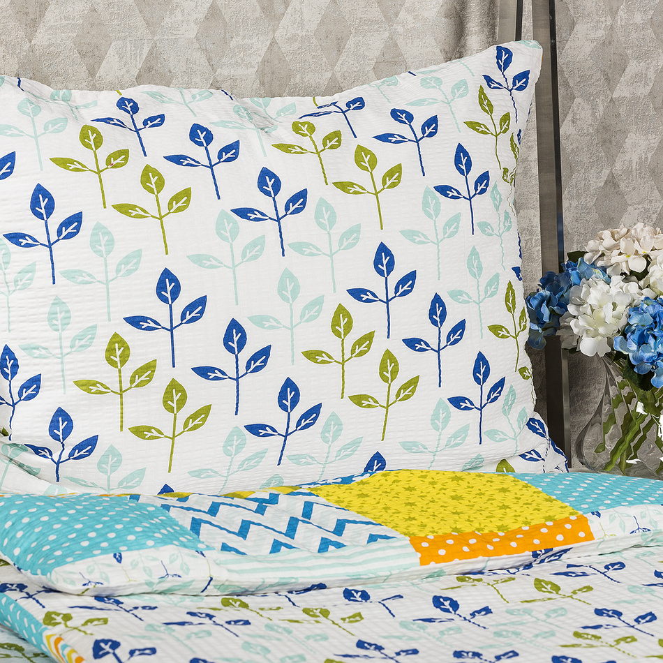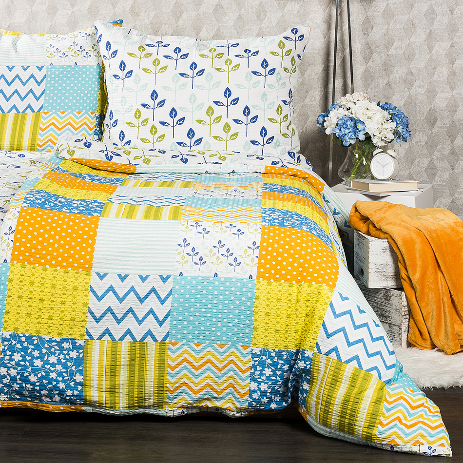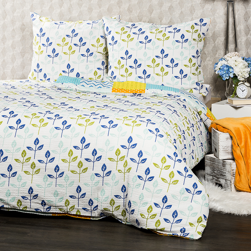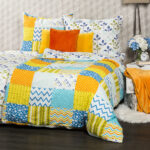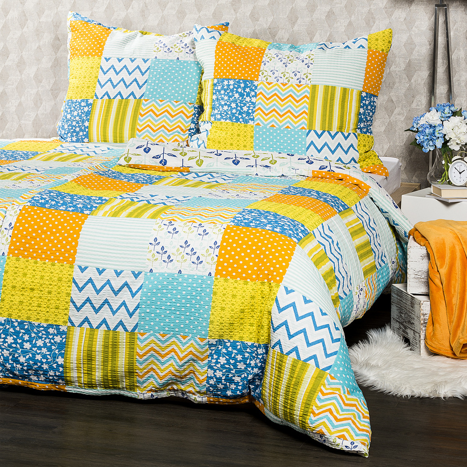 Svieže krepové obliečky s obľúbeným patchworkovým vzorom rozžiaria váš domov veselými farbami. Žiarivá kombinácia vzorov v odtieňoch modrej, oranžovej a žltej dodá čaro i sychravým dňom a prehreje váš domov v každom ročnom období. Klasický bavlnený krep je obľúbený najmä pre svoju nenáročnú údržbu – nemusí sa totiž vôbec žehliť.Obliečky sú obojstranné – z jednej strany klasický patchworkový motív, z druhej strany modré a zelené lístky na bielom podklade – môžete ich teda ľubovoľne kombinovať a meniť svoju posteľ každý deň. Obliečky na vankúš sú šité z metráže, preto sa vzhľad každej môže mierne líšiť. Pre maximálne pohodlie majú obliečky praktické zapínanie na zips.Súprava obsahuje: