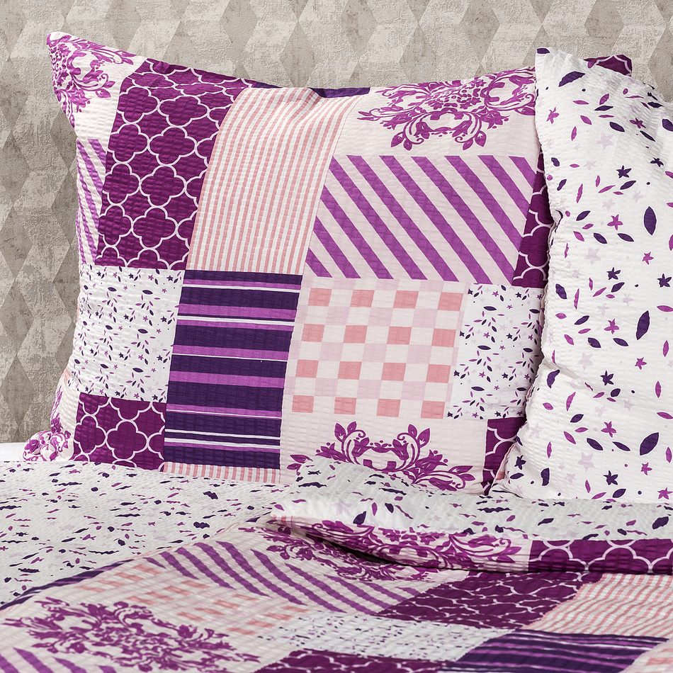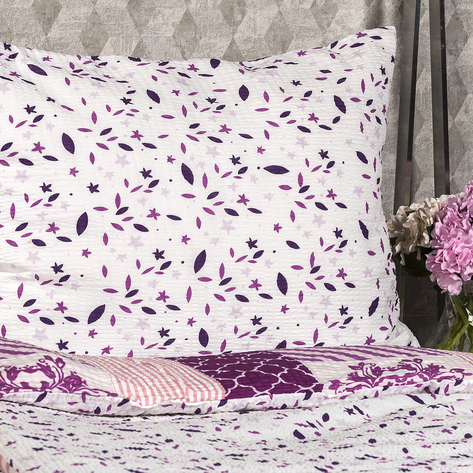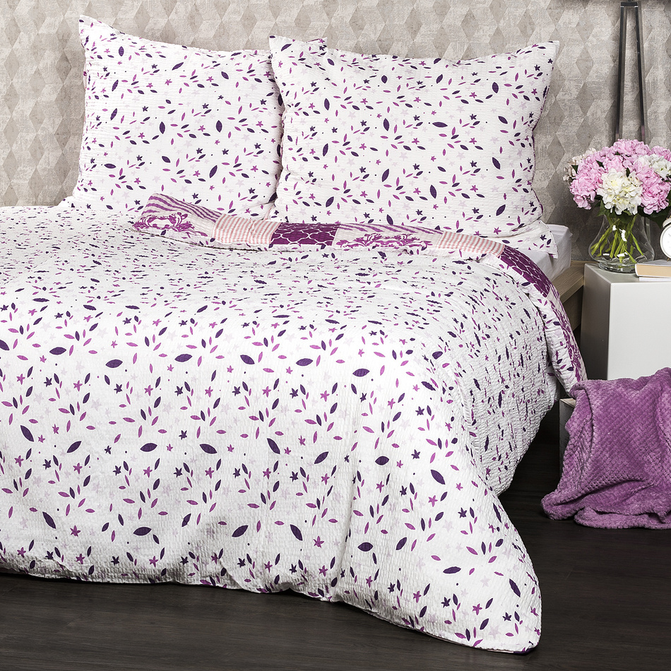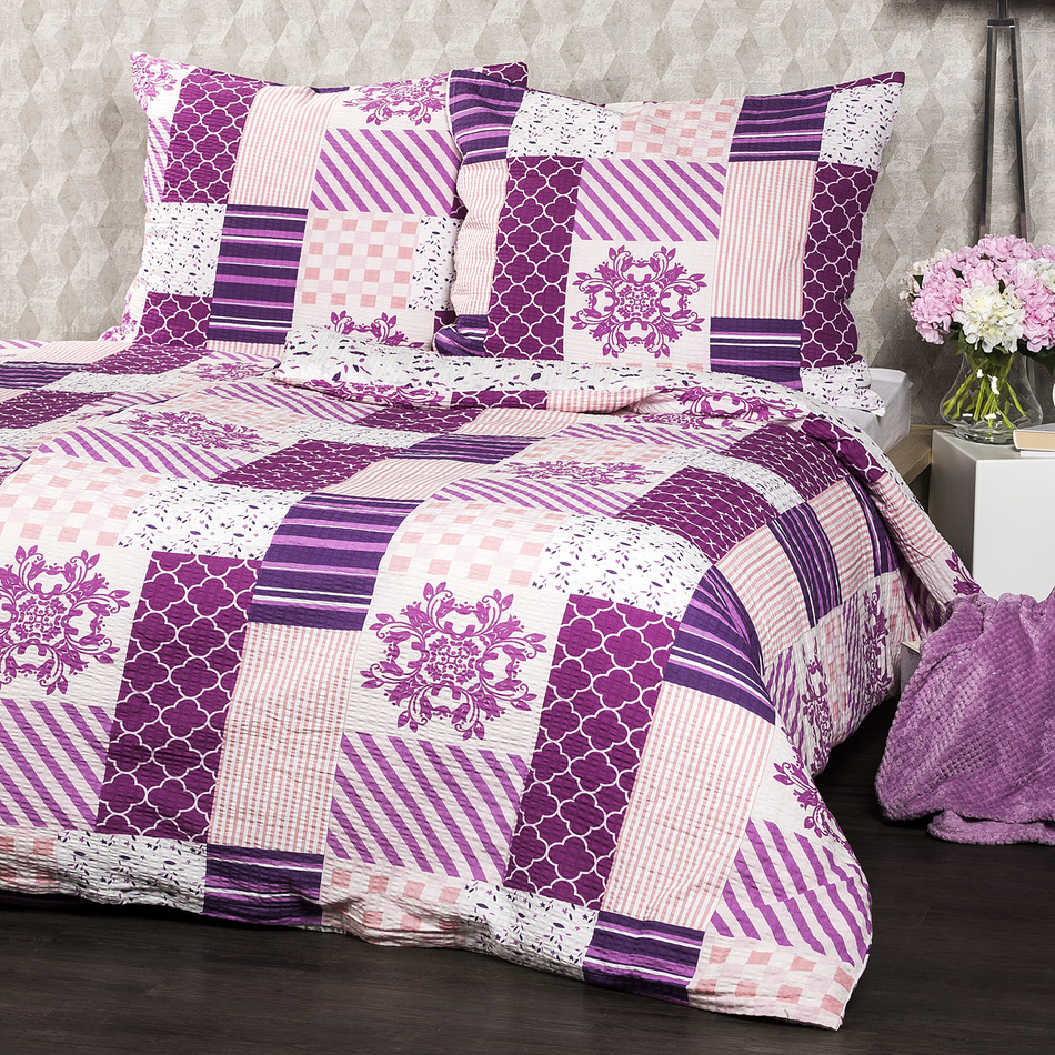 Romantické krepové obliečky s obľúbeným patchworkovým vzorom dodajú vášmu domovu čaro a nádych jemnosti. Originálna kombinácia vzorov v odtieňoch fialovej a ružovej vás naladí na harmonické sny a prehreje váš domov v každom ročnom období. Klasický bavlnený krep je obľúbený najmä pre svoju nenáročnú údržbu – nemusí sa totiž vôbec žehliť.Obliečky sú obojstranné – z jednej strany klasický patchworkový motív, z druhej strany fialové a ružové lístky na bielom podklade – môžete ich teda ľubovoľne kombinovať a meniť svoju posteľ každý deň. Obliečky na vankúš sú šité z metráže, preto sa vzhľad každej môže mierne líšiť. Pre maximálne pohodlie majú obliečky praktické zapínanie na zips. Súprava obsahuje: