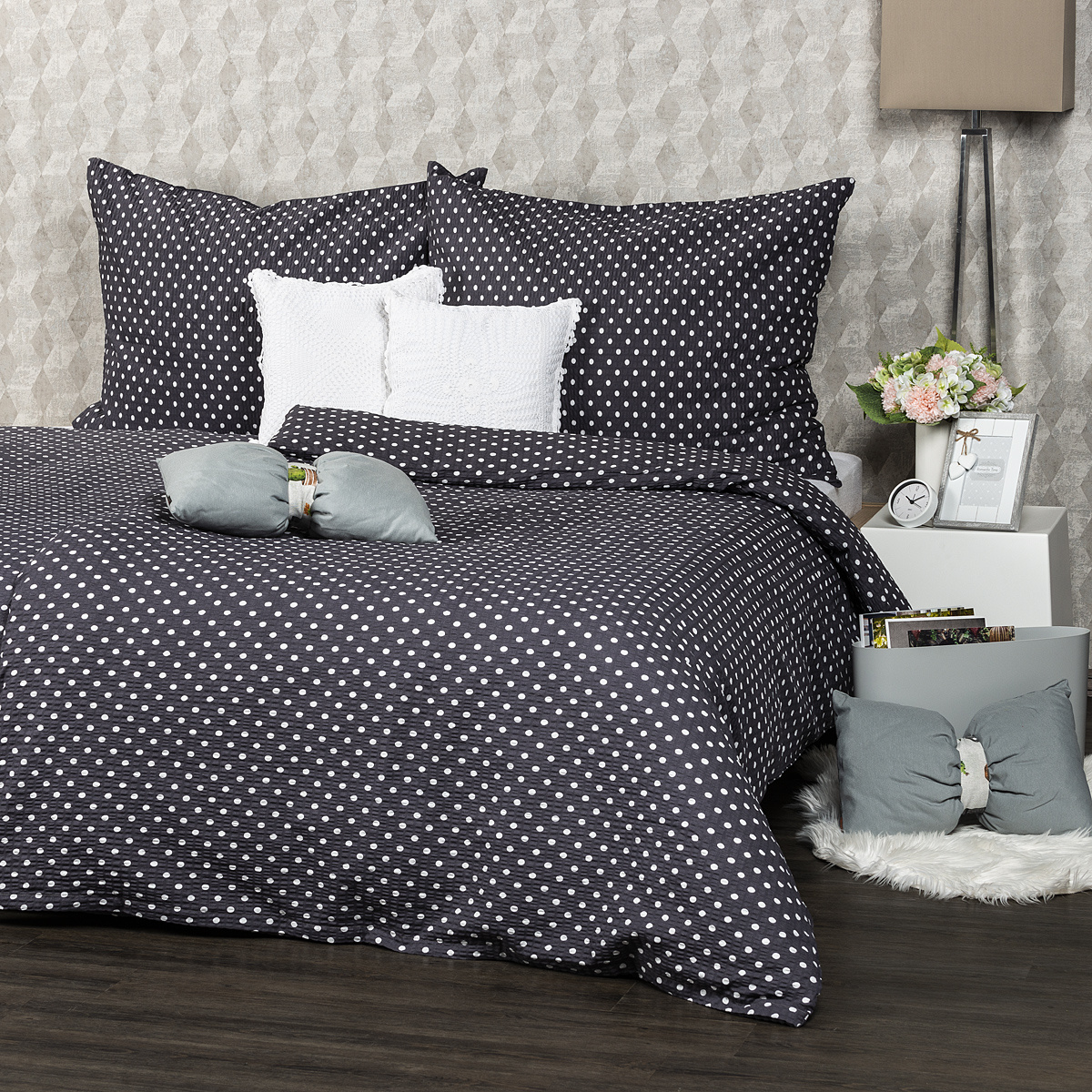 Elegantné potešenie pre každého puntičkára. Rozverné bodkay vnesú retro atmosféru do každej spálne a vďaka decentnému sivo-bielemu prevedeniu navyše pôsobia veľmi elegantne. Ideálne krepové obliečky pre všetkých s hravou a jemnou dušou. …