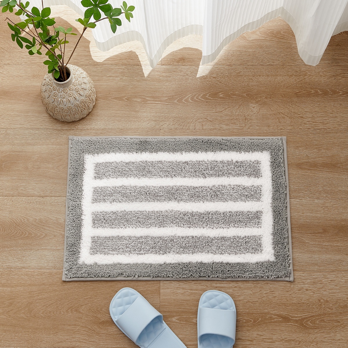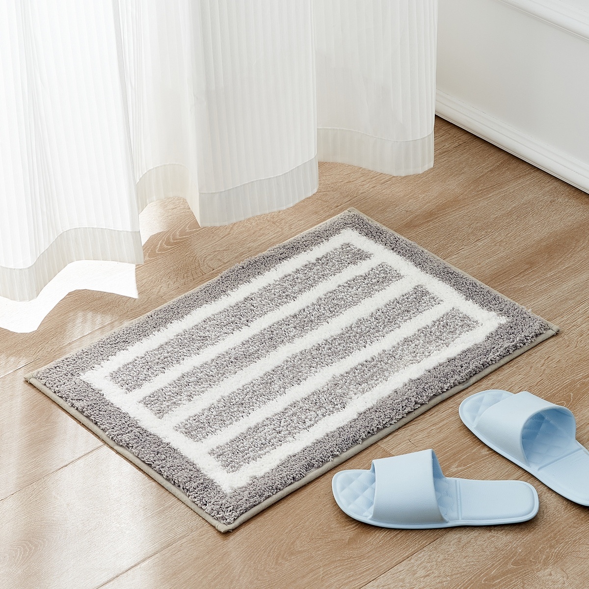 Elegantná kúpeľňová predložka v nadčasovom dizajne a sivobielej farebnej kombinácii bude perfektným doplnkom každej kúpeľne. Vďaka mäkučkému povrchu z kvalitného polyestru je príjemná na dotyk a poskytuje maximálne pohodlie pri každom kroku. Husté vlákna rýchlo absorbujú vodu a udržujú vašu podlahu suchú a čistú. Doprajte si to najlepšie po zaslúženom kúpeli alebo sprchovaní.Spodná strana predložky je opatrená praktickou protišmykovou vrstvou, ktorá zaisťuje bezpečné uchytenie na akomkoľvek type podlahy a zároveň zabraňuje nežiaducemu pošmyknutiu. Predložku je možné ľahko vyprať v práčke, odporúčame program na ručné pranie.