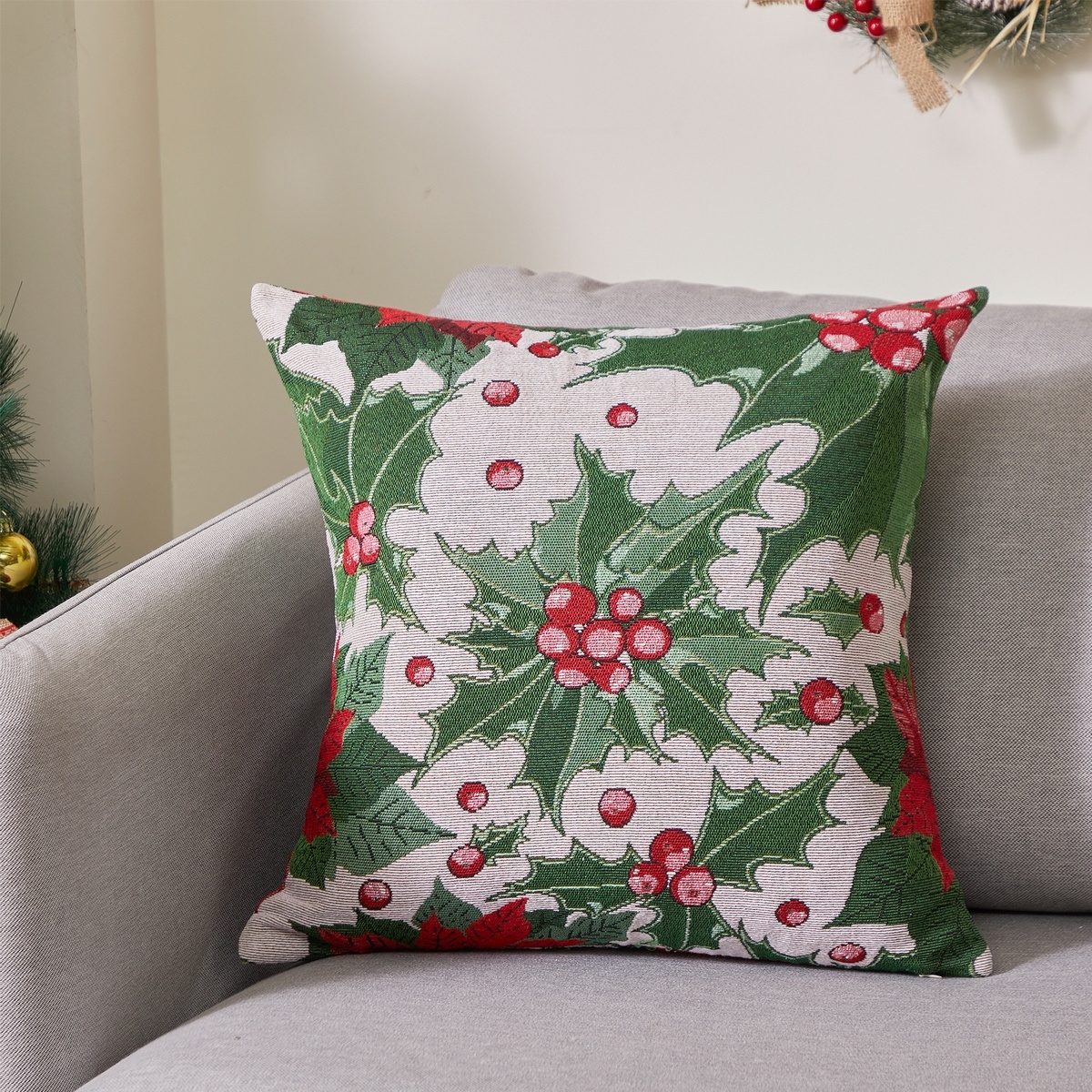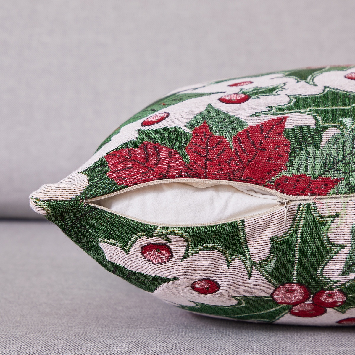 Perfektná sviatočná atmosféra ako mávnutím prútika. Dekoračná obliečka na vankúšik v tradičnom gobelínovom vzhľade skvele doplní výzdobu vášho domova. Motív cezmíny na béžovom podklade bude krásnym detailom pre dokonale zladený vianočný interiér. Kvalitný materiál je veľmi príjemný na dotyk a zaručí ľahkú údržbu. Motív je z oboch strán rovnaký, zapínanie na skrytý zips.