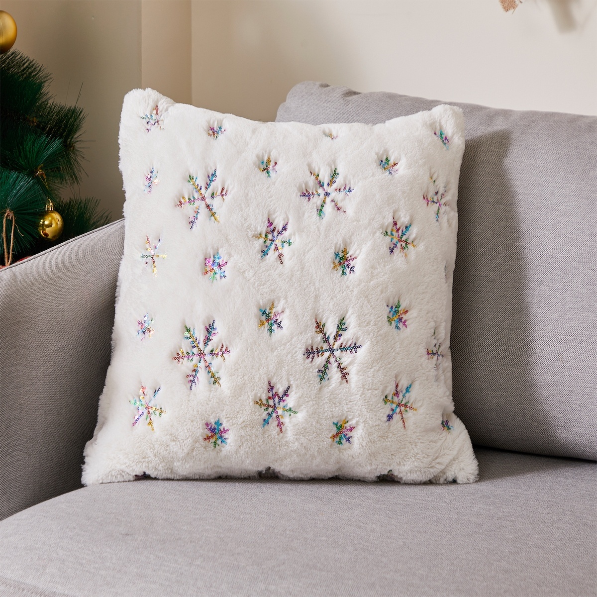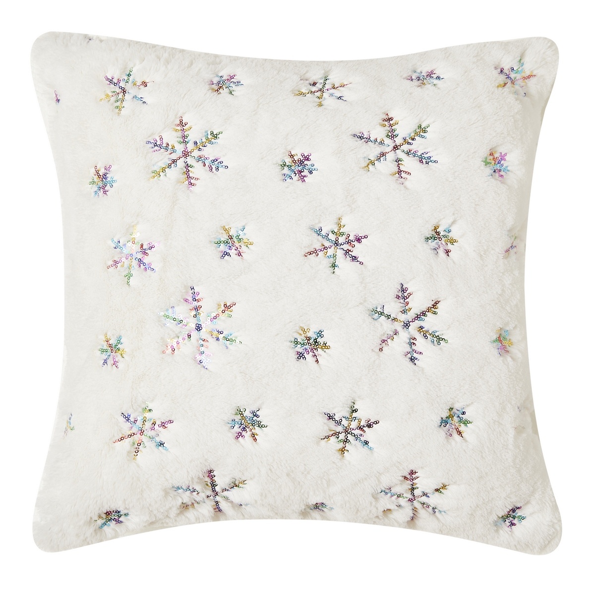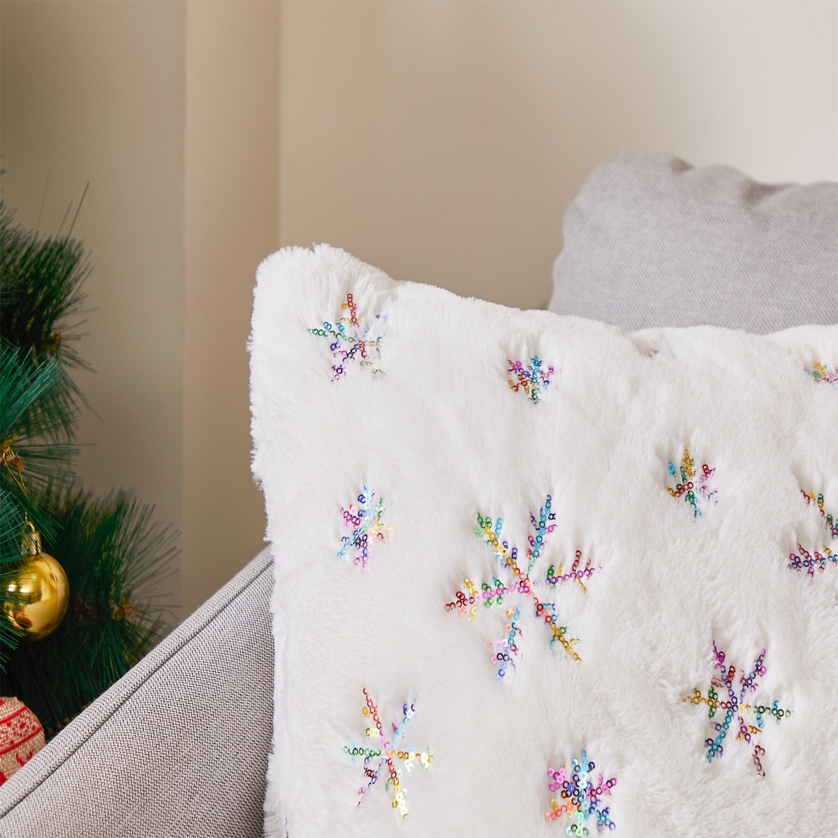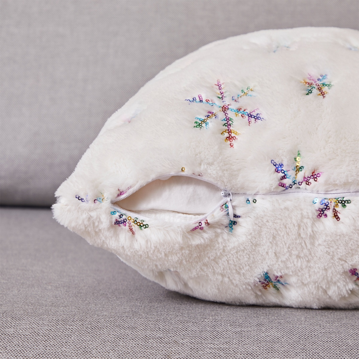 Hravý obliečka na vankúšik pre perfektnú zimnú výzdobu vášho domova. Mäkučký chlpatý materiál a hravý dizajn s lesklými dúhovými snehovými vločkami po celej ploche obliečky navodia doslova rozprávkovú atmosféru. Hebký materiál je veľmi príjemný na dotyk, motív je z oboch strán rovnaký, zapínanie na skrytý zips.Upozorňujeme na chybu etikety, kde je uvedené pranie na 40 °C. Obliečku na vankúšik odporúčame prať ručne a naruby.