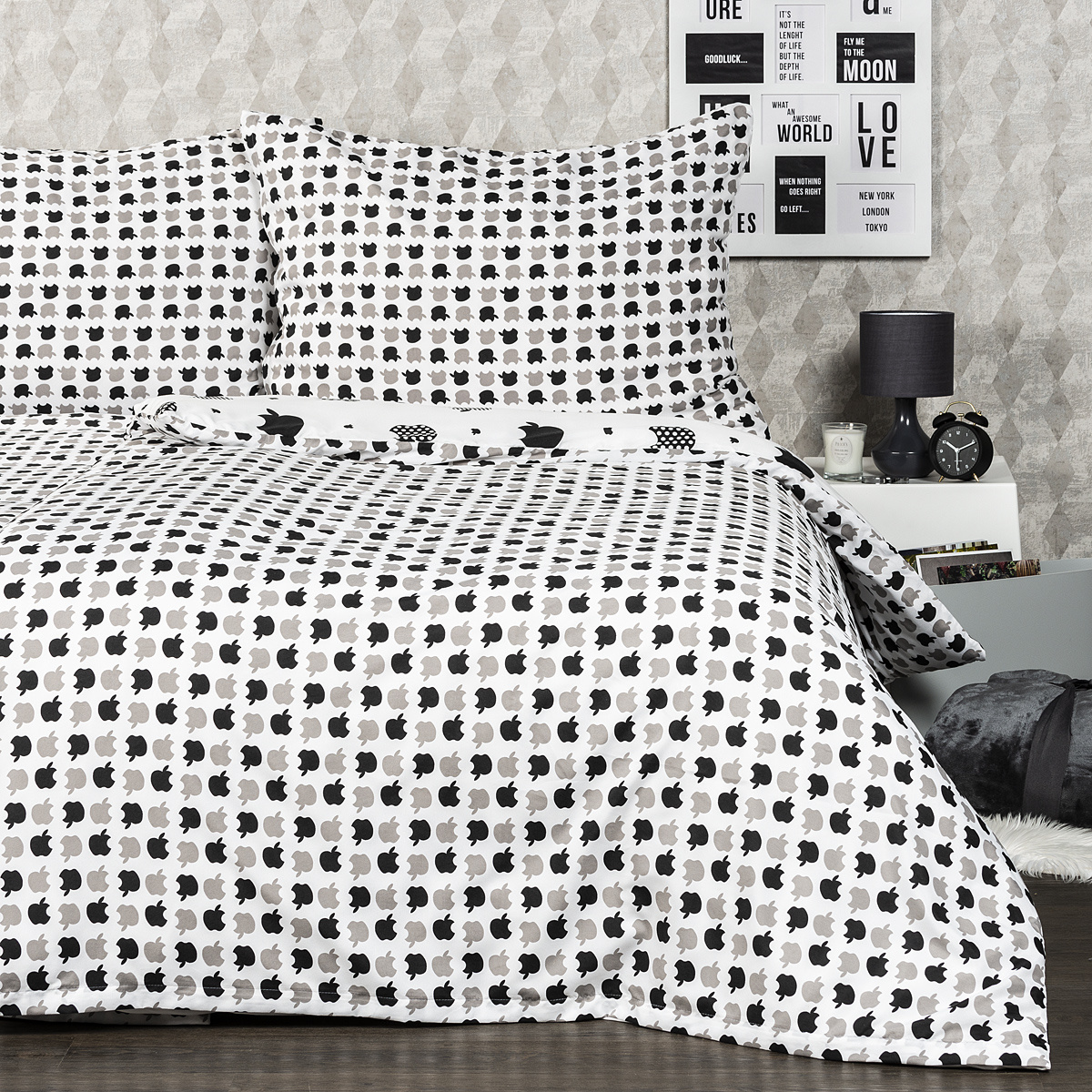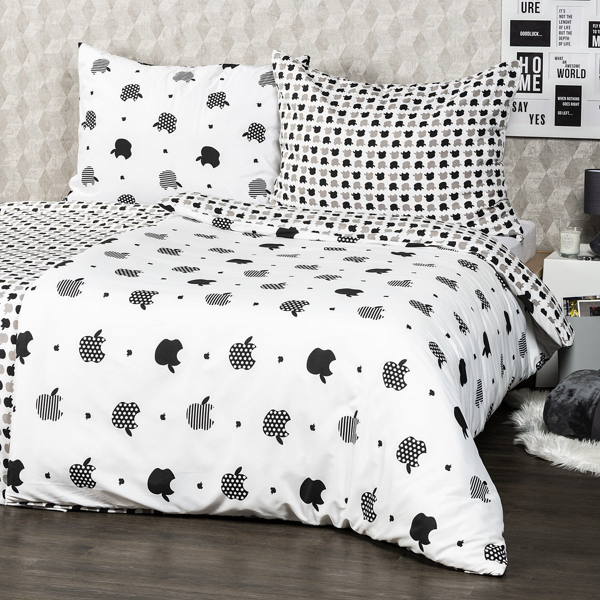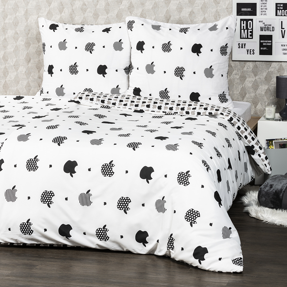 Štýlové obliečky z mikrovlákna pre všetkých milovníkov jabĺčok. Doprajte si dizajnovú spálňu s hebkým obliečkami, ktoré potešia aj toho najnáročnejšieho spáča. Jednoduchá čiernobiela farebnosť a obojstranné prevedenie dodávajú obliečkam luxusný vzhľad. Z jednej strany nájdete väčší a z druhej drobnejší vzor, vzhľad postele tak môžete meniť každý deň. Motív jabĺčok navyše zdobia drobné bodky, takže im určite odpustíte, že už sú trochu zahryznuté. Hladké mikrovlákno je veľmi príjemné na dotyk, pripomína totiž svojou štruktúrou hodváb. Je ľahučké, hebké a zachováva si dlho krásne sýte farby. Výhodou je aj jednoduchá údržba, pretože veľmi rýchlo schne, málo sa krčí a nežmolkuje.Súprava obsahuje: