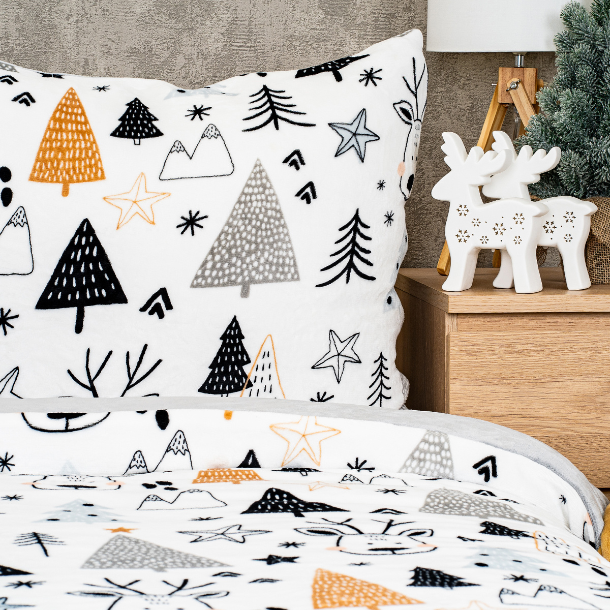 Zababušte sa do jemných obliečok z mikroflanelu a užite si zimu pekne v teple. Motív s veselými zimnými prvkami, ako sú stromčeky, hviezdy a sobíci, vytvára útulnú atmosféru, ktorá vám zaručene spríjemní odpočinok a dodá spálni sviatočný nádych. Vzor v neutrálnych a teplých odtieňoch sivej, čiernej a bielej sa ľahko zladí s rôznymi interiérmi.