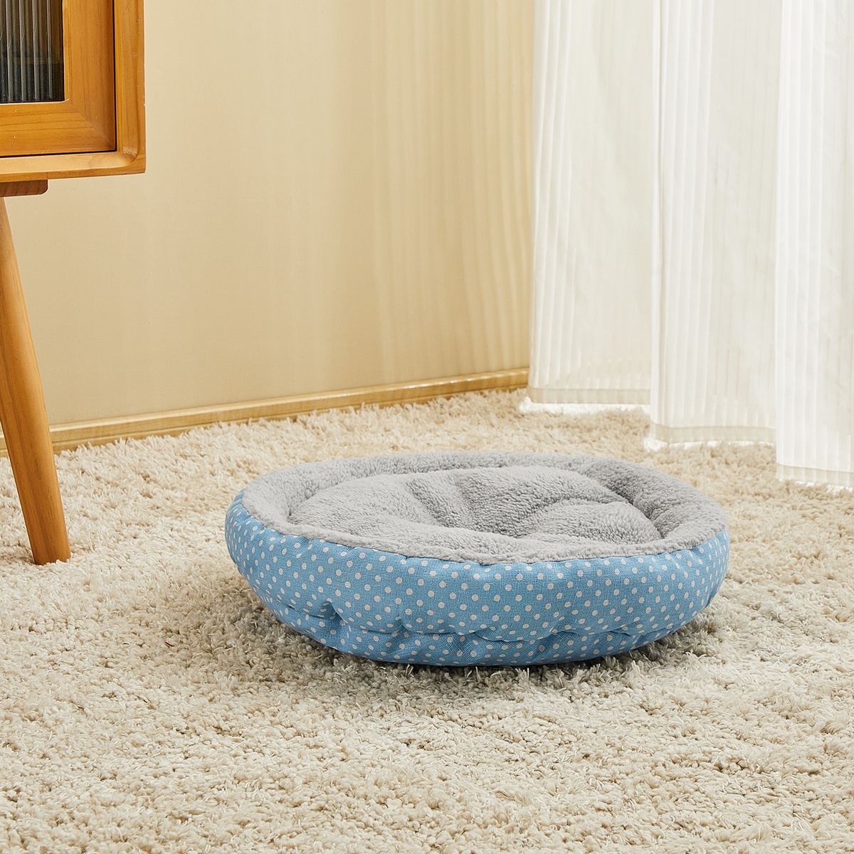 Doprajte svojmu štvornohému priateľovi ten najpohodlnejší odpočinok. Tento okrúhly pelech má hebký plyšový povrch a mäkké polstrovanie, ktoré priamo nabáda stočiť sa v ňom do klbka. Vďaka svetlo modrej farbe s jemným vzorom bodiek bude navyše veselým doplnkom vašej domácnosti.Pelech má priemer 45 cm a je vhodný pre menšie plemená psov (do 5 kg) aj pre mačky.