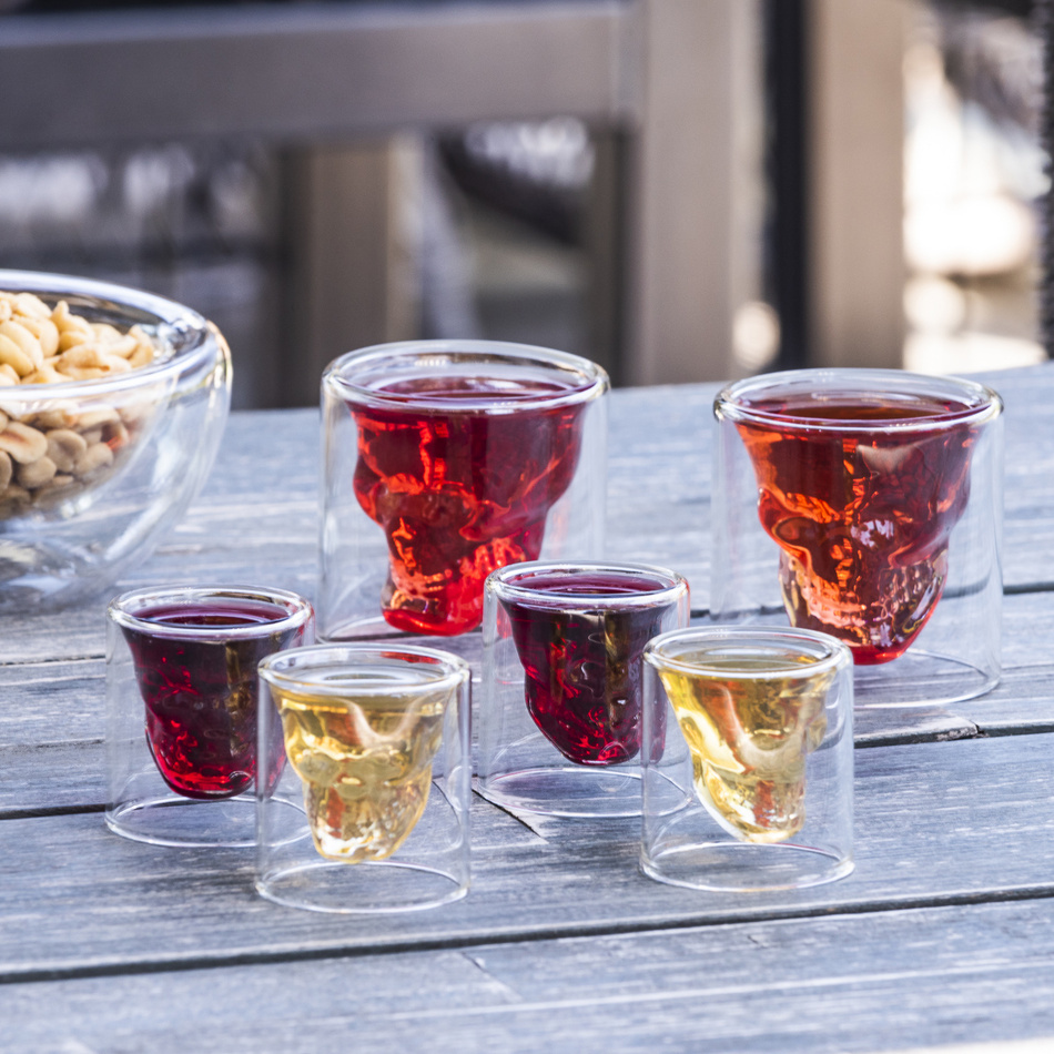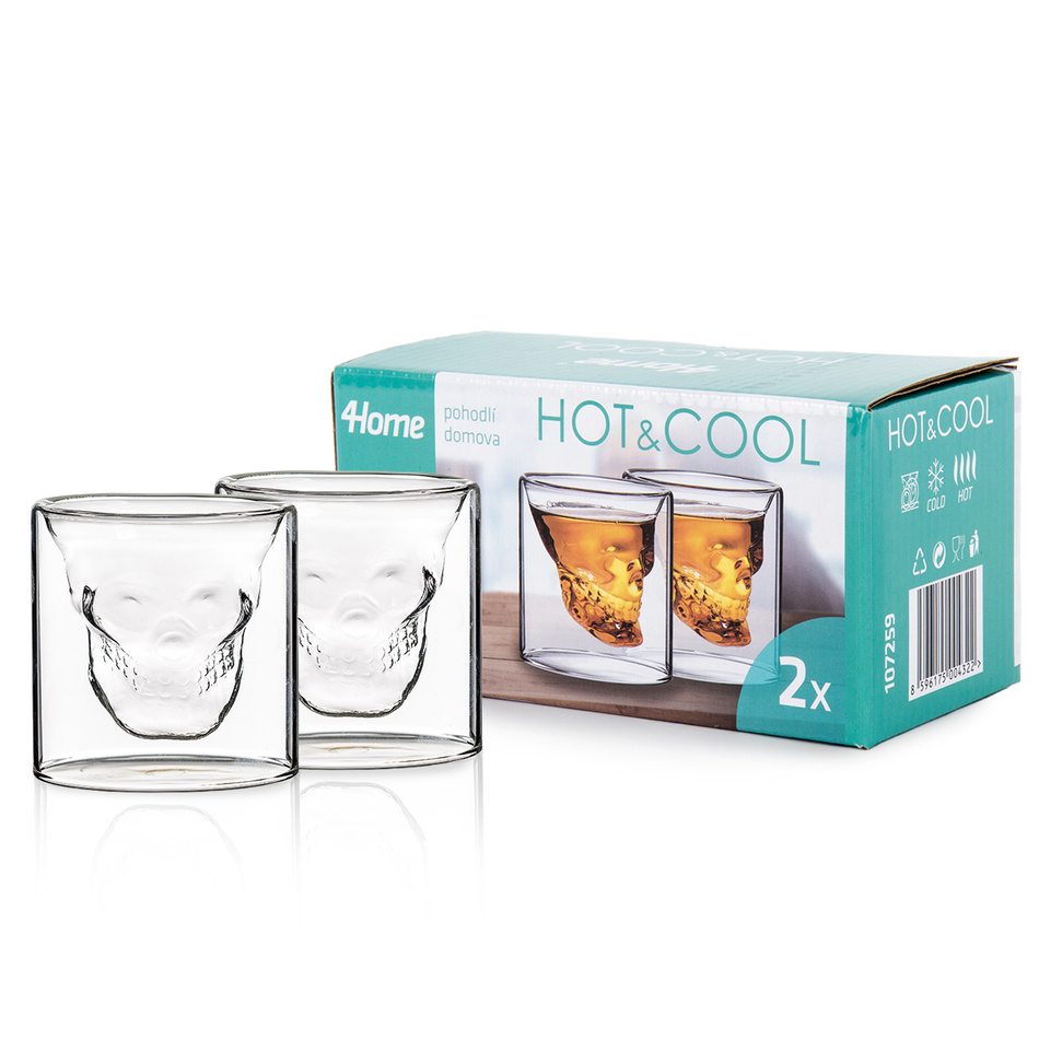 Originálne poldecáky s tvarom lebky zaručene spestria každú oslavu i párty a sú vhodné aj ako skvelý darček pre vašich priateľov i blízkych. Vďaka dômyselne prepracovanému dizajnu môžete svoj obľúbený drink vnímať všetkými zmyslami.Poháre sú ručne vyrábané z ľahkého žiaruvzdorného borosilikátového skla, ktoré je dokonale priehľadné a skvele znáša vysoké aj nízke teploty. Navyše má oproti tradičnému sklu vyššiu odolnosť voči mechanickému poškodeniu a pôsobeniu chemikálií. Je preto vhodné pre podávanie teplých i studených nápojov.Výhody: