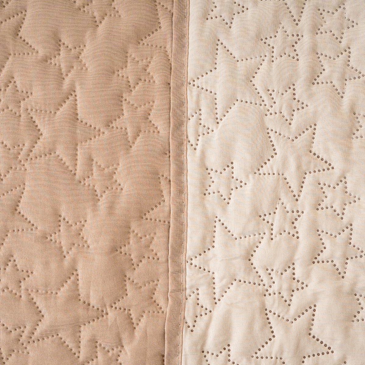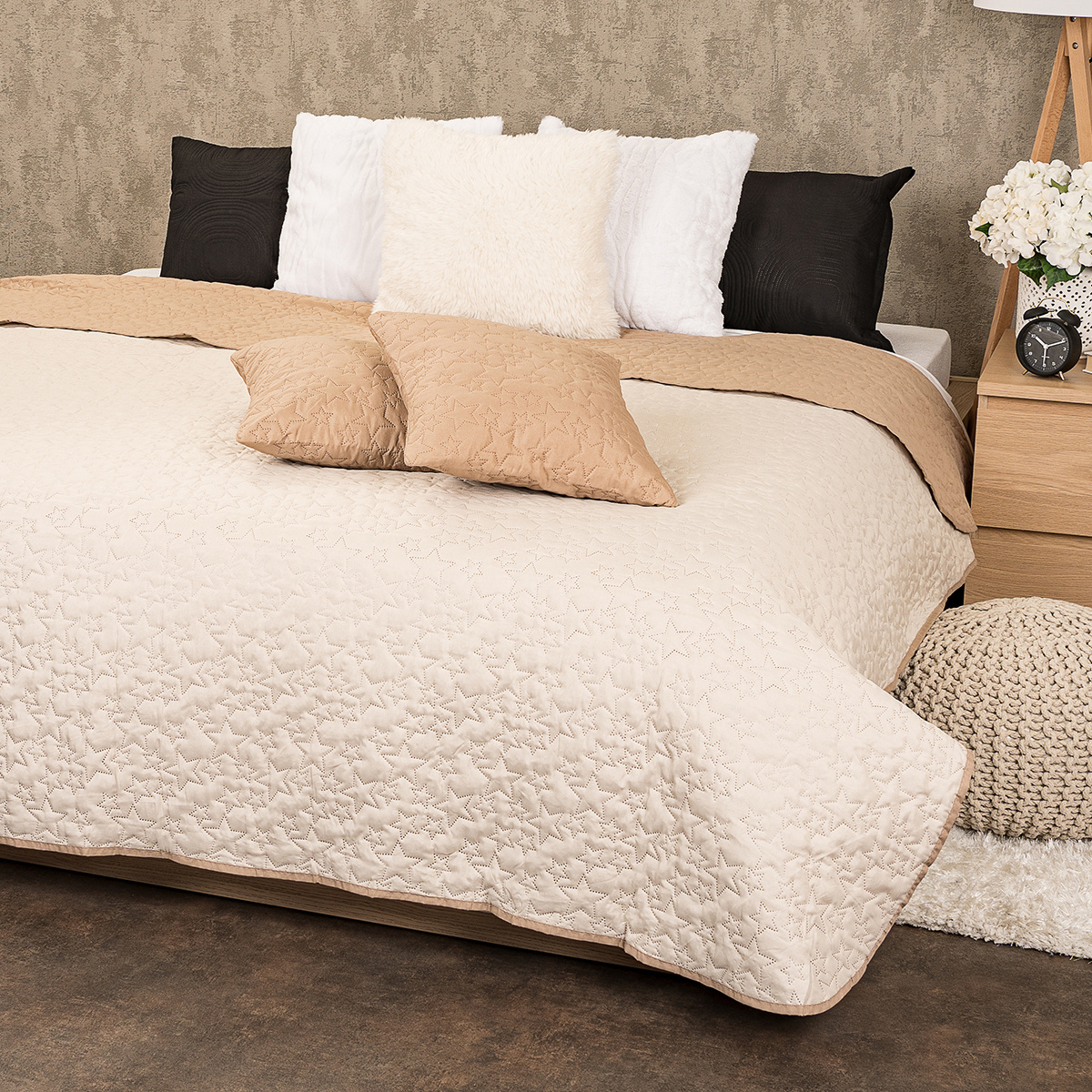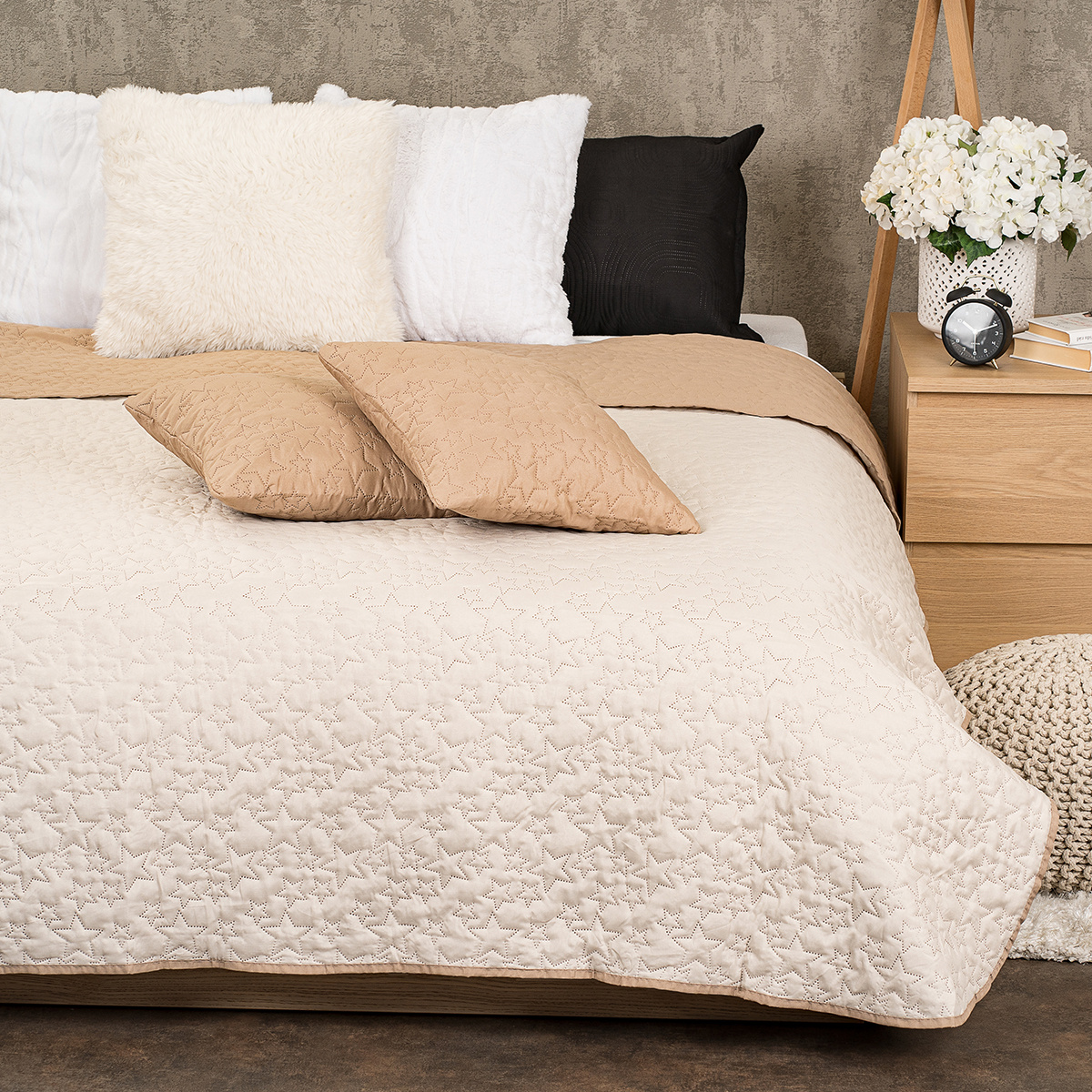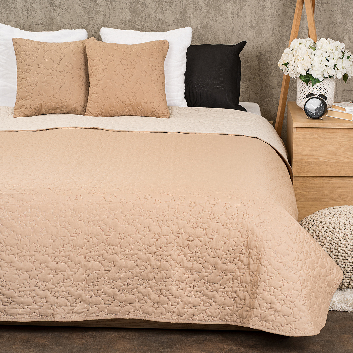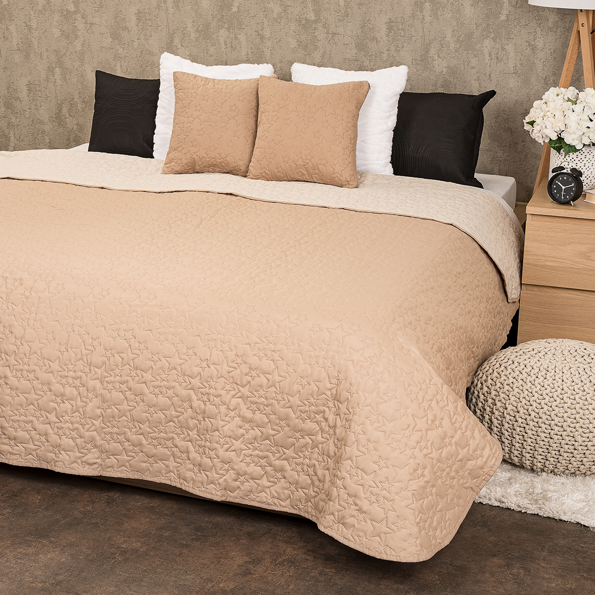 Originálny doplnok pre každú spálňu – to je elegantný obojstranný prehoz na posteľ s netradičným prešívaním v tvare hviezdičiek. Vďaka príjemnému farebnému prevedeniu v dvoch ladiacich odtieňoch béžovej dodá vášmu interiéru príjemné teplo domova. Obojstranné prevedenie ponúka vlastne dva prehozy v jednom – stačí si len zvoliť, na aký odtieň máte práve náladu.Prehoz ochráni vaše obliečky pred vyblednutím aj všadeprítomným prachom, a navyše bude vaša posteľ vždy rýchlo ustlaná. Mäkučký materiál s originálnym plastickým vzorom dokonale kopíruje tvar nábytku. Prehoz môžete tiež použiť ako veľkú deku, do ktorej sa zababuší celá rodina.Súčasťou balenia sú dve obliečky na vankúšiky s rovnakým vzorom ZADARMO.Sada obsahuje: