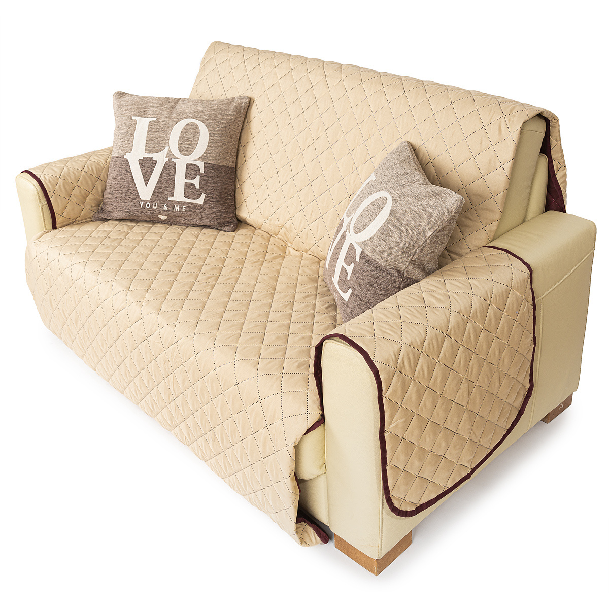 Vylaďte si obývaciu izbu k dokonalosti s prehozmi na sedaciu súpravu Doubleface. Prehozy sú z príjemného mäkkého materiálu s plastickým vzorom a skvele padnú na každé kreslo aj pohovku. Navyše sú obojstranné – v kombinácii štýlovej bordó a prírodnej béžovej – takže získate vlastne dva prehozy v jednom a farbu môžete meniť podľa nálady. Jednoduchý, ale originálny dizajn zaručí, že sa hodí do moderných i klasických interiérov. Materiál sa ľahko udržiava a rýchlo schne. Praktické prehozy Doubleface ochránia vašu sedaciu súpravu pred nečistotami a poškodením, prípadne jej dodajú nové kúzlo, ak už sa na nej podpísal zub času. Váš nábytok získa nový šmrnc a vy krásny aj praktický doplnok do svojho interiéru. Rozmery: