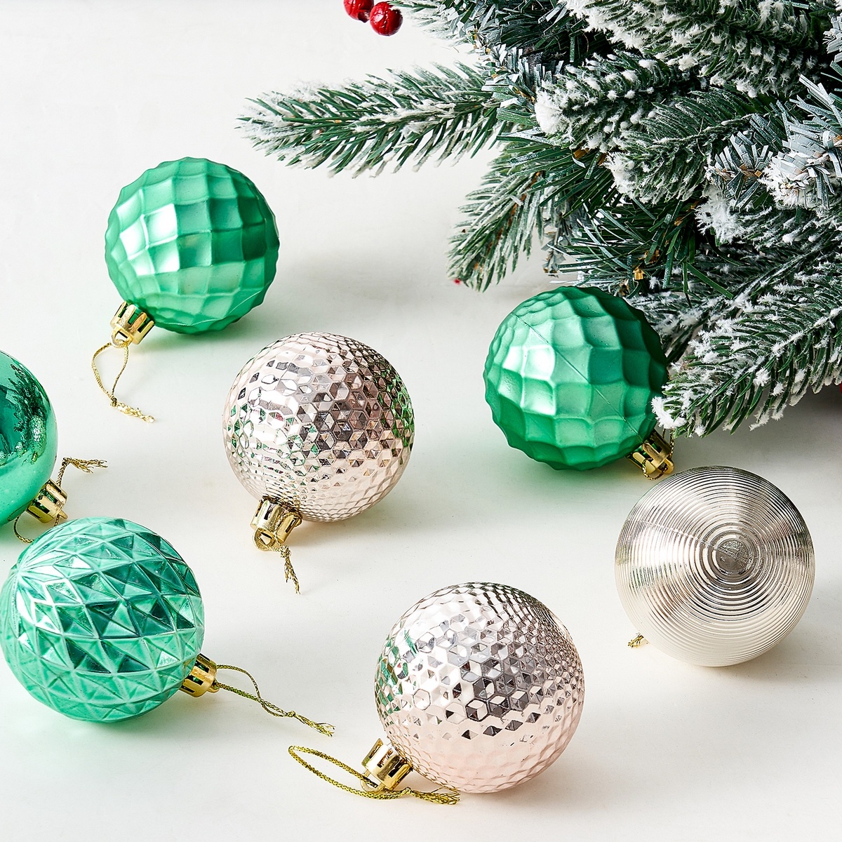 Táto nevšedná sada ozdôb kombinuje jemné pastelovo zelené a strieborné odtiene, ktoré dodajú každému vianočnému stromčeku moderný vzhľad, ktorý zaujme na prvý pohľad a vnesie do vášho domova slávnostnú atmosféru. Súprava obsahuje guľôčky s rôznymi textúrami a vzormi, ktoré vytvárajú originálny a dynamický vzhľad. Skvele sa hodí na zdobenie nielen vianočného stromčeka, ale aj girland alebo väčších vianočných vencov.Kvalitné plastové prevedenie zaistí dlhú životnosť, vďaka čomu vám budú skvele slúžiť po mnoho rokov. Každá ozdoba je opatrená očkom a povrázkom pre ľahké zavesenie.Balenie obsahuje 25 guľôčok s priemerom 6 cm.