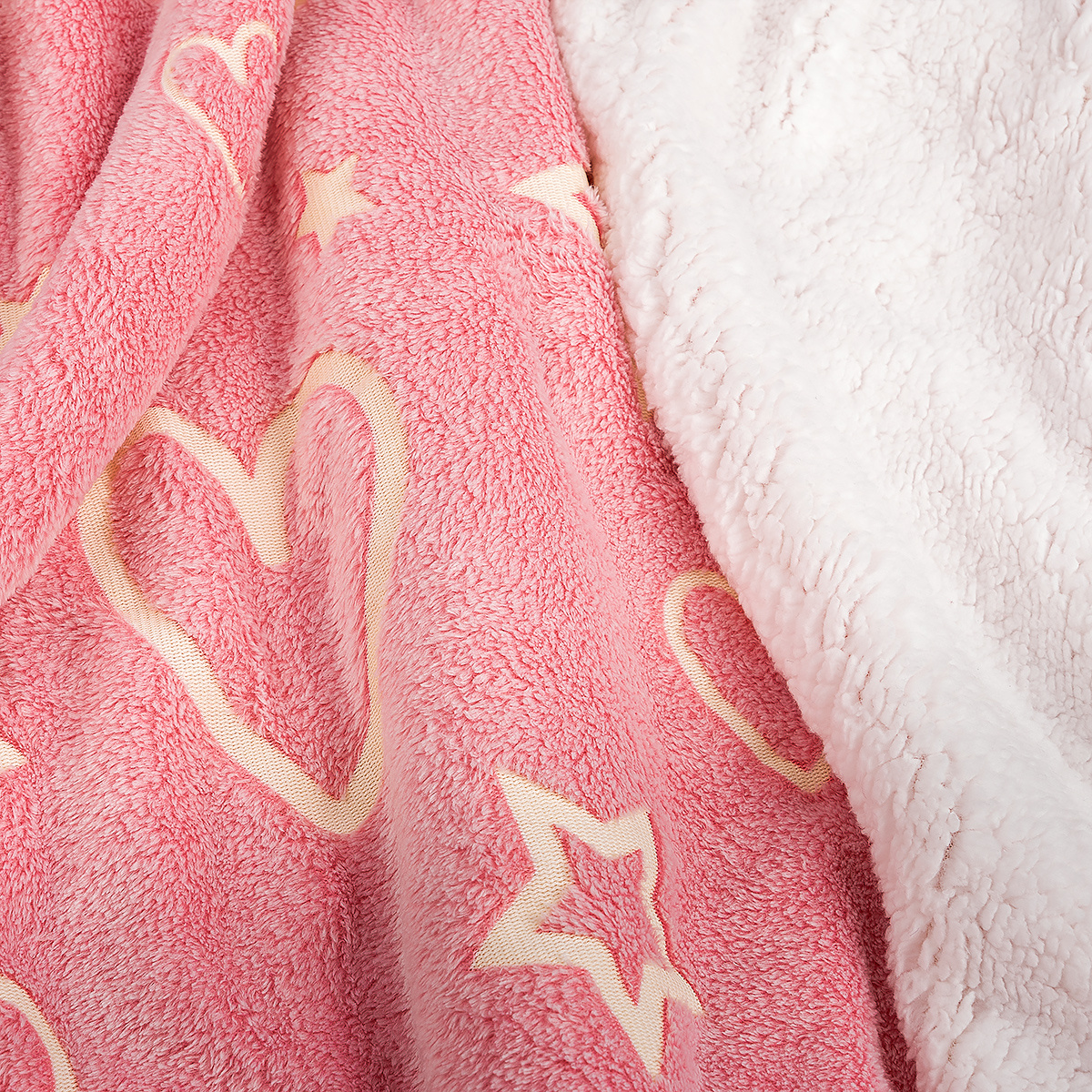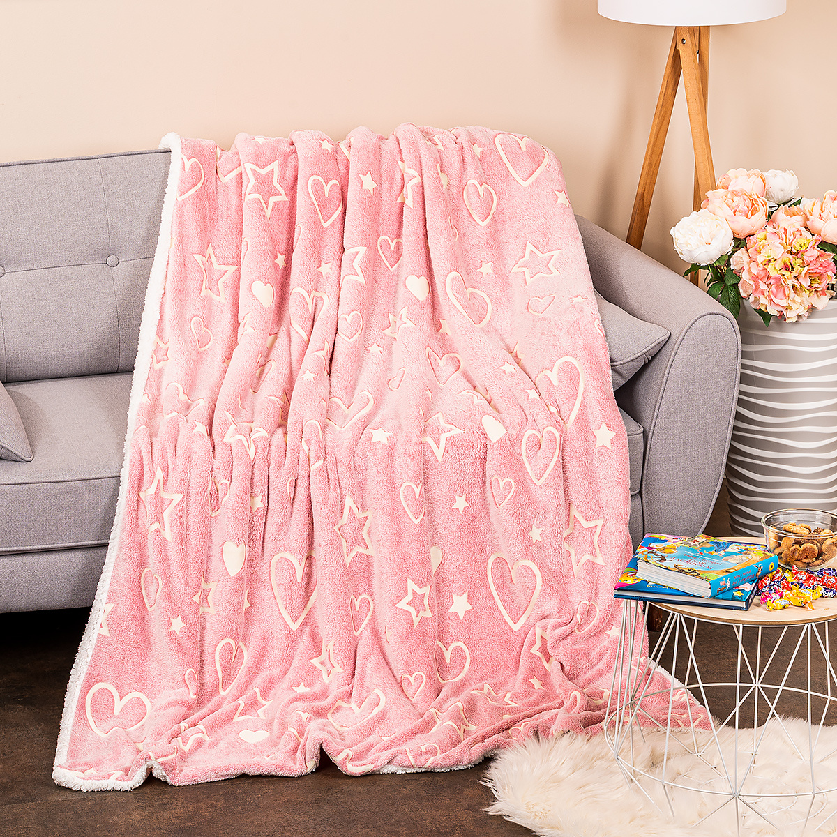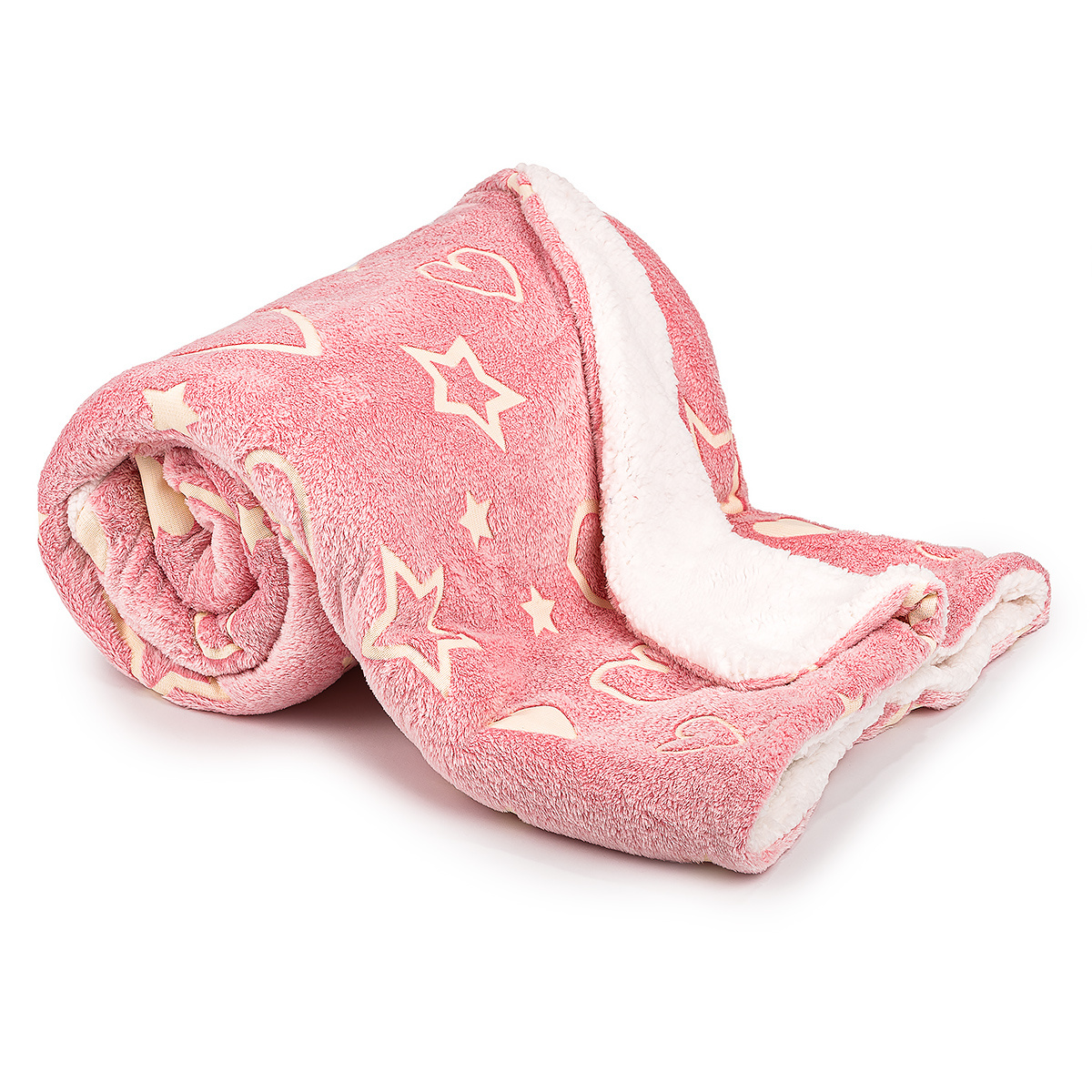 Svietiaca baránková deka pre pohodové chvíľky plné romantiky. Zababušte sa do hrejivého baránka s obľúbenou šálkou čaju a užite si chladné dni v dokonalej harmónii. Kúzelný vzor srdiečok a hviezdičiek na ružovom podklade navyše v tme …