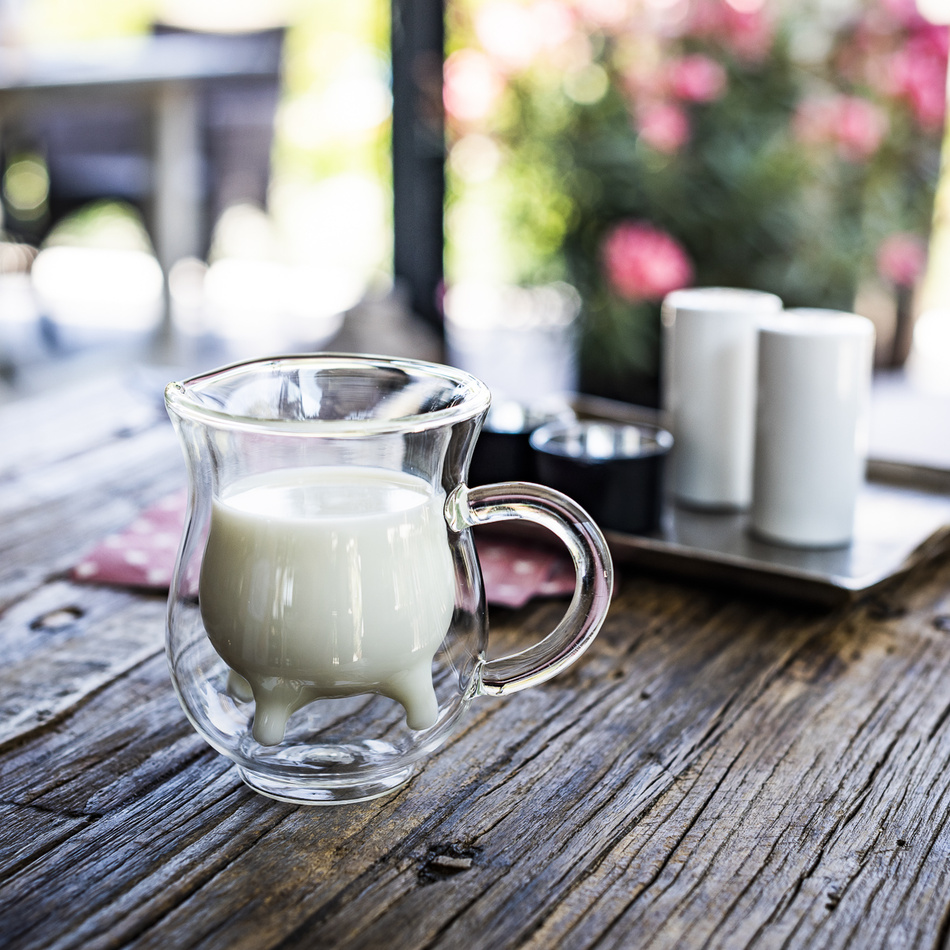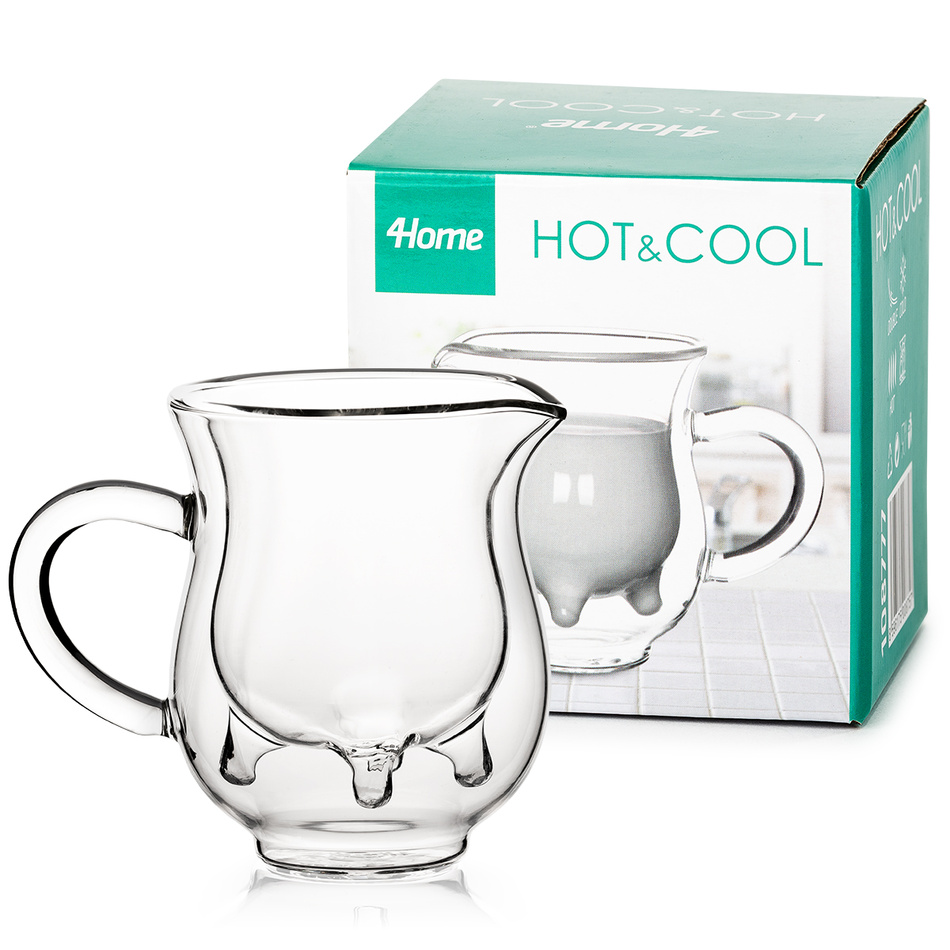 Zabudnite na obyčajné nudné mliekovky a naservírujte svojim hosťom mlieko ku káve rovno z „kravského vemienka“. Originálna mliekovka Moo má špeciálne tvarovanú vnútornú časť a vďaka nevšednému designu zaručene zaujme aj pobaví všetkých vašich hostí. Dvojitá stena a termo prevedenie navyše udržia mlieko správne vychladené dlhú dobu. Kolekcia Hot&Cool je úplne jedinečným doplnkom pre každodenné i slávnostné stolovanie a tiež skvelým nápadom na darček.Mliekovka je ručne vyrobená z ľahkého žiaruvzdorného borosilikátového skla s dvojitou stenou, ktorá vďaka vytvorenému vákuu dokáže dlho udržať ideálnu teplotu a neprenáša teplo ani chlad na vonkajšiu stenu. Výhodou borosilikátového skla oproti sklu tradičnému je jeho vysoká odolnosť voči vysokým a nízkym teplotám, mechanickému poškodeniu a pôsobeniu chemikálií.Vlastnosti: