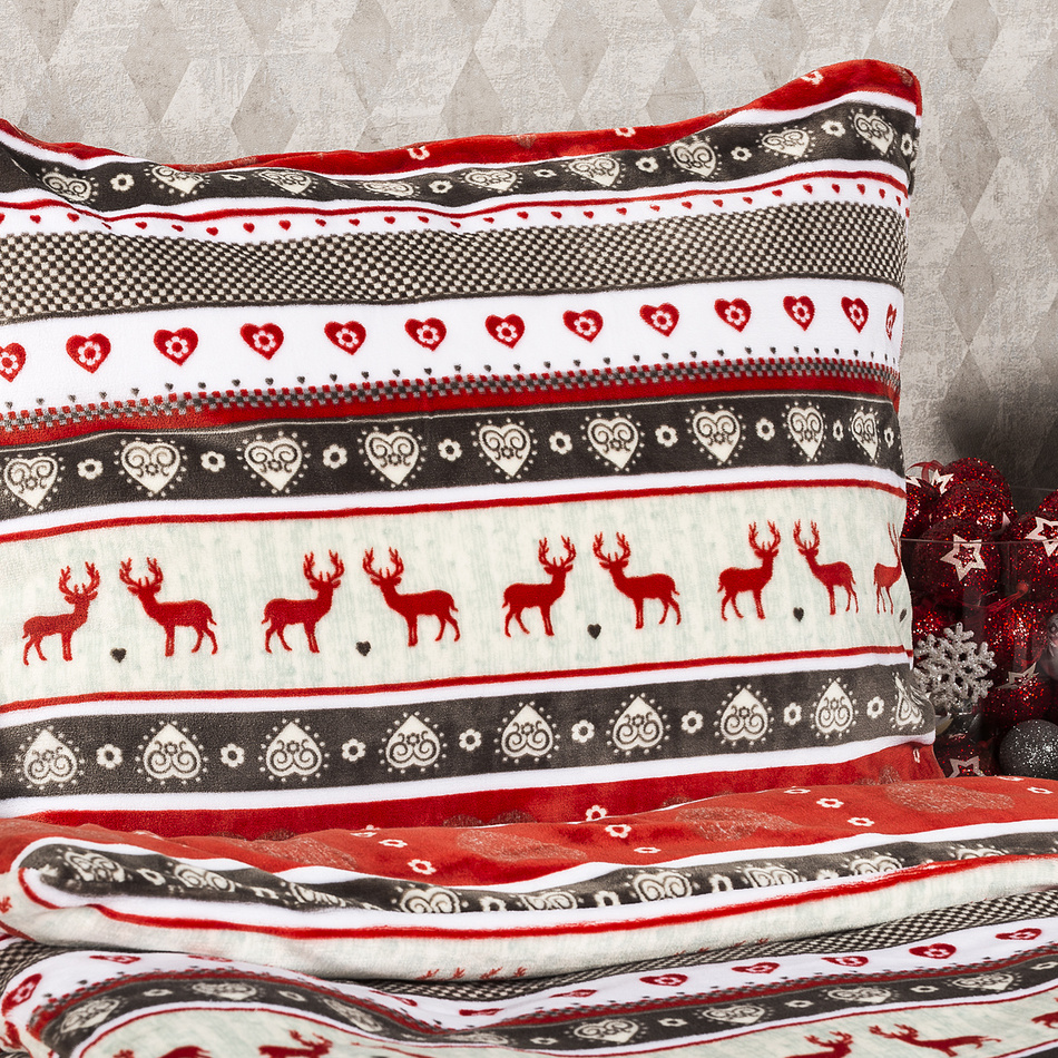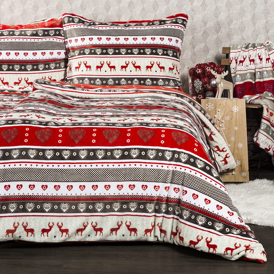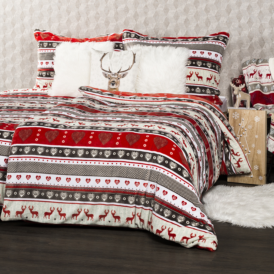 Štýlová zimná výbava do každej spálne! Exkluzívne hrejivé obliečky Winter s obľúbenými sobmi a romantickými srdiečkami doladia váš domov do obľúbeného škandinávskeho štýlu a zaručia, že si chladné zimné noci budete doslova užívať. Hrejivá kombinácia farieb aj veselý motív doslova pozývajú k zababušeniu i relaxácii a vykúzlia úsmev na tvári vám i vašim deťom. Extra jemné a mäkučké obliečky z mikroflanelu prinesú ten najpohodlnejší spánok aj v najväčších mrazoch a zahrejú každého zmrzlíka.Obliečky sú strihané z metráže. Súprava obsahuje: