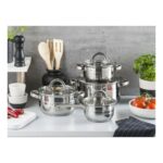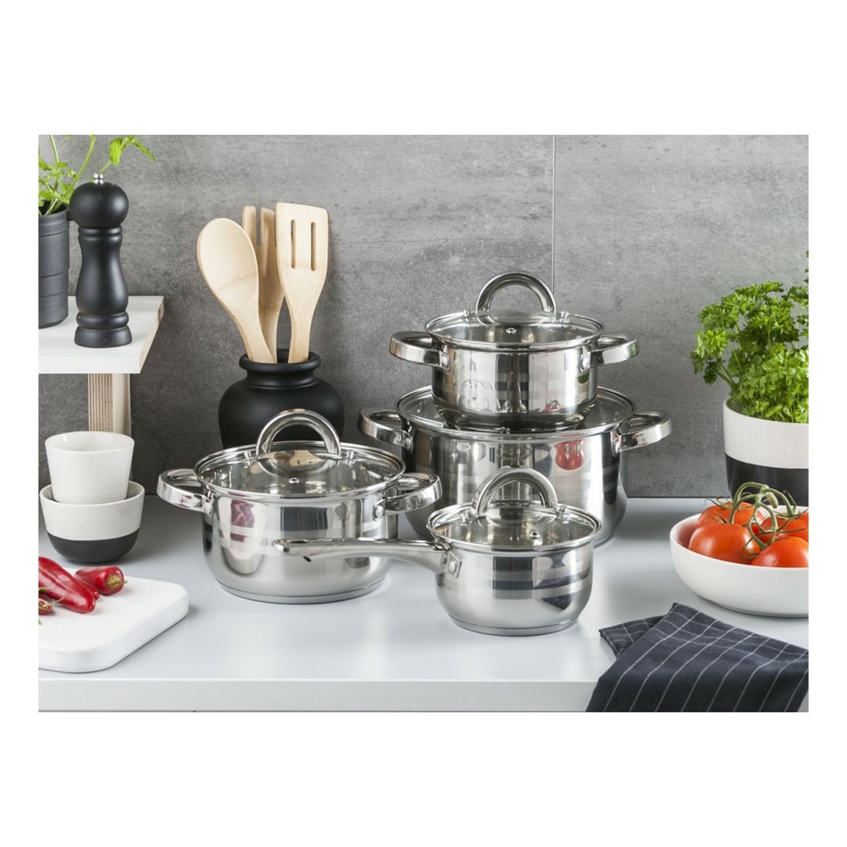 8-dielnu sadu riadu Remo využijete pri každodennom varení. Sada riadu je vyrobená z nehrdzavejúcej ocele s priehľadnou sklenenou pokrievkou s otvorom pre odvod pary a nehrdzavejúcimi úchytkami. Nehrdzavejúci riad je vhodný na umývanie v umývačke riadu, však časté umývanie za použitia dlhých programov a agresívnych umývacích prostriedkov môže spôsobiť neodstrániteľné zmeny na povrchu.
