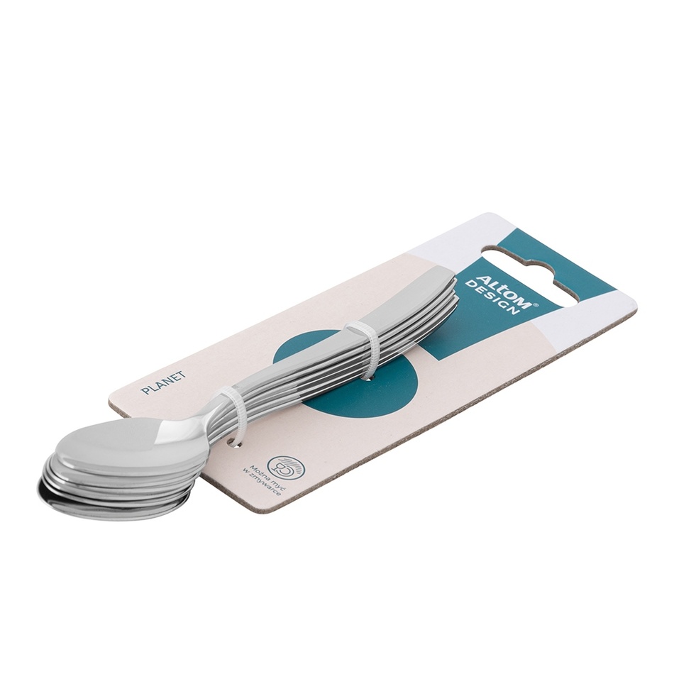 Čajové lyžičky Planet sú ideálne pre váš rituál pitia čaju. Nehrdzavejúce príbory sú kombináciou klasického a moderného štýlu, doplnia každú párty a urobia z každodenného jedla jedinečný estetický zážitok. Vyberte si odolnosť, pohodlie a nemennú eleganciu príborov Planet od Altom Design a posuňte svoj stôl na novú úroveň luxusu.Strieborný lesk lyžičiek im dodáva mimoriadnu eleganciu. Ich minimalistický dizajn zdôrazňuje ich jedinečnosť. Sú vyrobené z nehrdzavejúcej ocele, sú odolné voči škvrnám a korózii, takže si zachovajú svoje kúzlo aj po mnohých čajoch.Lyžičky sú navrhnuté tak, aby perfektne padli do vašich rúk. Vyvážený tvar a proporcie zaručujú pohodlné používanie. Sú perfektné nielen na miešanie čaju, ale aj na iné nápoje a dezerty.Lyžičky sa ľahko udržujú v čistote – stačí ich umyť a usušiť a dlho si zachovajú svoj oslnivý vzhľad.Sú vhodné do umývačky riadu.