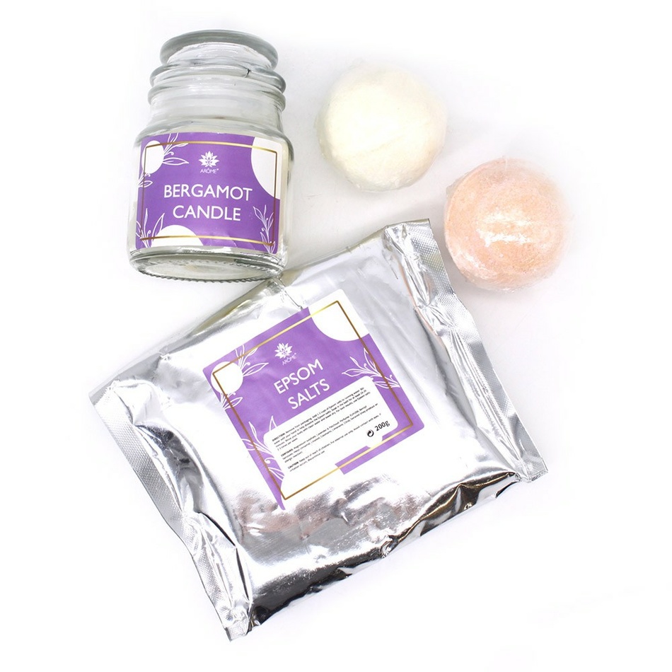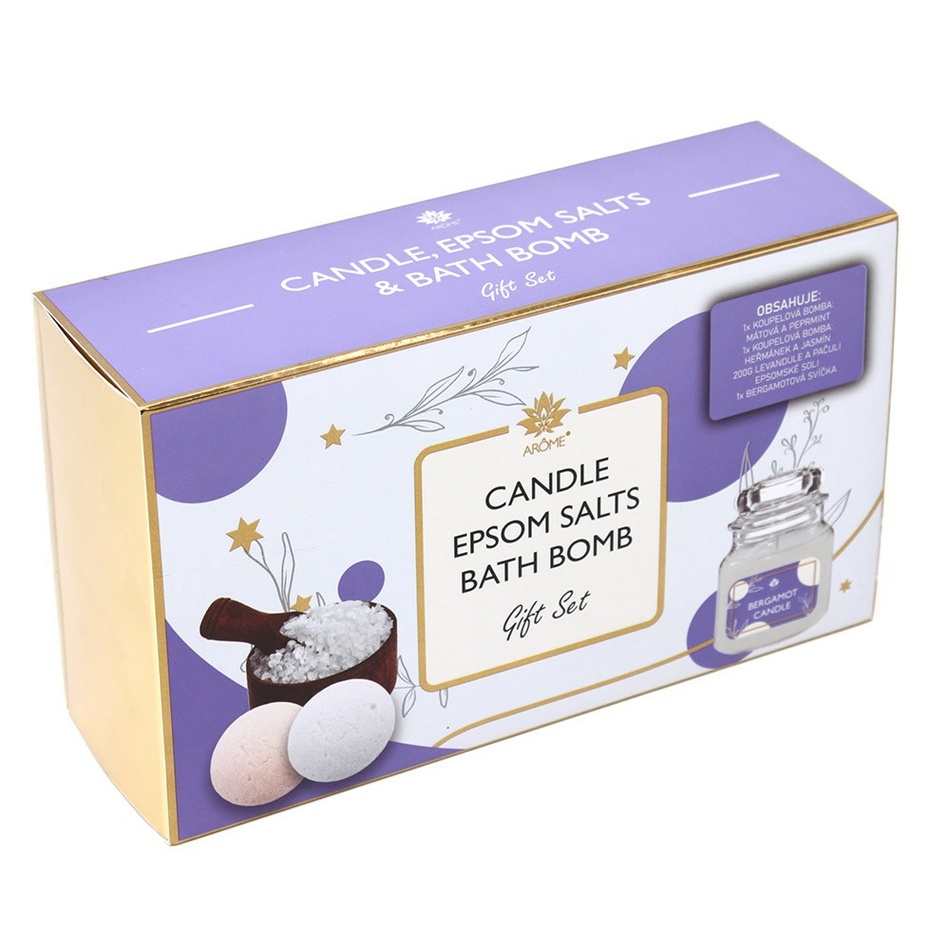 1x vonná sviečka s vôňou bergamotu, 85 g, doba horenia až 20 hodínKúpeľovú bombu stačí pridať do teplej tečúcej kúpeľovej vody a môžete si užívať príjemnú šumivú vôňu.Epsonská soľ má pozitívne účinky na telo, zmierňuje stres a hydratuje pokožku. Použitie epsonskej soli je ľahké, stačí pridať do kúpeľa a rukou rozmiešať, aby sa lepšie rozpustila.Vonná sviečka s vôňou bergamotu pomôže navodiť relaxačnú atmosféru a prevonia celú kúpeľňu alebo obývaciu izbu.Súprava je balená v darčekovej krabičke a je tak vhodná ako skvelý darček.