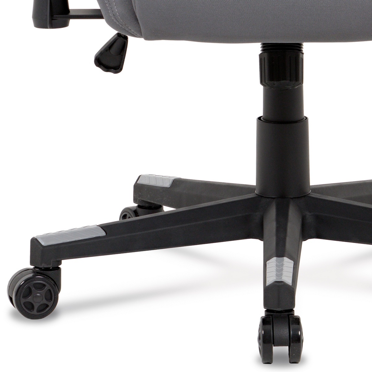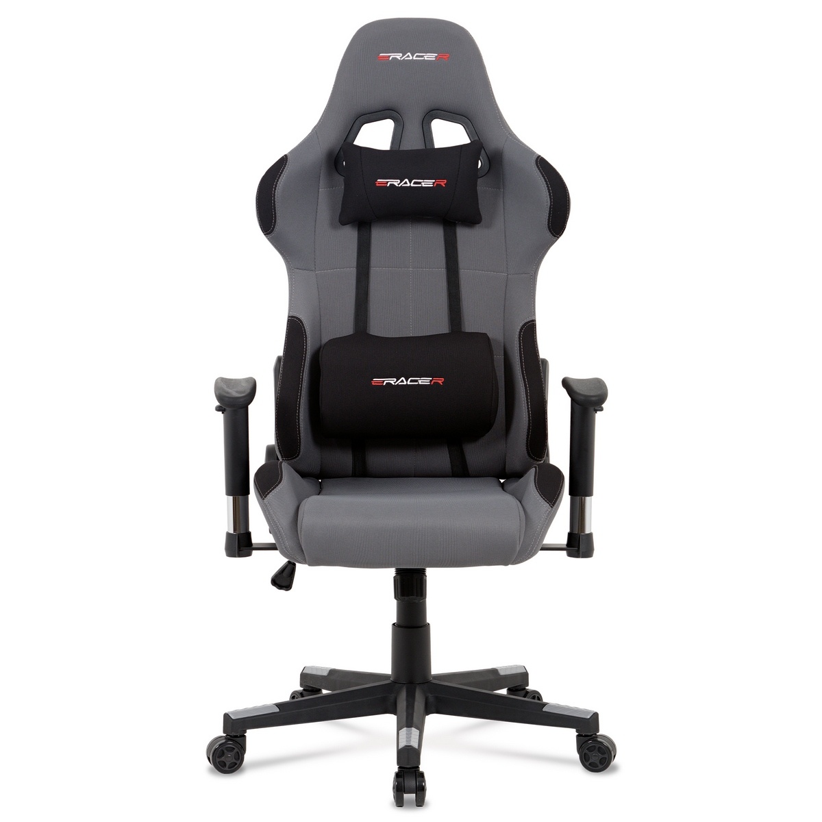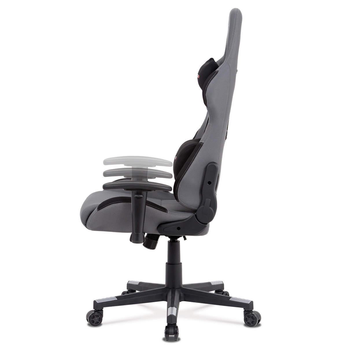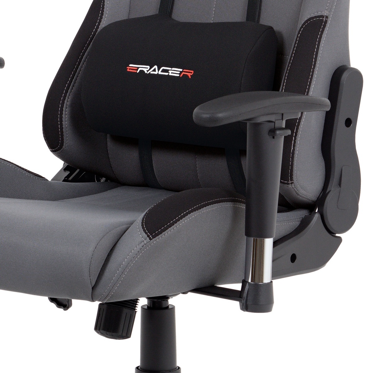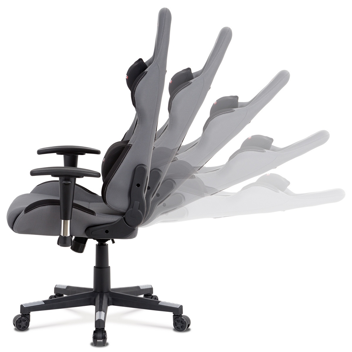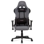 Kancelárska herná stolička v športovom dizajne v sivej látke s čiernymi detailmi sa stane nevyhnutným doplnkom každého pretekára. Polohovacie operadlo, ktoré je možné sklopiť na 180° a hojdací mechanizmus zaistia komfortné užívanie, rovnako tak aj bedrový vankúšik alebo vankúšik pod hlavu, ktoré je možné odopnúť. Stolička má tiež nastaviteľné podrúčky, plastový kríž a pogumované kolieska vhodné na tvrdé podlahy.