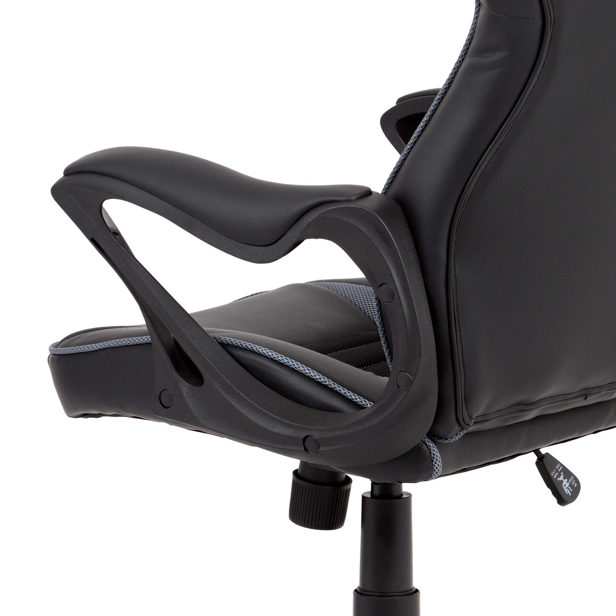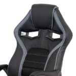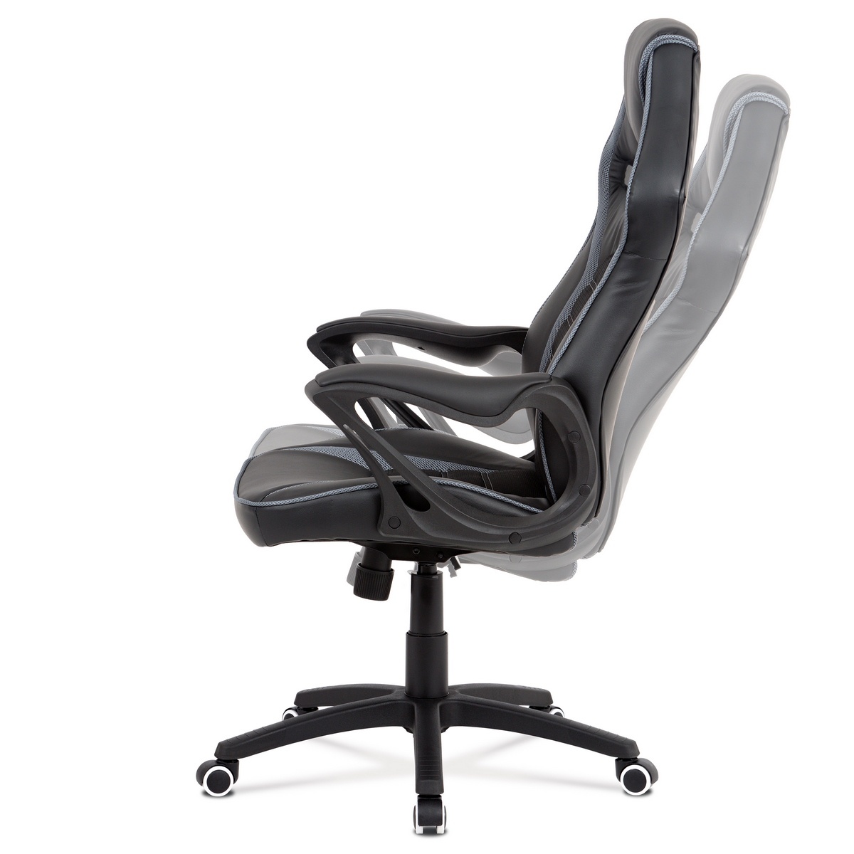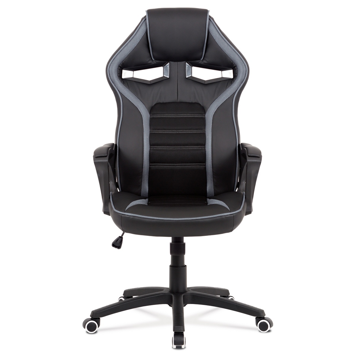 Herná kancelárska stolička potiahnutá čiernou ekokožou v kombinácii so sivou a čiernou látkou MESH v líniách sedáka i operadla. Výplň je z kvalitnej PU peny. Herný dizajn dodáva stoličke jedinečný vzhľad aj pohodlie, ktoré Vám budú závidieť ostatní hráči.Operadlo disponuje nielen pohodlným podhlavníkom, ale aj dvoma plastovými otvormi, ktoré pridávajú na štýlovom vzhľade závodného sedadla. Ruky si môžete pohodlne oprieť o pevné plastové podrúčky s dekoratívne profilovaným polstrovaním v čiernej ekokoži. Stolička má kríž z čierneho tvrdeného plastu, s protišmykovými prvkami a plastovými kolieskami vhodnými na tvrdé typy podláh (dlažba, parkety, plávajúce podlahy a pod.). Stolička je výškovo nastaviteľná, s hojdacím mechanizmom. Tuhosť pohupu upravujeme prednou masívnou skrutkou.