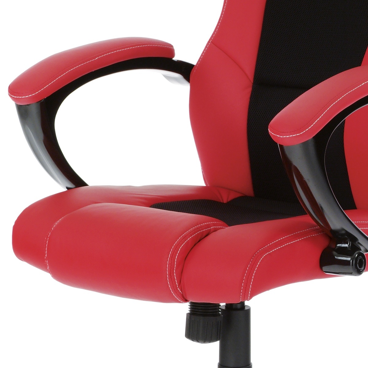 Ďalší z veľmi populárnych a luxusných modelov športových herných kresiel v dizajne sedačky závodného vozidla s výraznými zaoblenými líniami. Má skvelé ergonomické rozvrhnutie. Poťah je v kombinácii červenej ekokože a čiernej látky MESH, čím je zaistená jeho dobrá priedušnosť. Športové biele prešívanie je samozrejmosťou. Polstrovanie je z kvalitnej PU peny je zárukou pohodlného sedenia počas herných dní aj večerov. Ruky si môžete pohodlne položiť na polstrované podrúčky potiahnuté čiernou ekokožou a samozrejme s bielym obšitím. Ako bonus k tomuto kreslu sú plastové prvky v čiernom vysokom lesku.Kreslo je vybavené hojdacím mechanizmom. Sila hojdania sa reguluje plastovou skrutkou pod sedákom. Výška sedenia sa upravuje páčkou na pravej strane cez kvalitný plynový piest. Masívny plastový kríž s čiernymi protišmykovými doplnkami je osadený plastovými kolieskami na koberec.