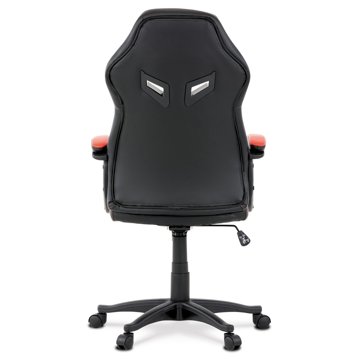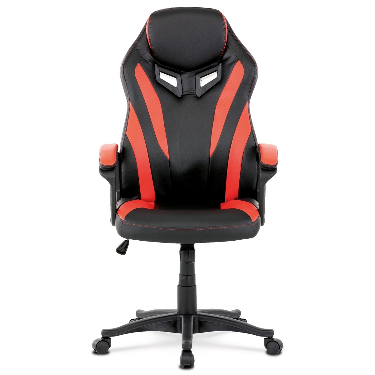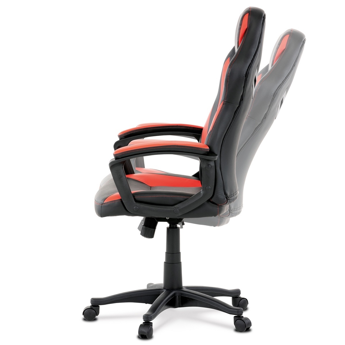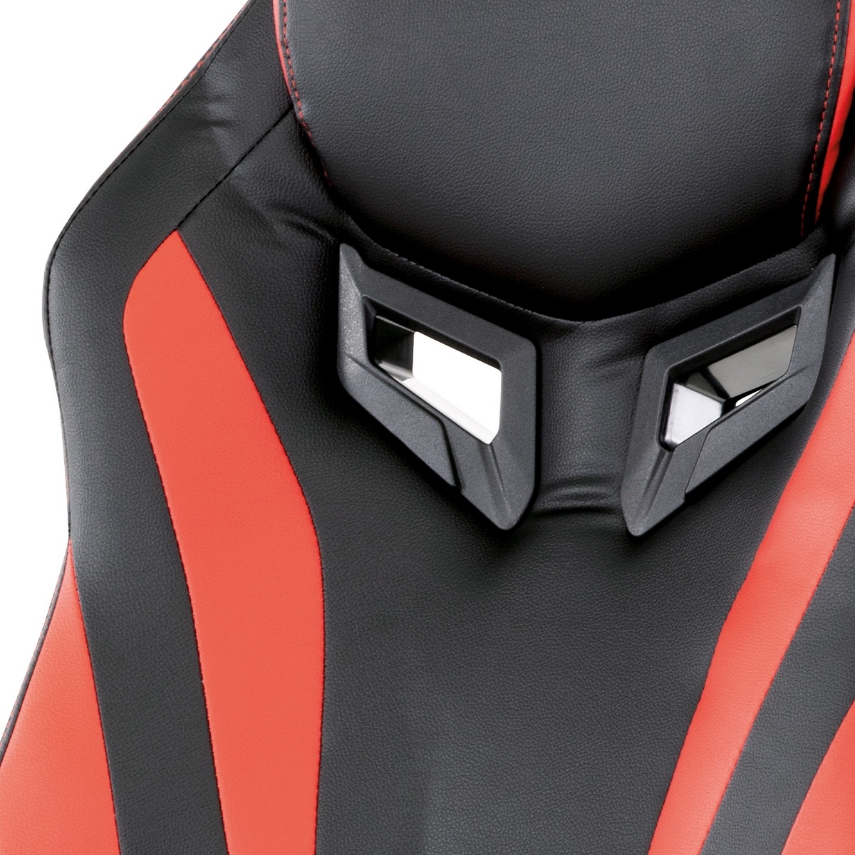Elegantná herná stolička v dizajne sedačky závodného vozidla v prevedení Dark Style so zaoblenými líniami vo výraznom kontraste s ostro rezanými rysmi plastového lemovania otvorov na „bezpečnostné pásy“. Tieto dizajnové otvory v hornej časti operadla dávajú nielen potrebný závodný vzhľad, ale aj uľahčujú manipuláciu. Poťah je kombinácia červenej a čiernej ekokože. Obvodové prešitie je v červenom odtieni. Polstrovanie je z kvalitnej PU peny.Stolička je vybavená hojdacím mechanizmom s nastavením protiváhy a aretáciou v základnej polohe. Tuhosť protiváhy je možné regulovať veľkou plastovou skrutkou, umiestnenou pod sedákom. Výška sedenia sa upravuje páčkou na pravej strane cez kvalitný plynový piest. Ruky unavené z hrania si môžete pohodlne položiť na plastové podrúčky, na ložnej ploche polstrované opäť červenou a čiernou ekokožou. Operadlo je vyššie s integrovanou statickou opierkou hlavy. Kríž je čierny plastový s priemerom 64 cm, čo zaisťuje výbornú stabilitu aj pri fyzicky náročnejších hrách. Kolieska sú plastové vhodné na koberce.
