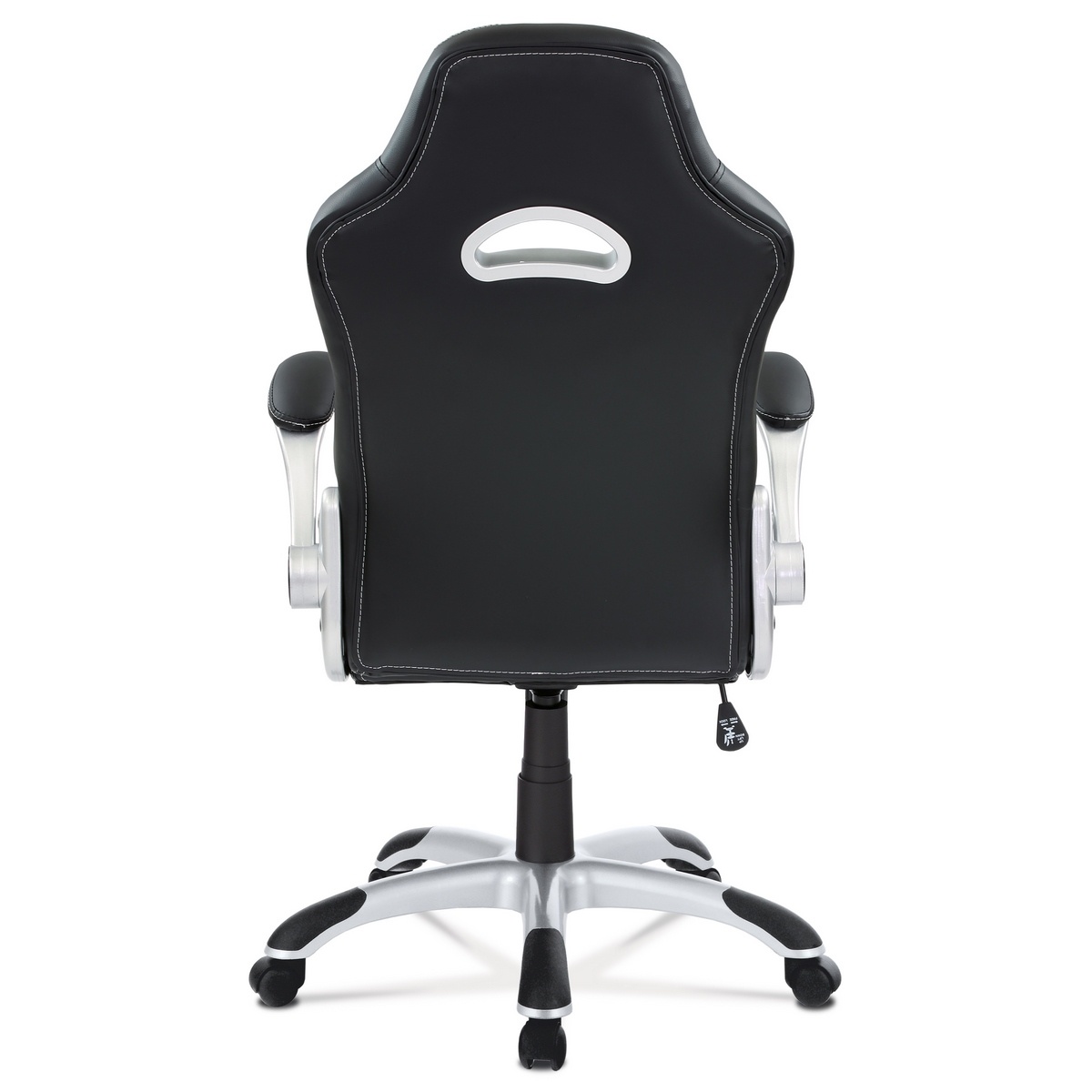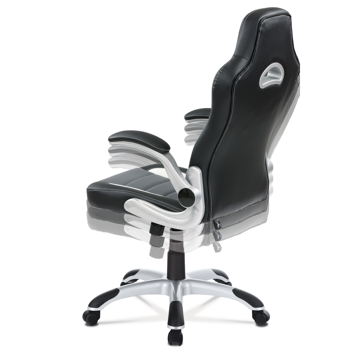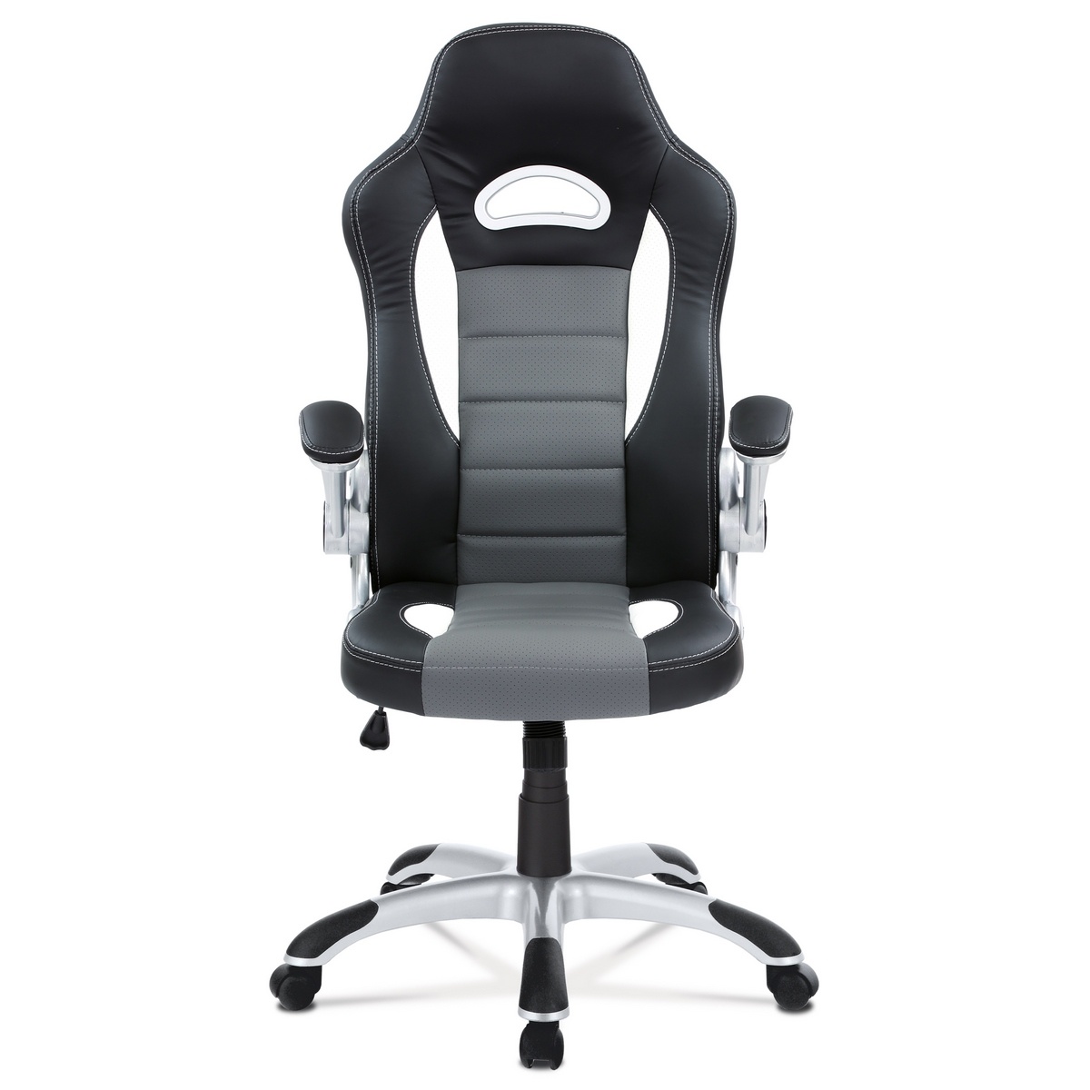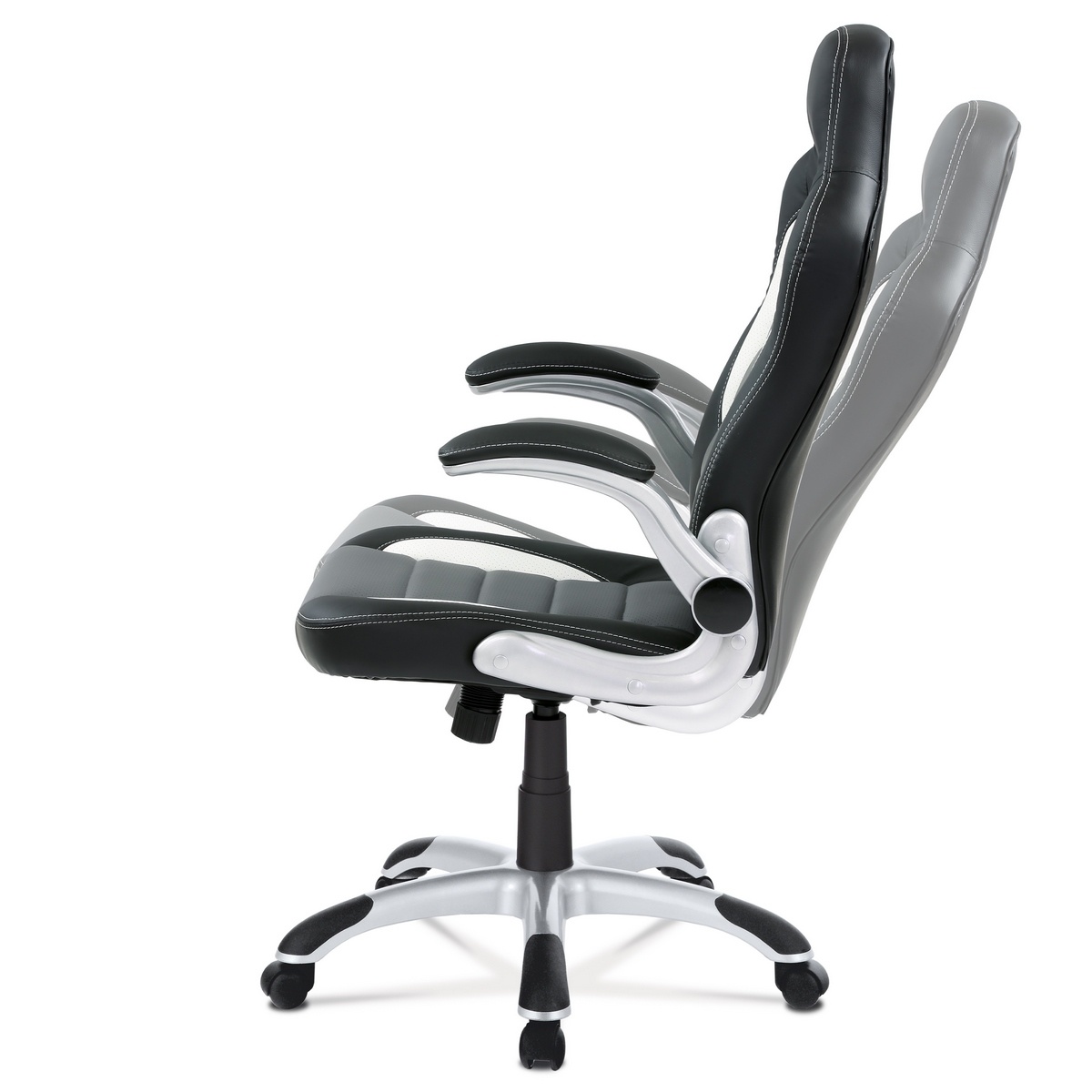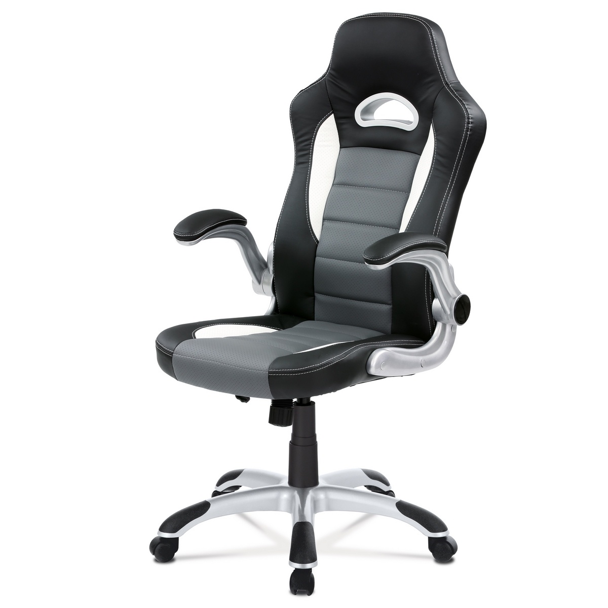 Veľmi populárny model športového kancelárskeho kresla v dizajne sedačky závodného vozidla a zaoblenými líniami. Má skvelé ergonomické rozvrhnutie. Poťah je kombináciou čiernej, bielej a sivej ekokože s bielym prešívaním. Polstrovanie je z kvalitnej PU peny je zárukou pohodlného posedenia pri herných večeroch. Ruky si môžete pohodlne položiť na odklápacie polstrované podrúčky potiahnuté čiernou ekokožou a samozrejme s bielym obšitím.Kreslo je vybavené hojdacím mechanizmom. Sila hojdania sa reguluje plastovou skrutkou pod sedákom. Výška sedenia sa upravuje páčkou na pravej strane cez kvalitný plynový piest. Masívny strieborný plastový kríž s čiernymi protišmykovými doplnkami je osadený plastovými kolieskami na koberec.