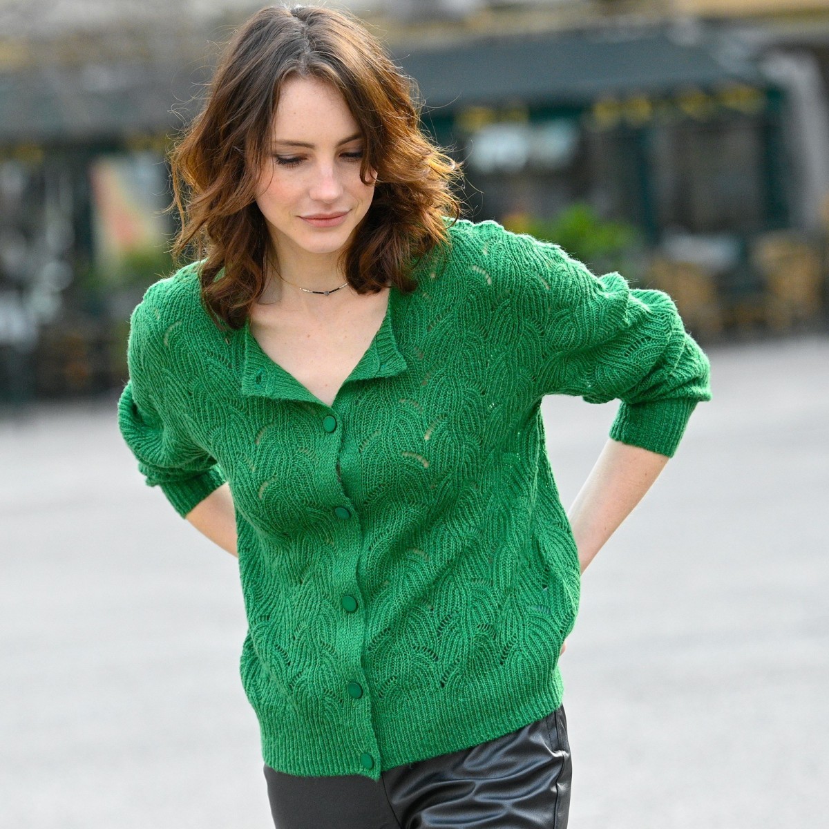 Sveter z perlového úpletu by Vám nemal chýbať. Z jemného perlového úpletu mohérového na dotyk. Moderný voľný strih. Ažúrový vzor. Okrúhly výstrih. Vpredu zapínanie na farebne zladené gombíky. Dlhé rukávy, zvesené ramená. Rovný spodný lem. Pružné zakončenie. Možno prať v práčke. Dĺžka cca 60 cm. Perlový úplet 100 % akryl.