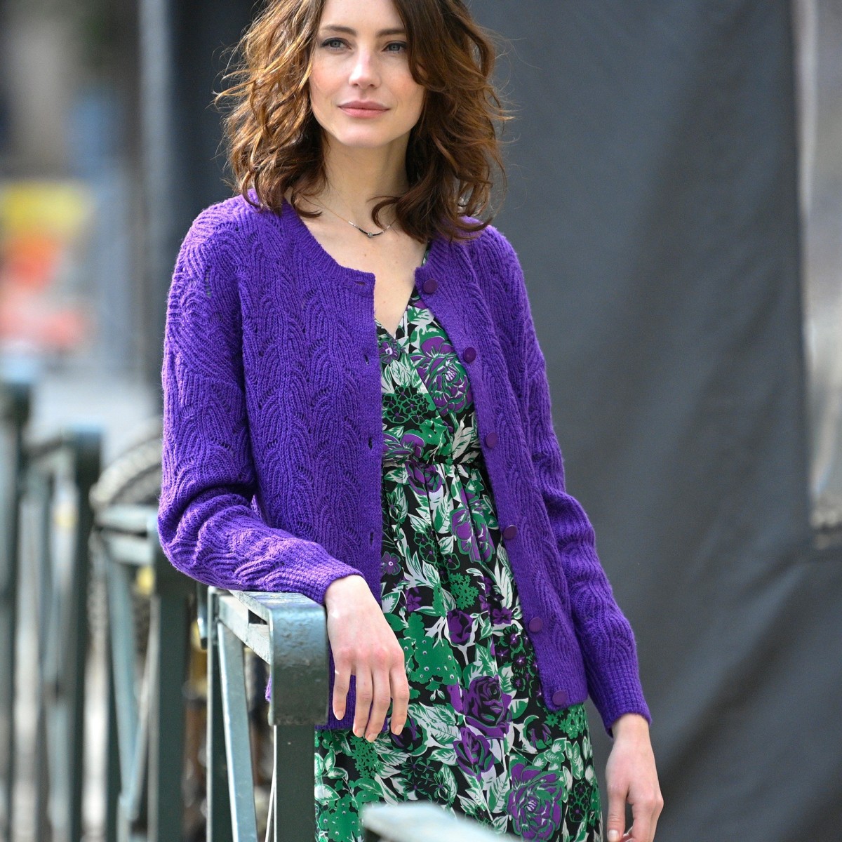 Sveter z perlového úpletu by Vám nemal chýbať. Z jemného perlového úpletu mohérového na dotyk. Moderný voľný strih. Ažúrový vzor. Okrúhly výstrih. Vpredu zapínanie na farebne zladené gombíky. Dlhé rukávy, zvesené ramená. Rovný spodný lem. …