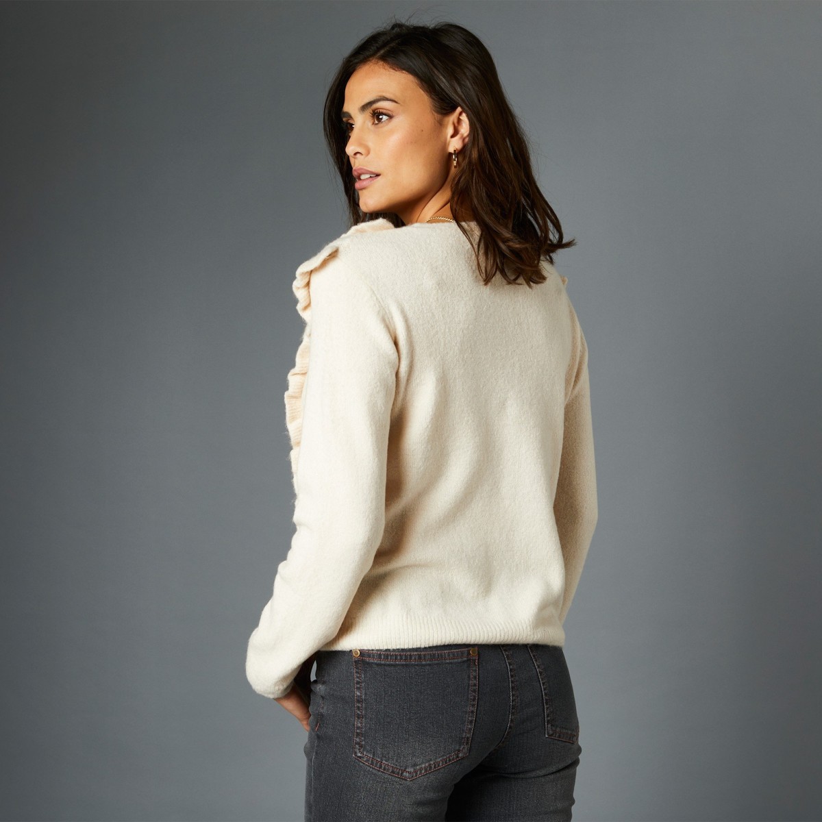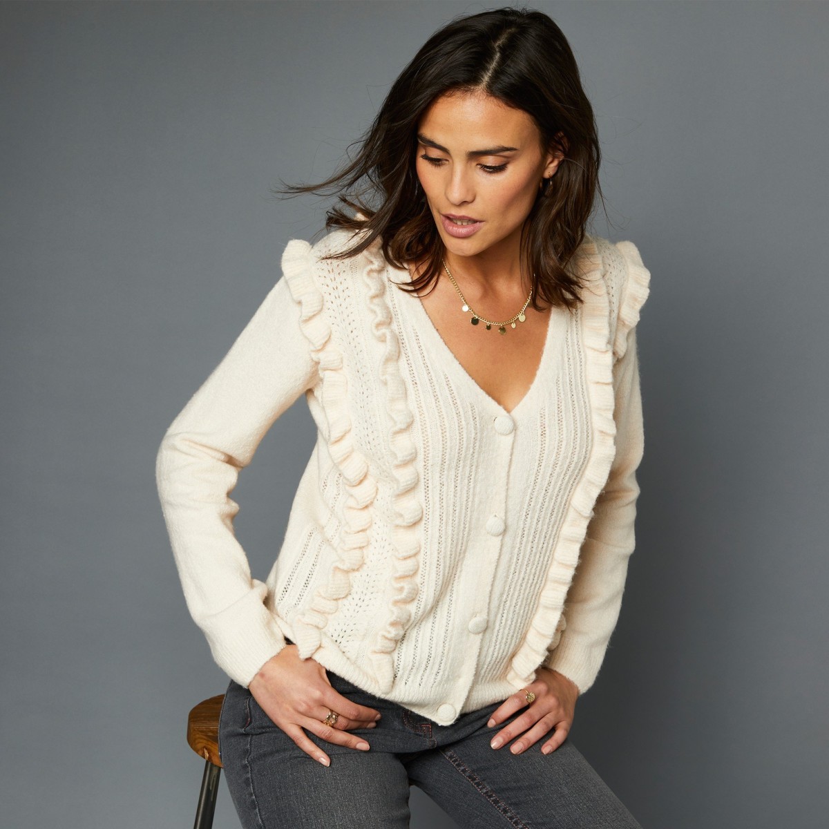 Aj Vy si zamilujte jemný ažúrový sveter s volánovým zdobením. Výstrih do V. Vpredu zapínanie na gombíky. Potiahnuté gombíky. Dlhé rukávy. Predný diel s ažúrovým vzorom. Vpredu volány. Rovný spodný lem. Z jemného mäkkého džerseja. Možno prať v práčke. Dĺžka cca 59 cm. Džersej 76 % akryl, 21 % polyamid, 3 % elastan.